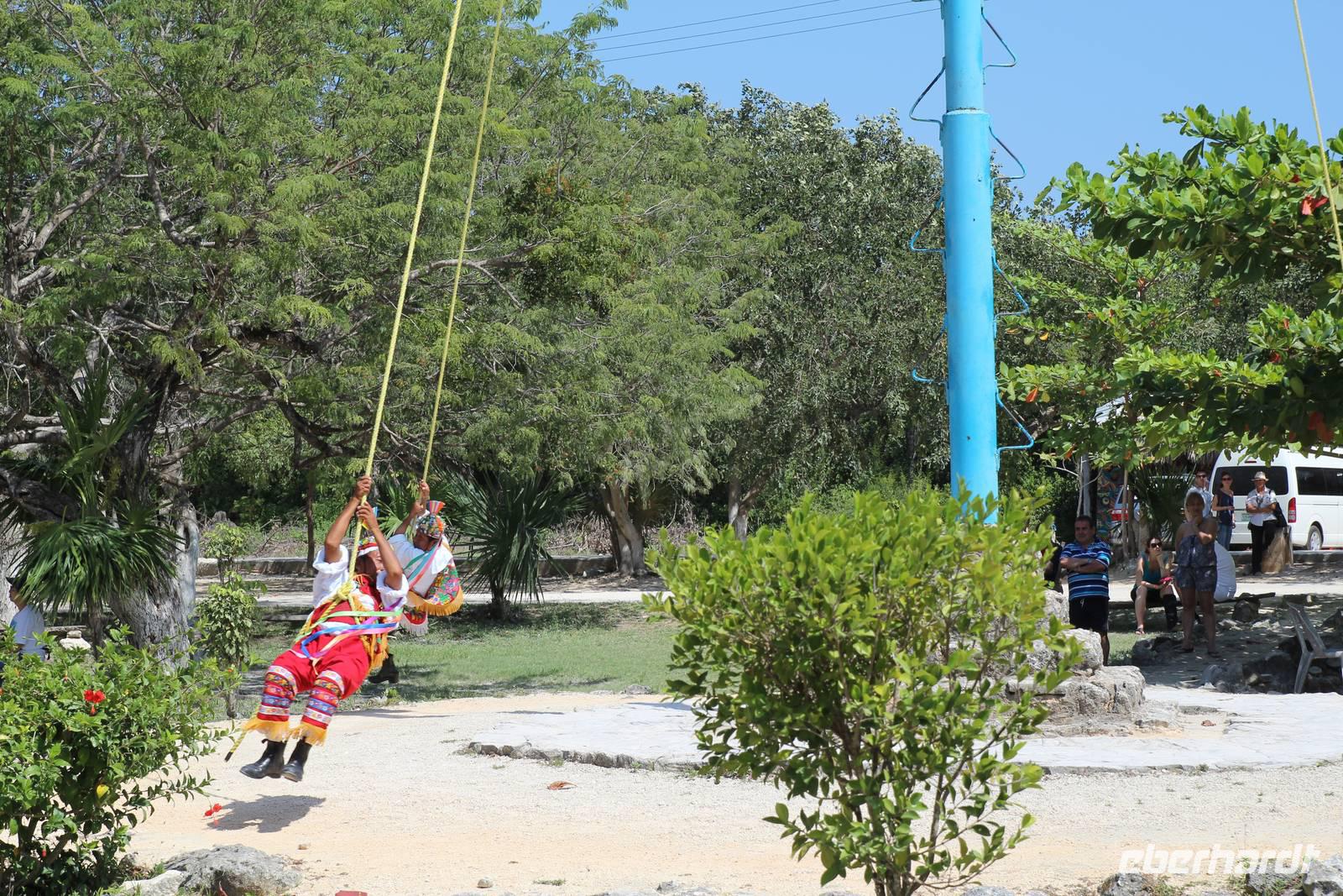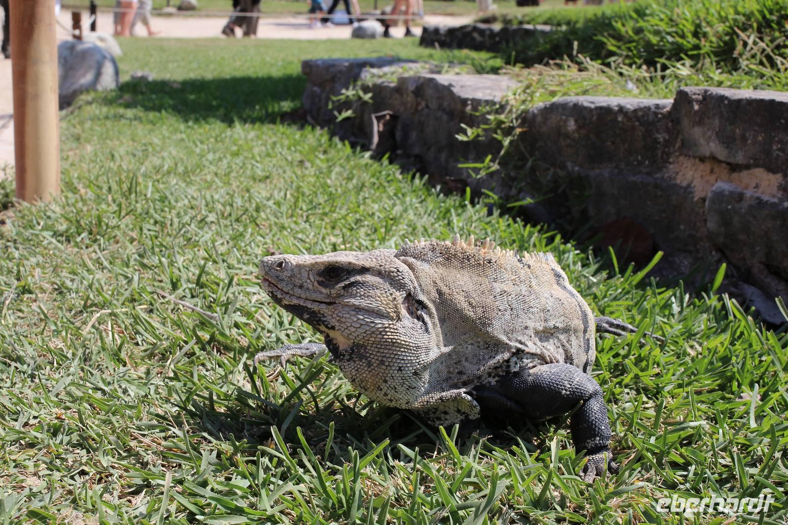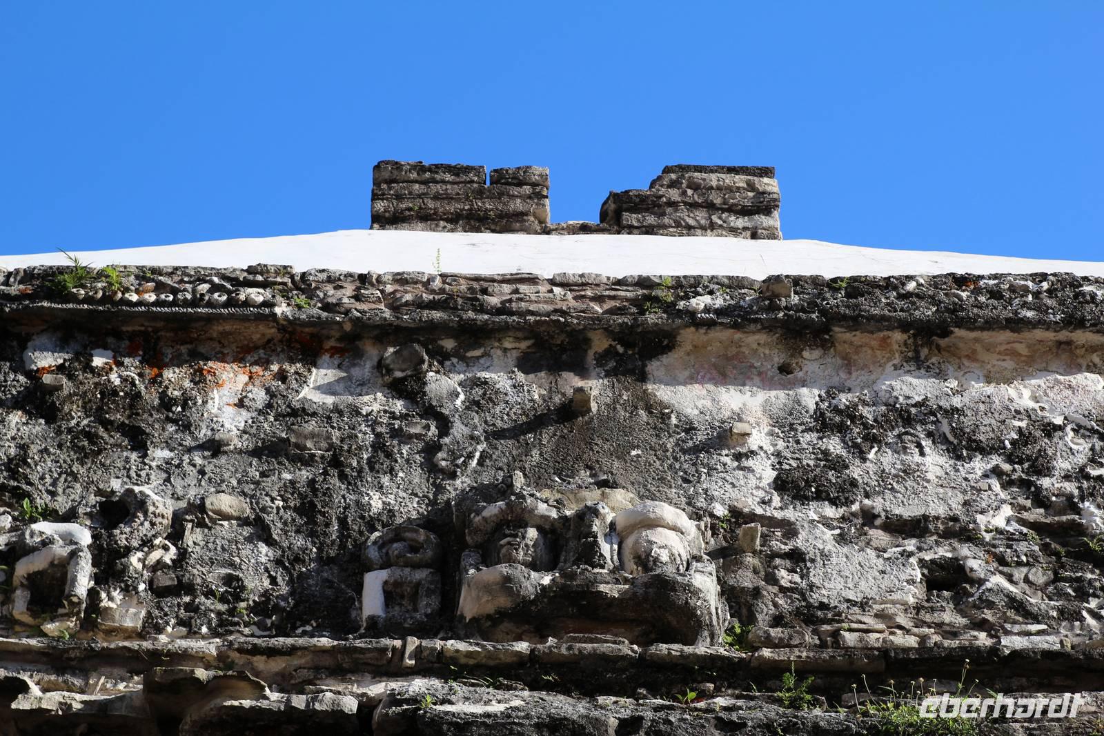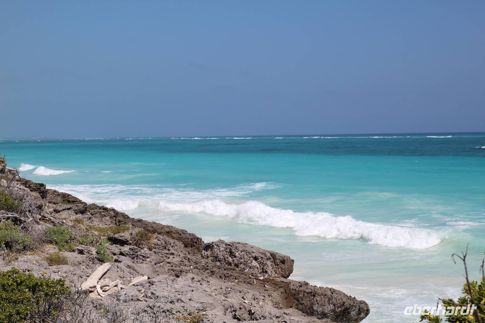 Unser letzter Tag der Rundreise war nun bereits gekommen. Aufgrund der bekannten und steten Pünktlichkeit unserer Gruppe, war es möglich einen weiteren kleinen zusätzlichen Halt zu machen: Wir besuchten den Ort Villadoid bevor es nach Tulum weiter ging. Um die „verlorene" Zeit wieder aufzuholen entschieden wir uns, den Weg vom Busparkplatz bis zur Ausgrabungs-Anlage von Tulum mit der Bimmelbahn zurück zu legen - Eberhardt bezahlte natürlich. In Tulum trafen wir dann auch schon auf die ersten Karibik-Urlauber, die sich wohl weniger an den Bauwerken, sondern vielmehr für das Wasser interessierten. Das blaue Meer bot uns aber wundervolle Motive, einige wären auch gern schon ins Wasser gesprungen, aber das ist hier nicht ganz so ungefährlich. Auch hatten wir ja den späteren und den morgigen Tag ausreichend Zeit das nachzuholen. Auf der Anlage hatten wir uns dann vor lauter Träumerei etwas verloren - wir bildeten nun zwei Grüppchen, fanden uns aber am besprochenen Treffpunkt alle wieder zusammen.