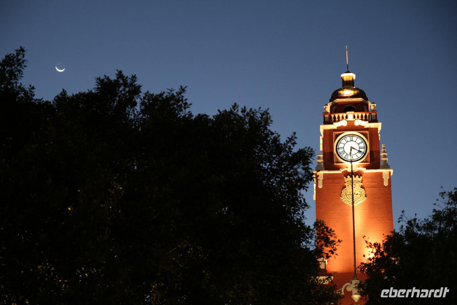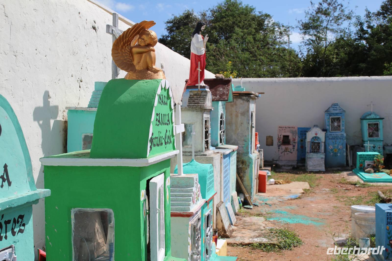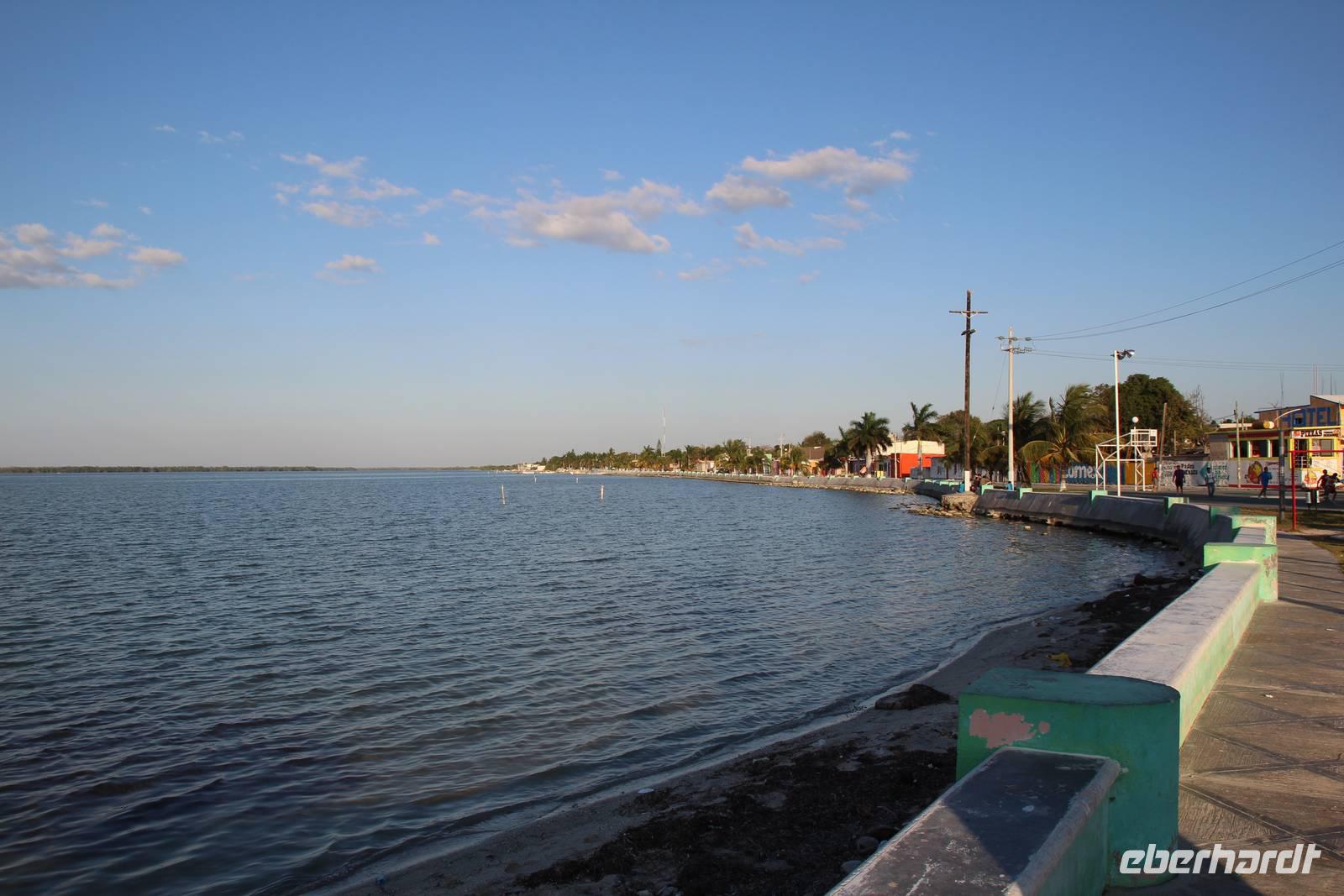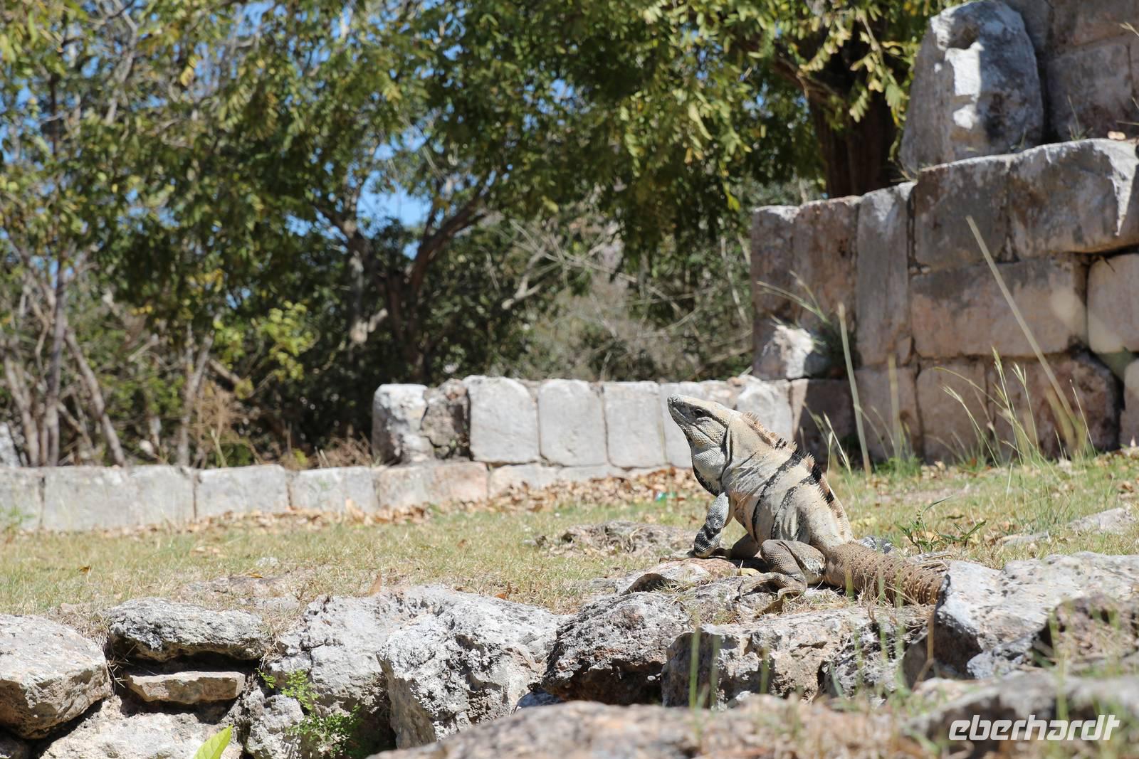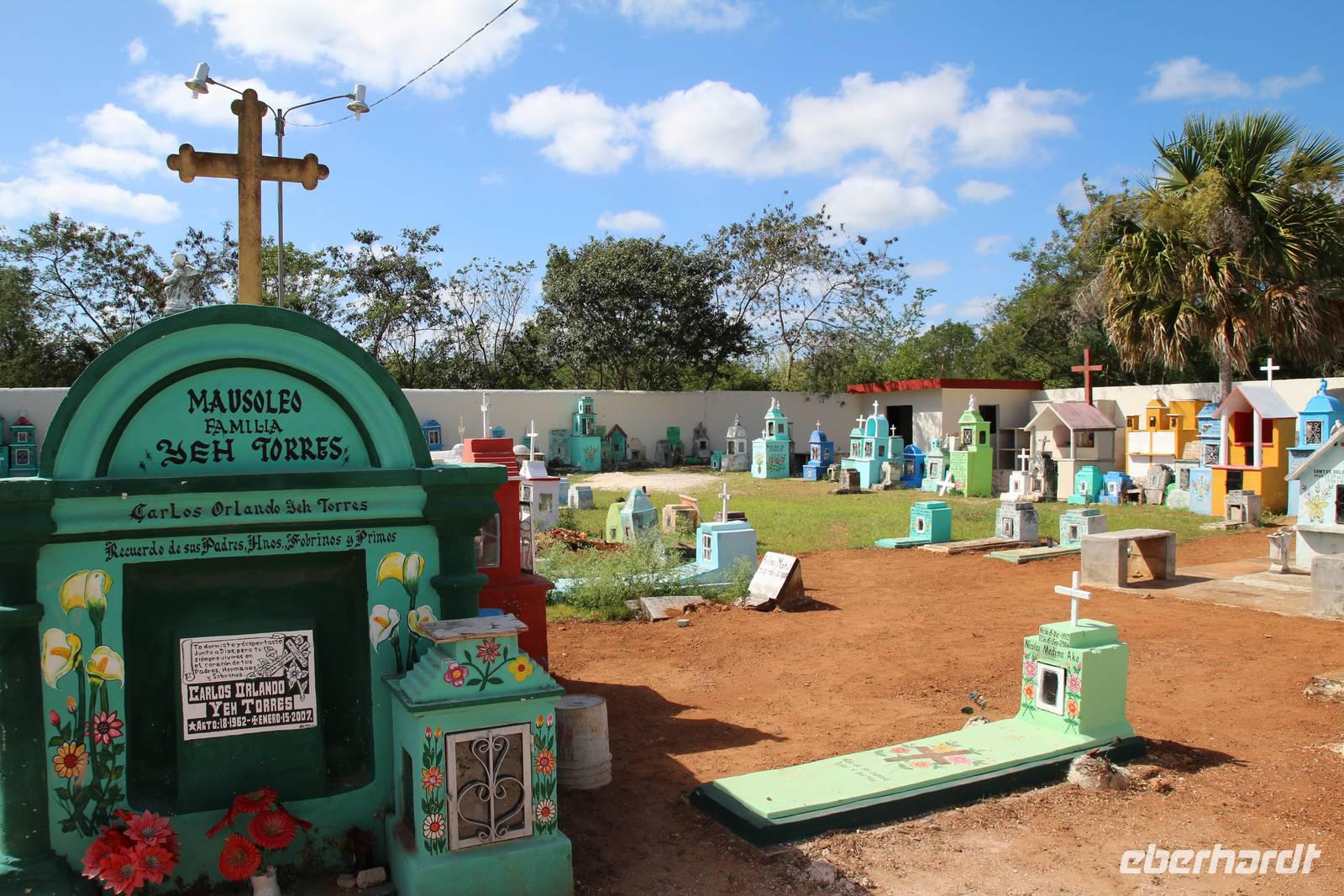 Jetzt hatten wir unser Essen wahrlich verdient, nach einer Brokkoli-Suppe durften wir uns am Buffet stärken für die weitere Fahrt. Beim Verlassen des Hotels entdeckten wir noch so einige Leguane, die uns als Fotomotive herhielten. Den Nachmittag verbrachten wir dann leider wieder im Bus, es standen immerhin nahezu 400 Kilometer bis Campeche an. Bei einem kleinen Zwischenstopp an einem Friedhof wurde uns von Ruth erklärt, wie auf Yukatan traditionell bestattet wird. Campeche erreichten wir dann in der Abenddämmerung, so dass wir zumindest noch ein paar schöne Fotos schießen konnten.