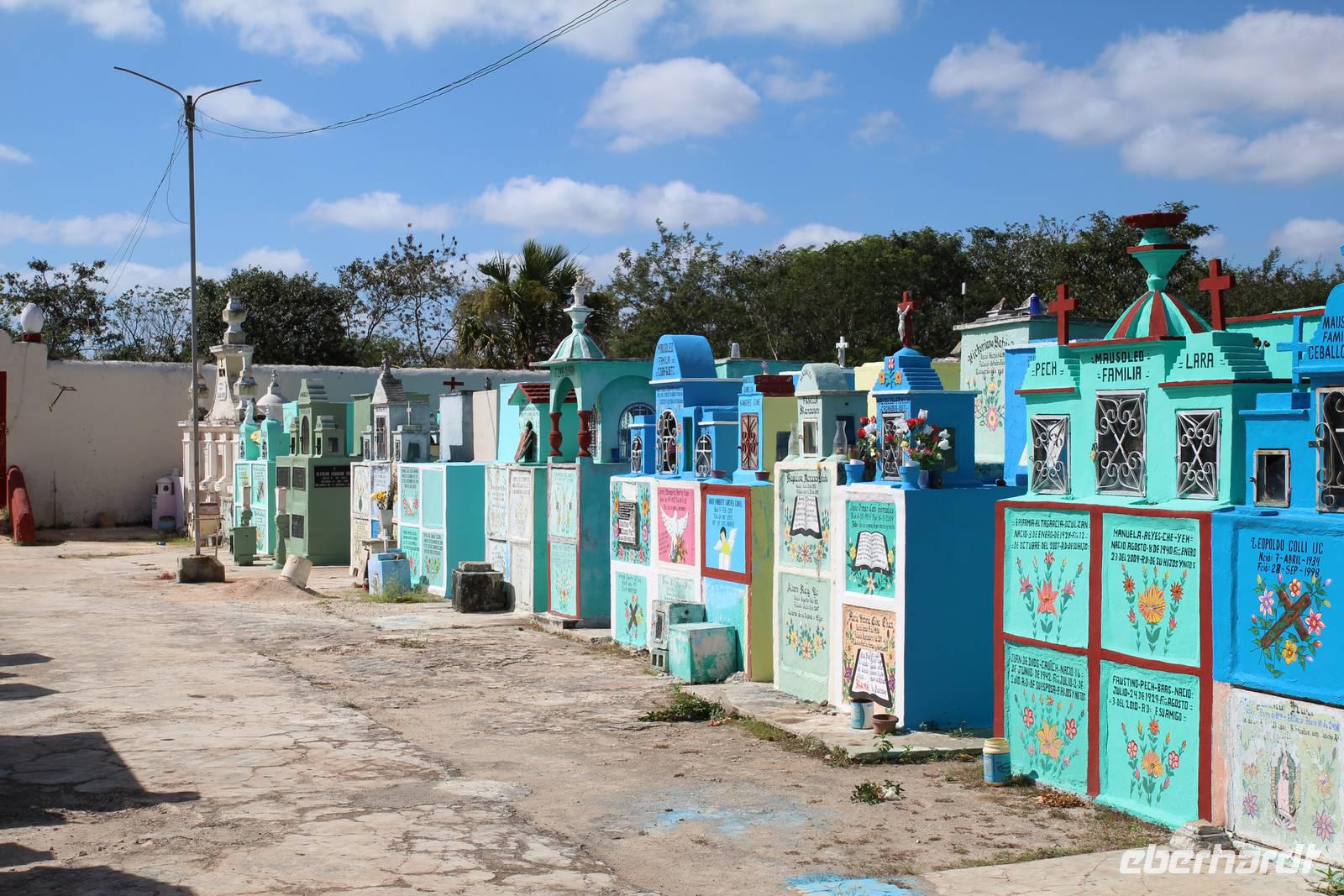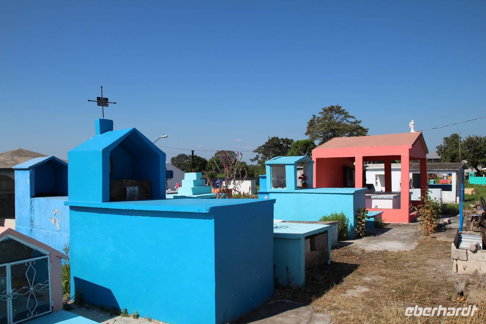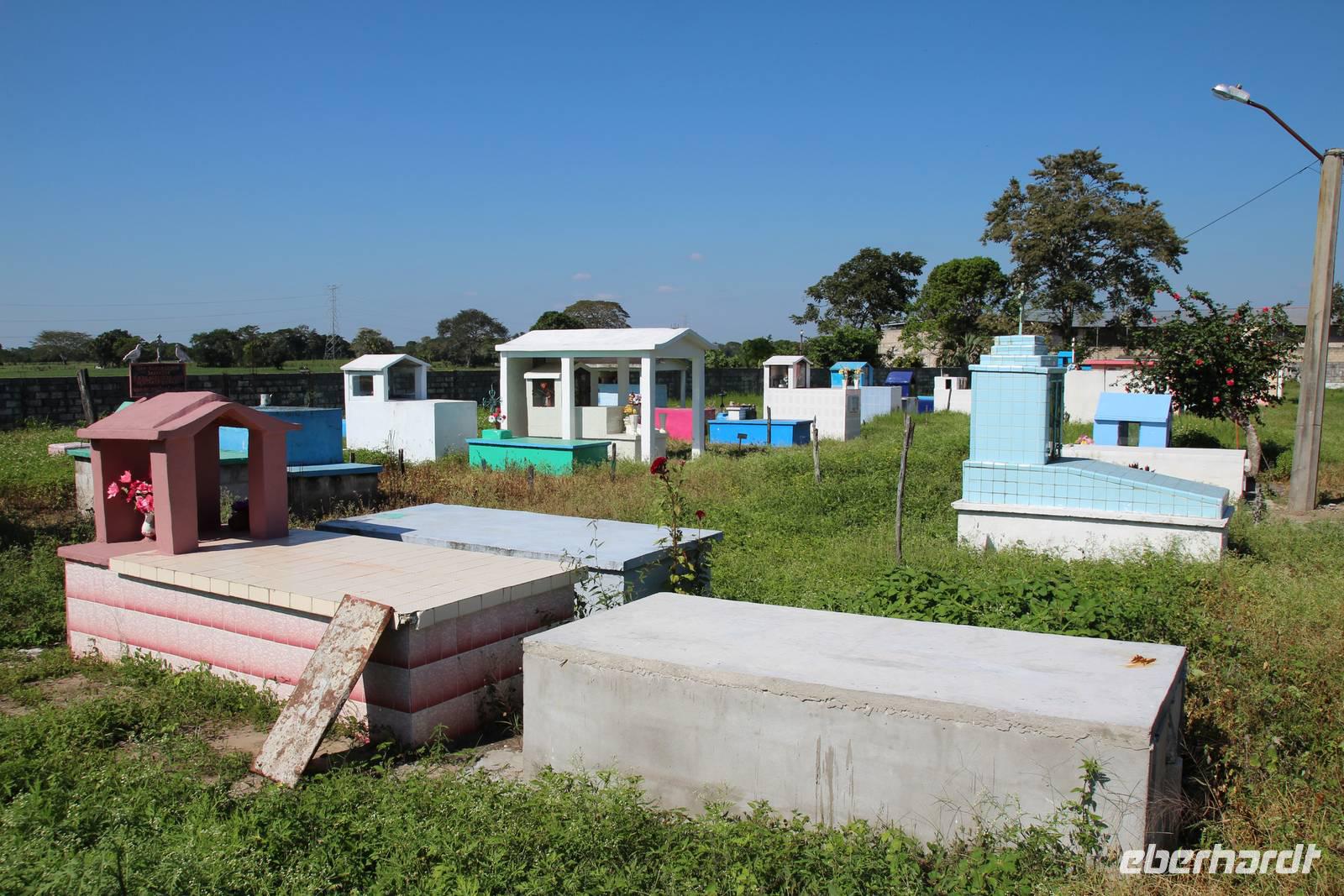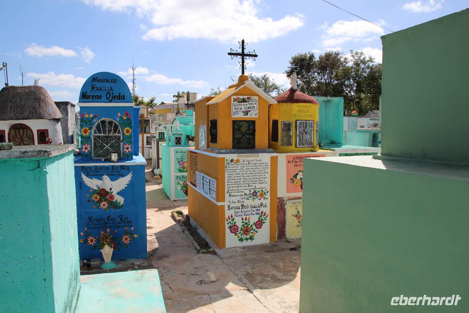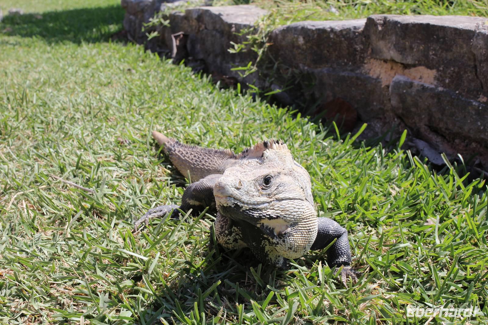 Jetzt hatten wir unser Essen wahrlich verdient, nach einer Brokkoli-Suppe durften wir uns am Buffet stärken für die weitere Fahrt. Beim Verlassen des Hotels entdeckten wir noch so einige Leguane, die uns als Fotomotive herhielten. Den Nachmittag verbrachten wir dann leider wieder im Bus, es standen immerhin nahezu 400 Kilometer bis Campeche an. Bei einem kleinen Zwischenstopp an einem Friedhof wurde uns von Ruth erklärt, wie auf Yukatan traditionell bestattet wird. Campeche erreichten wir dann in der Abenddämmerung, so dass wir zumindest noch ein paar schöne Fotos schießen konnten.