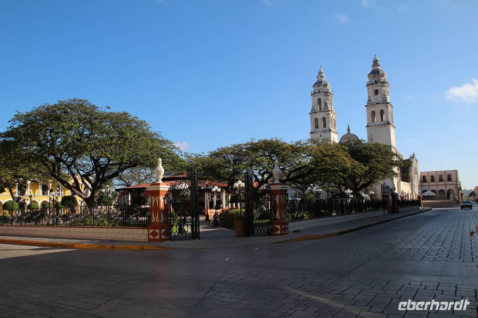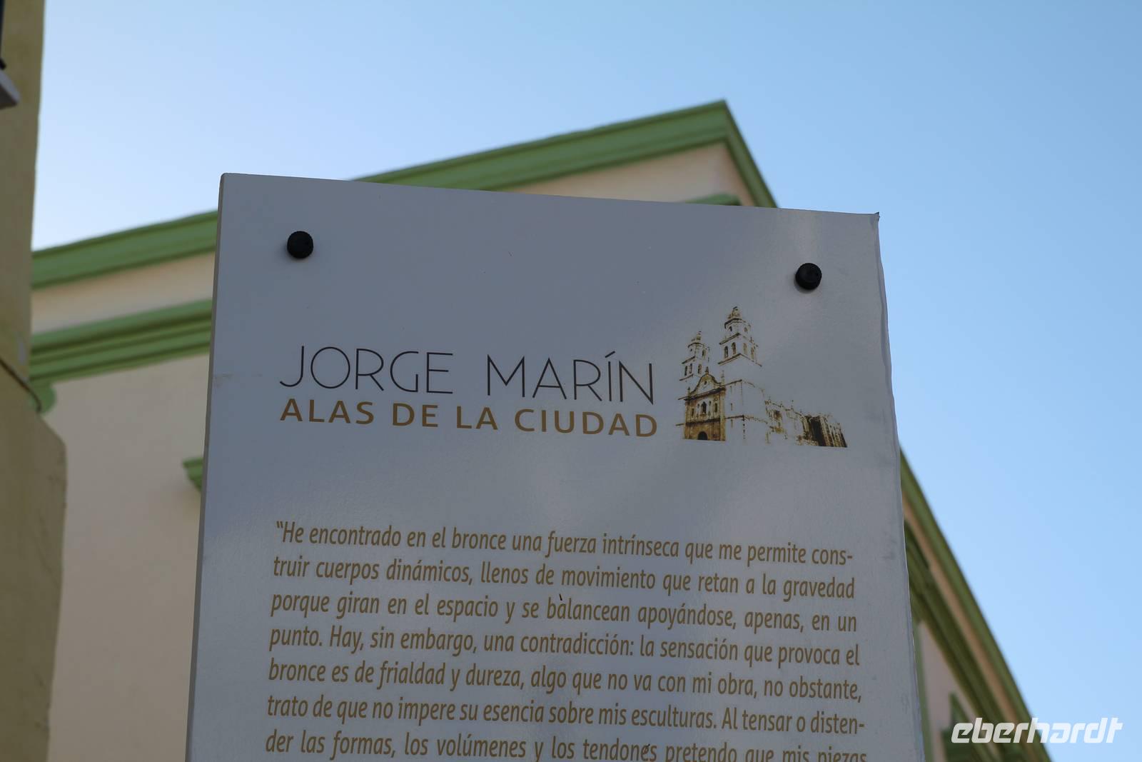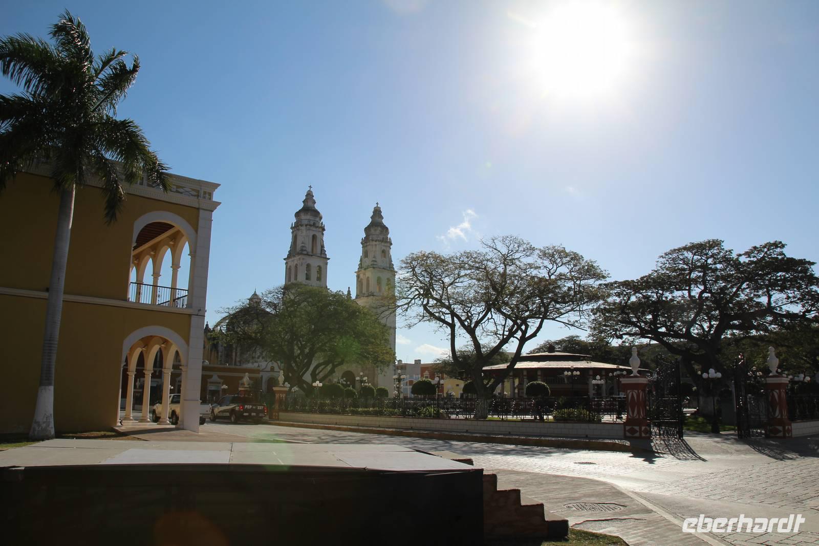 Da wir am vorhergehenden Abend erst spät Campeche erreichten, starteten wir den Tag zunächst mit einem kleinen Stadtrundgang. Wir bestaunten dabei einige Kunstwerke von Jorge Marín, den Zócalo mit der Bibliothek und der Kathedrale und auch die verschiedenen Figuren, die die Stadtgeschichte ein wenig darstellten.