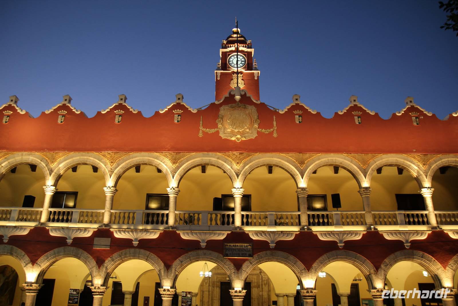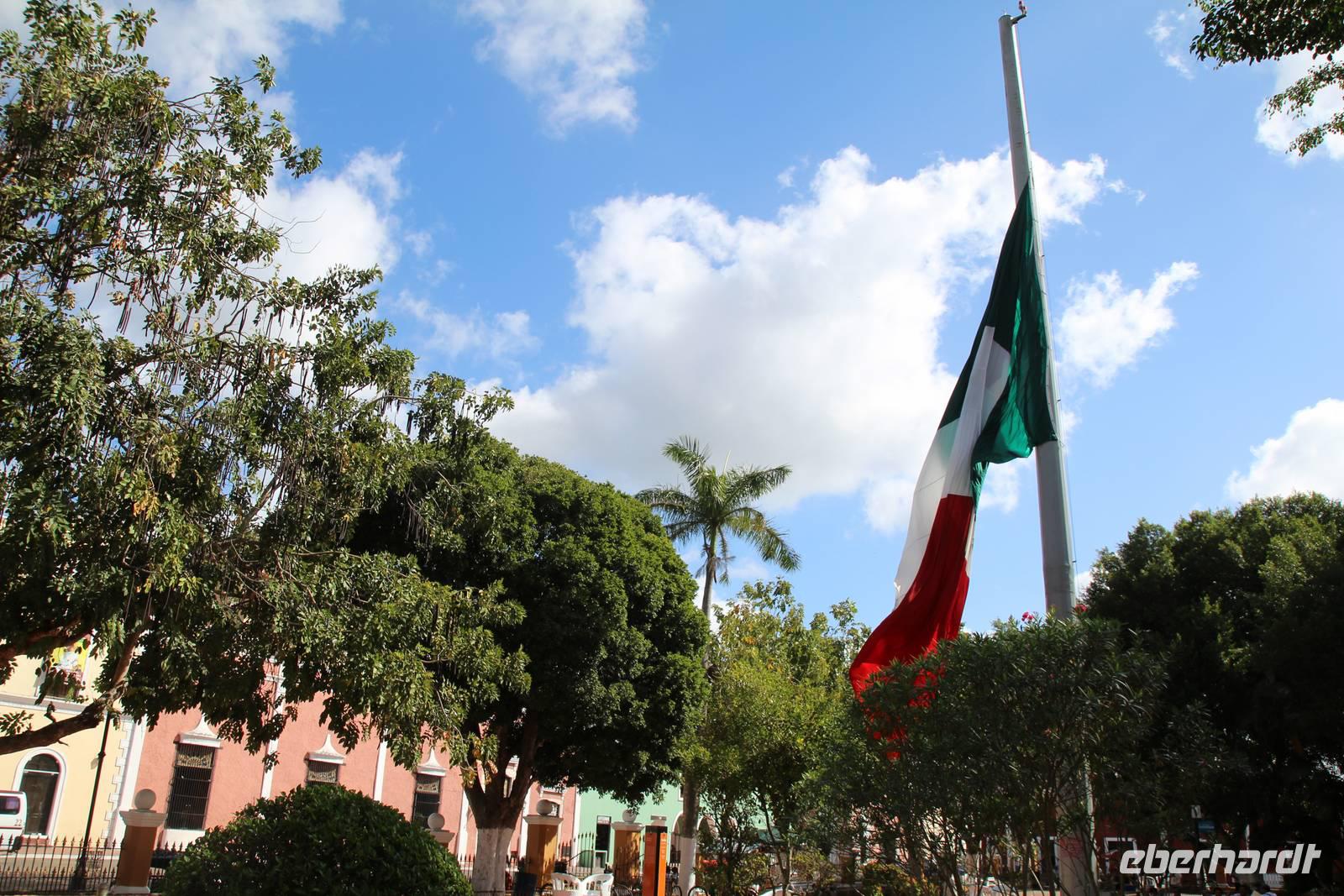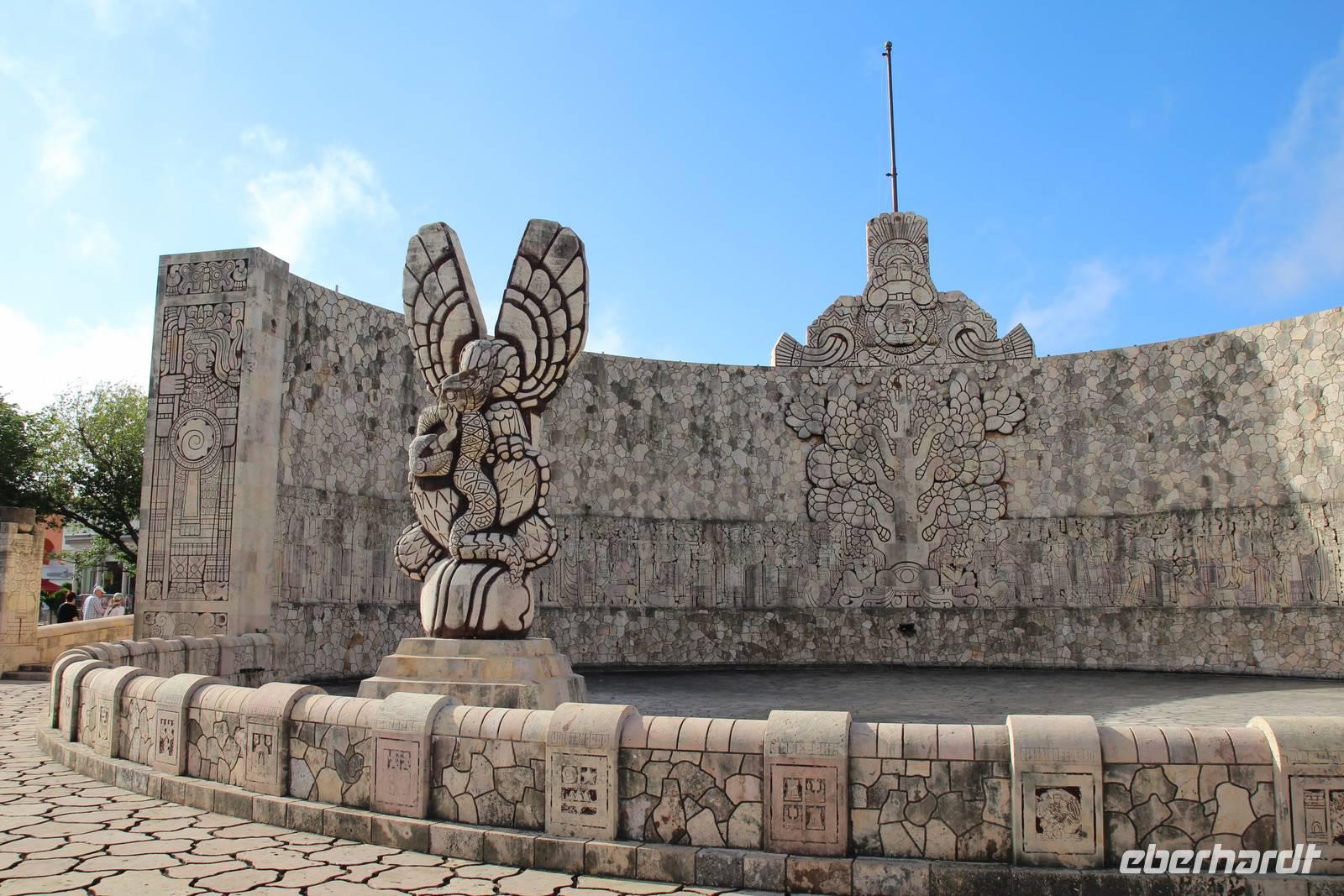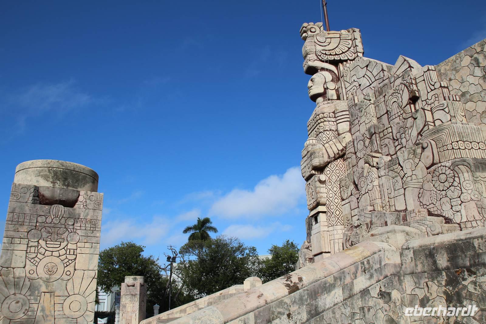 Bevor es mit dem Bus weitergehen sollte, stoppten wir kurz in Merida am Rathaus. Gestern Abend war es uns nämlich vergönnt, einen Blick vom Rathausbalkon auf den Zócalo zu werfen, aber diesmal hatten wir mehr Glück und konnten auch einen kurzen Rundgang im Rathaus machen. Bei der Ausfahrt aus Merida hielten wir dann auch noch am Denkmal entlang der Prachtstraße Paseo De Montejo. Ein örtlicher Polizist war uns dabei behilflich die stark befahrene Straße zu überqueren, was sogar ohne lautstarkes Hupen von statten ging.