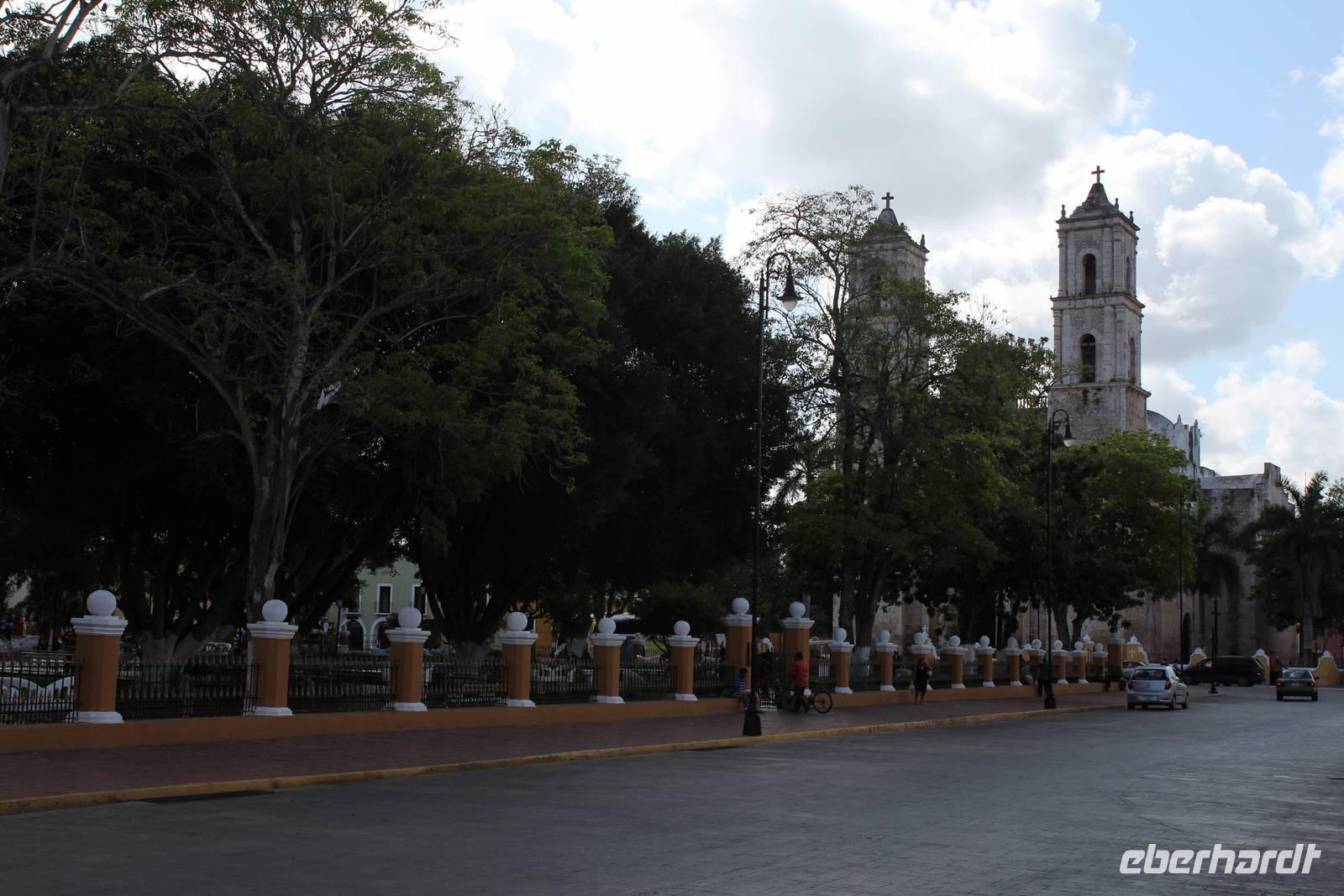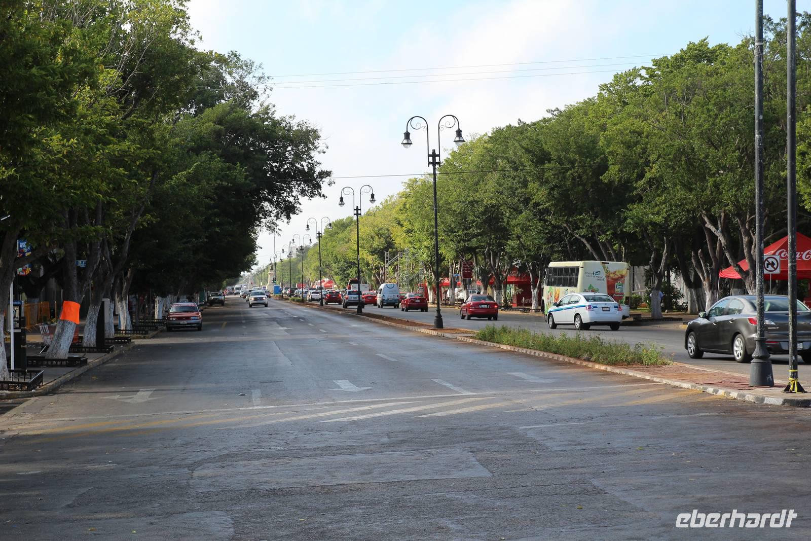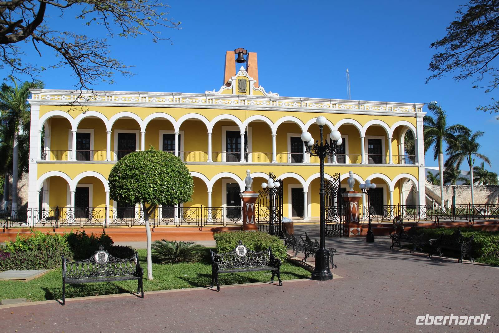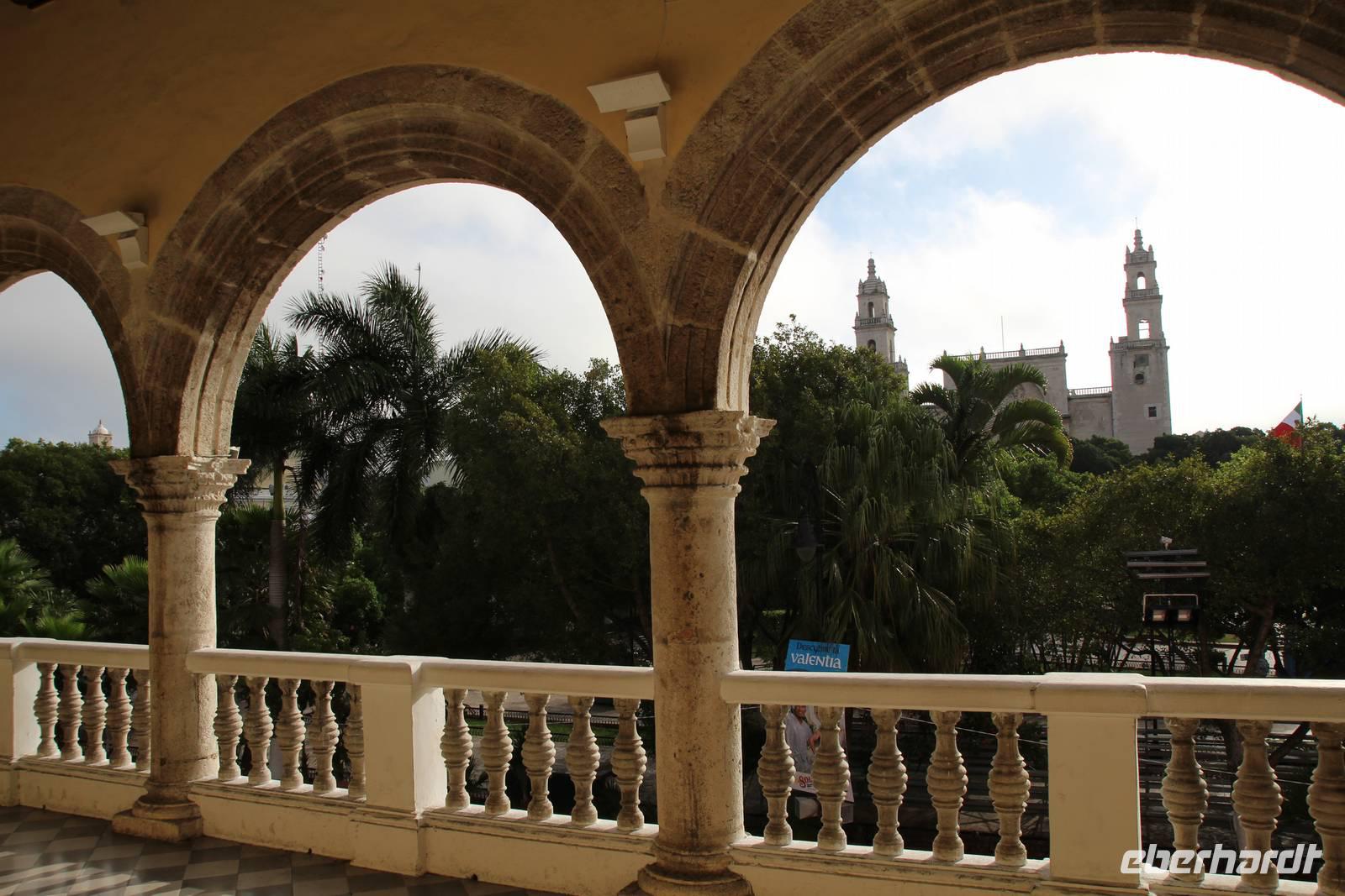 Bevor es mit dem Bus weitergehen sollte, stoppten wir kurz in Merida am Rathaus. Gestern Abend war es uns nämlich vergönnt, einen Blick vom Rathausbalkon auf den Zócalo zu werfen, aber diesmal hatten wir mehr Glück und konnten auch einen kurzen Rundgang im Rathaus machen. Bei der Ausfahrt aus Merida hielten wir dann auch noch am Denkmal entlang der Prachtstraße Paseo De Montejo. Ein örtlicher Polizist war uns dabei behilflich die stark befahrene Straße zu überqueren, was sogar ohne lautstarkes Hupen von statten ging.