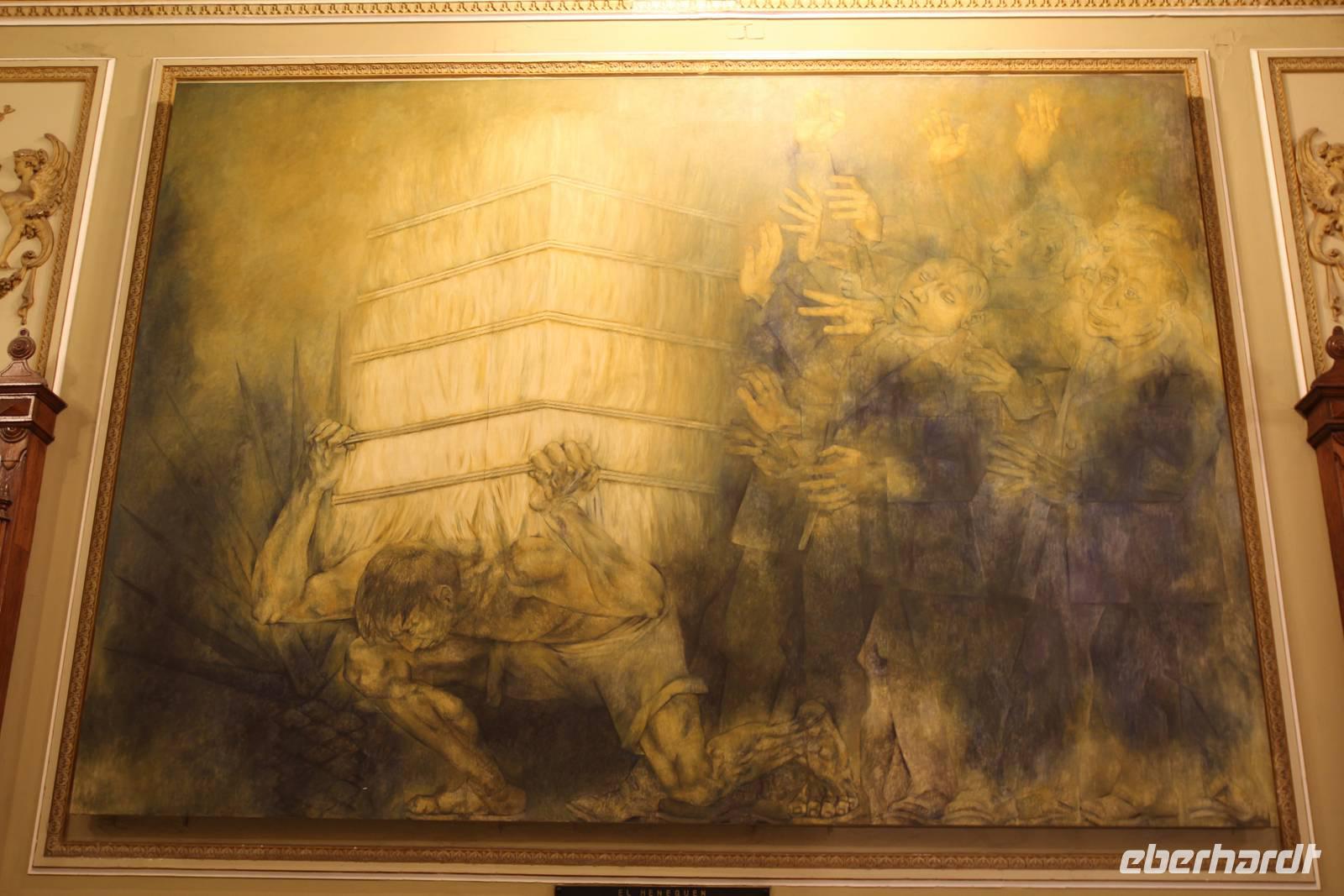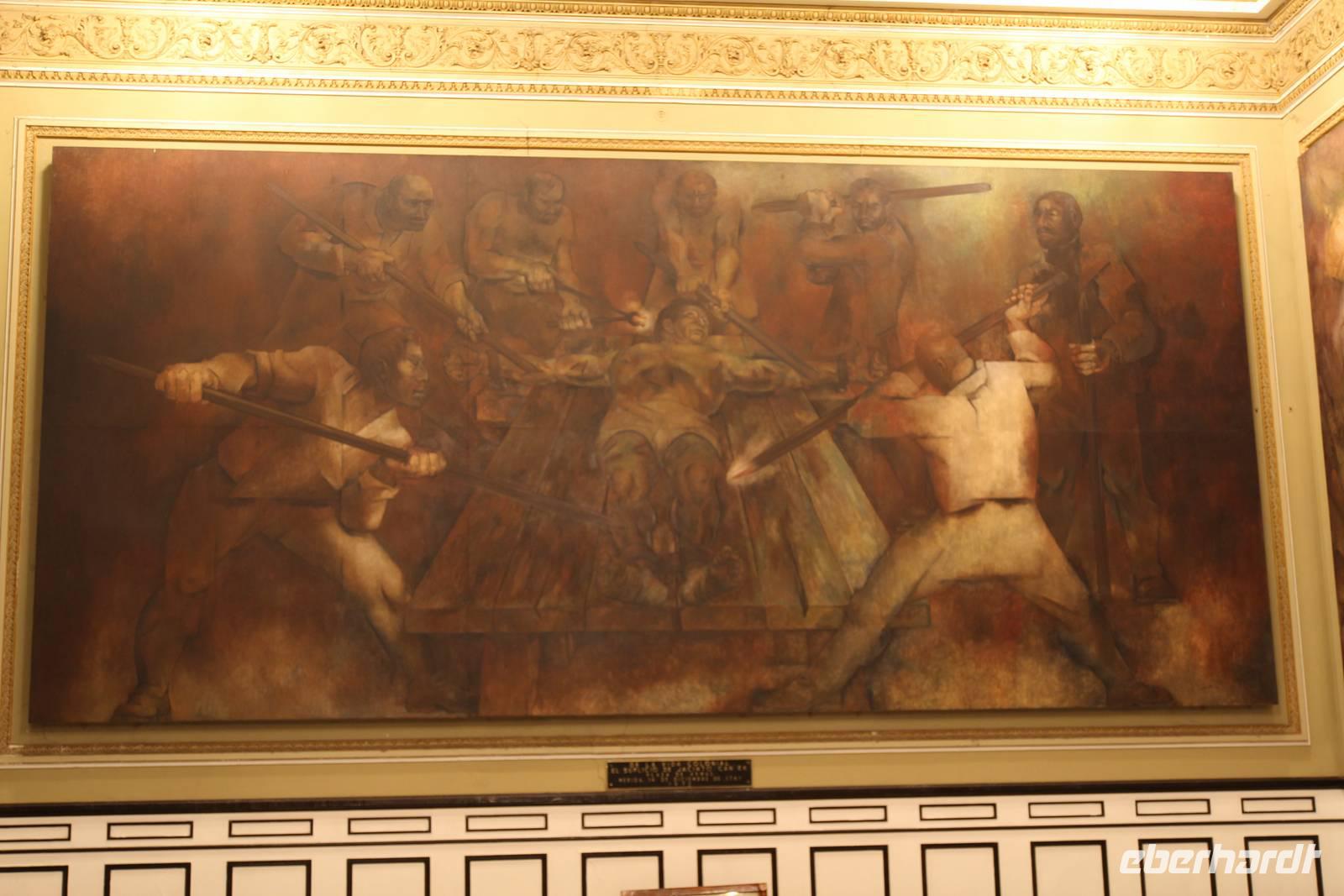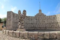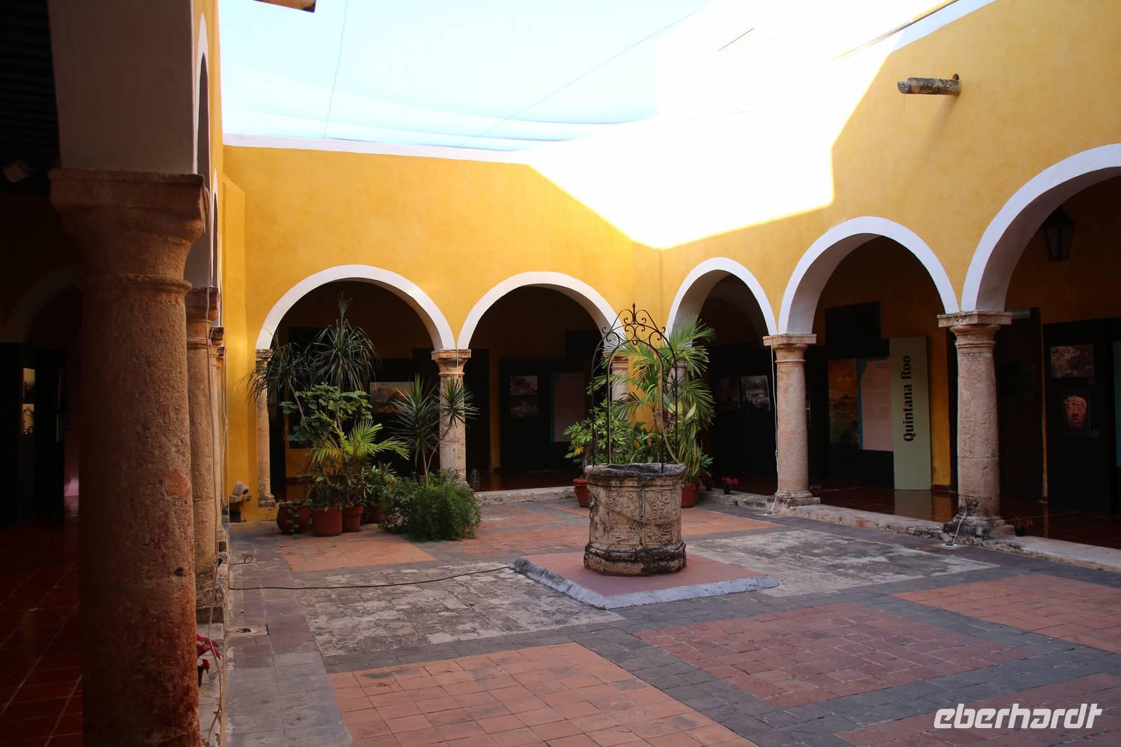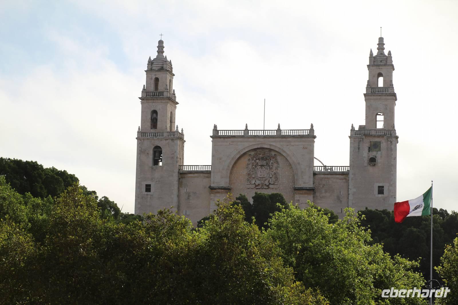 Bevor es mit dem Bus weitergehen sollte, stoppten wir kurz in Merida am Rathaus. Gestern Abend war es uns nämlich vergönnt, einen Blick vom Rathausbalkon auf den Zócalo zu werfen, aber diesmal hatten wir mehr Glück und konnten auch einen kurzen Rundgang im Rathaus machen. Bei der Ausfahrt aus Merida hielten wir dann auch noch am Denkmal entlang der Prachtstraße Paseo De Montejo. Ein örtlicher Polizist war uns dabei behilflich die stark befahrene Straße zu überqueren, was sogar ohne lautstarkes Hupen von statten ging.