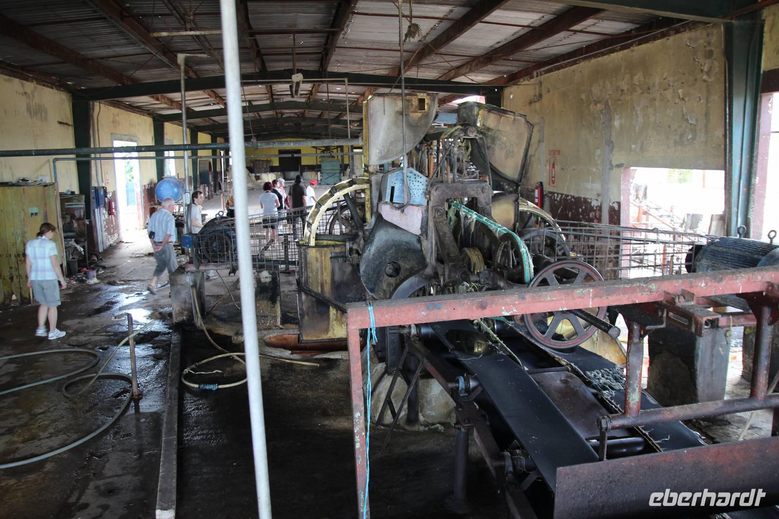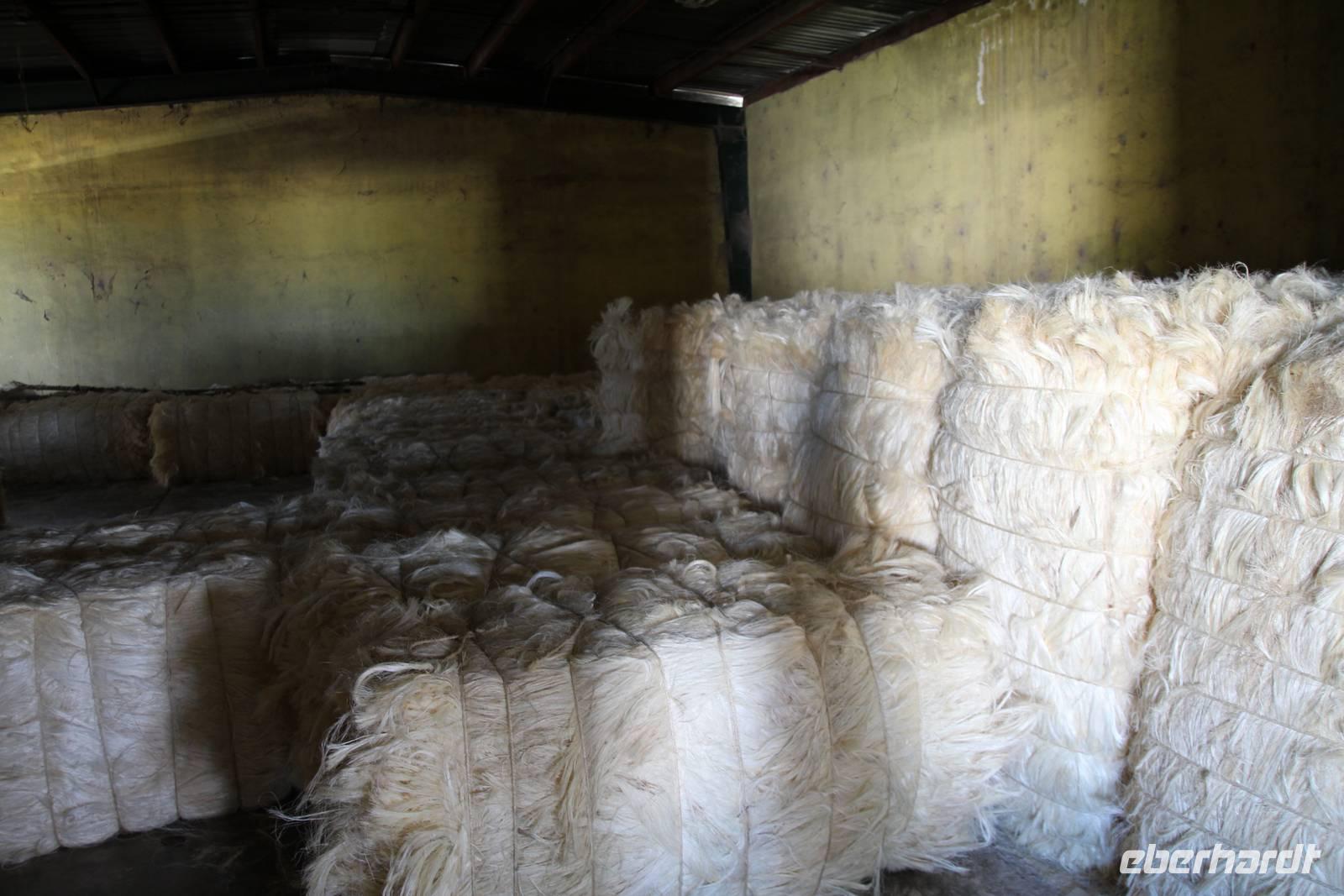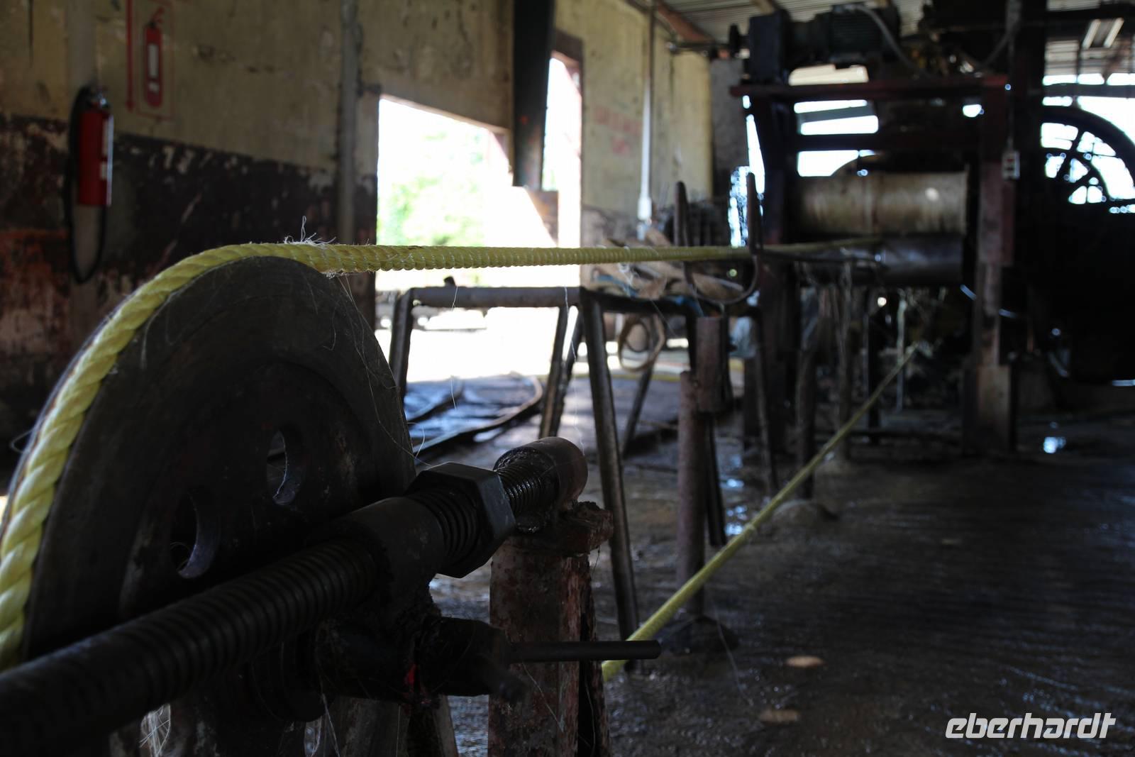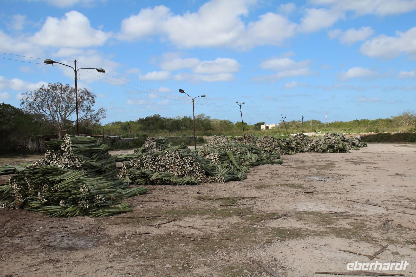 In Tehmak erlebten wir dann wohl die Karneval-Nachwehen der Mexikaner. Eigentlich wollten wir einer Sisal-Fabrik einen Besuch abstatten. Die Bänder der Anlage standen aber still und kein Arbeiter war zu sehen. Nur eine verschlafene Person kam an und wir durften uns das Gelände zumindest mal anschauen. Die Maschinen waren wahrscheinlich schon bereit fürs Museum, aber die Anlage soll wohl noch funktionieren, wo aber die anderen Arbeiter sind, darauf konnte uns der liebe Mexikaner auch keine Auskunft geben. Ebenso scheiterte er daran, wie man aus dem Sisal einen Strick herstellen kann - er habe es „gerade vergessen". Wir mussten lachen und probierten es einfach selbst, mit deutlich mehr Erfolg als er.