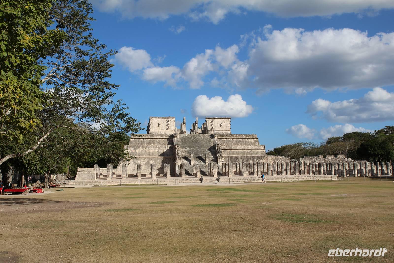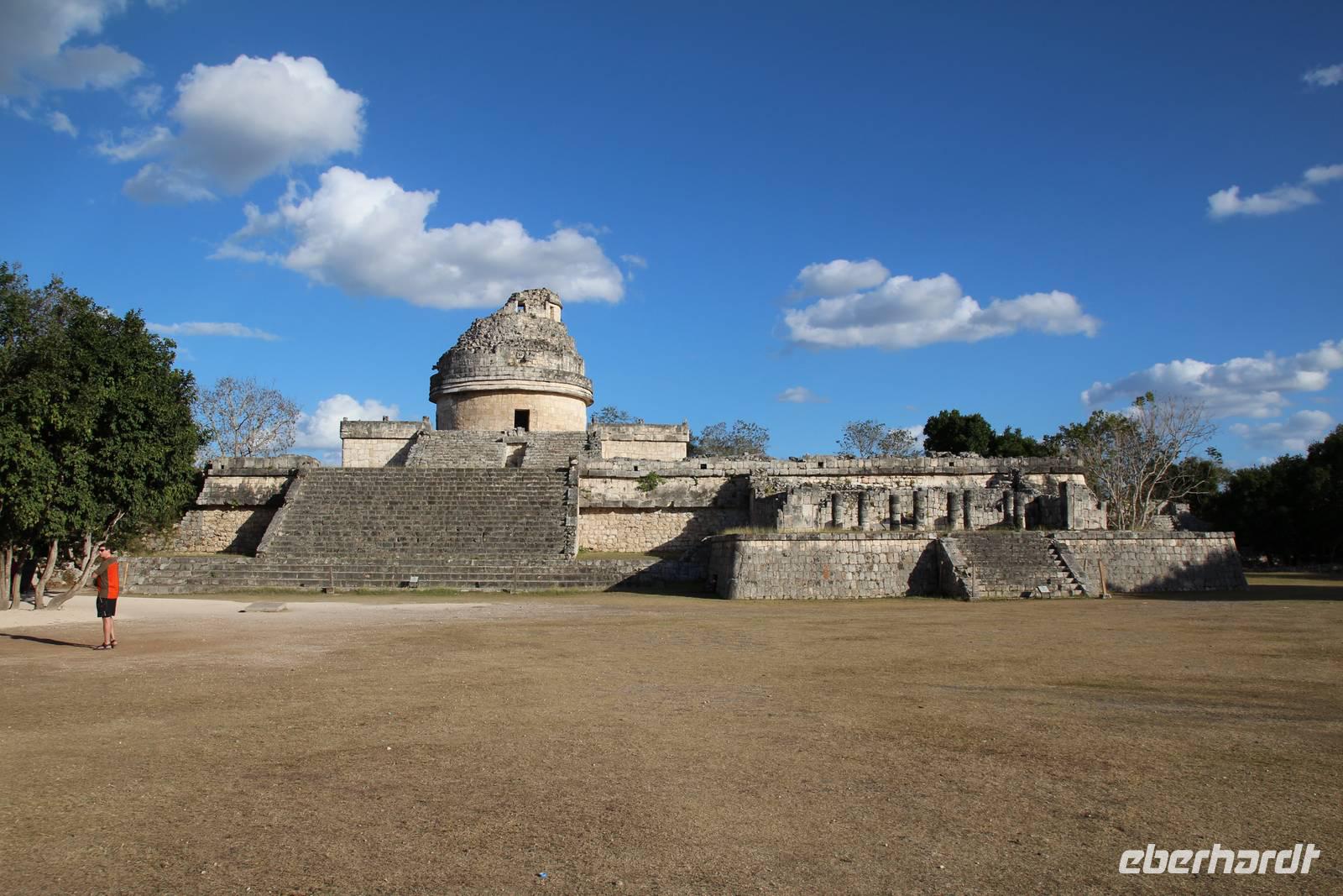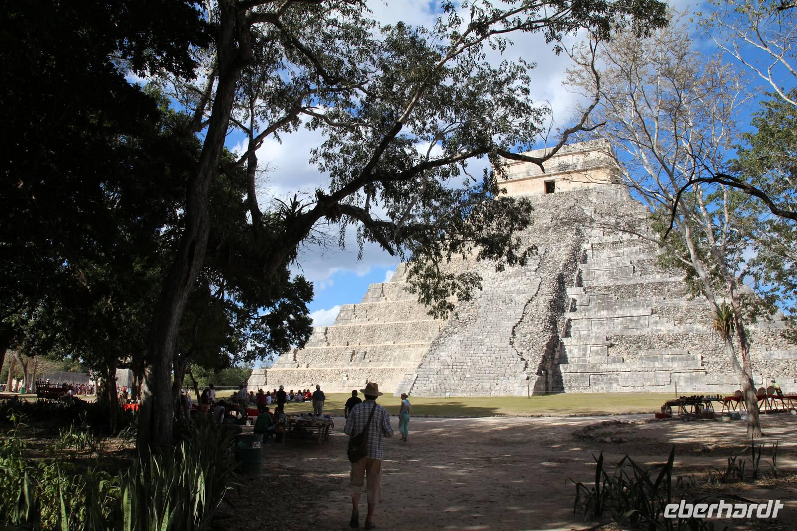 Zur Mittagspause erreichten wir auch schon unsere Hotelanlage Mayaland, die direkt neben Chichén Itzá liegt. Nach einer Stärkung ging es auf Erkundungstour. Wir merkten recht schnell, dass wir nun an der bekanntesten Ruinenstätte waren, denn es waren allerhand Touristengruppen unterwegs, so dass kaum ein Foto ohne Mensch möglich war. Auch die Händler hatten hier schon einen eigenen Bereich bekommen. Interessant war, dass die Pyramide des Kukulcán schon nach astrologischen Gesichtspunkten errichtet wurde. Exakt 365 Stufen hatte die Pyramide und diese bildeten zweimal im Jahr ein interessantes Schattenspiel. Denn immer wenn die Sonne genau über dem Äquator steht, bilden die Schatten der Stufe eine Schlangendarstellung.