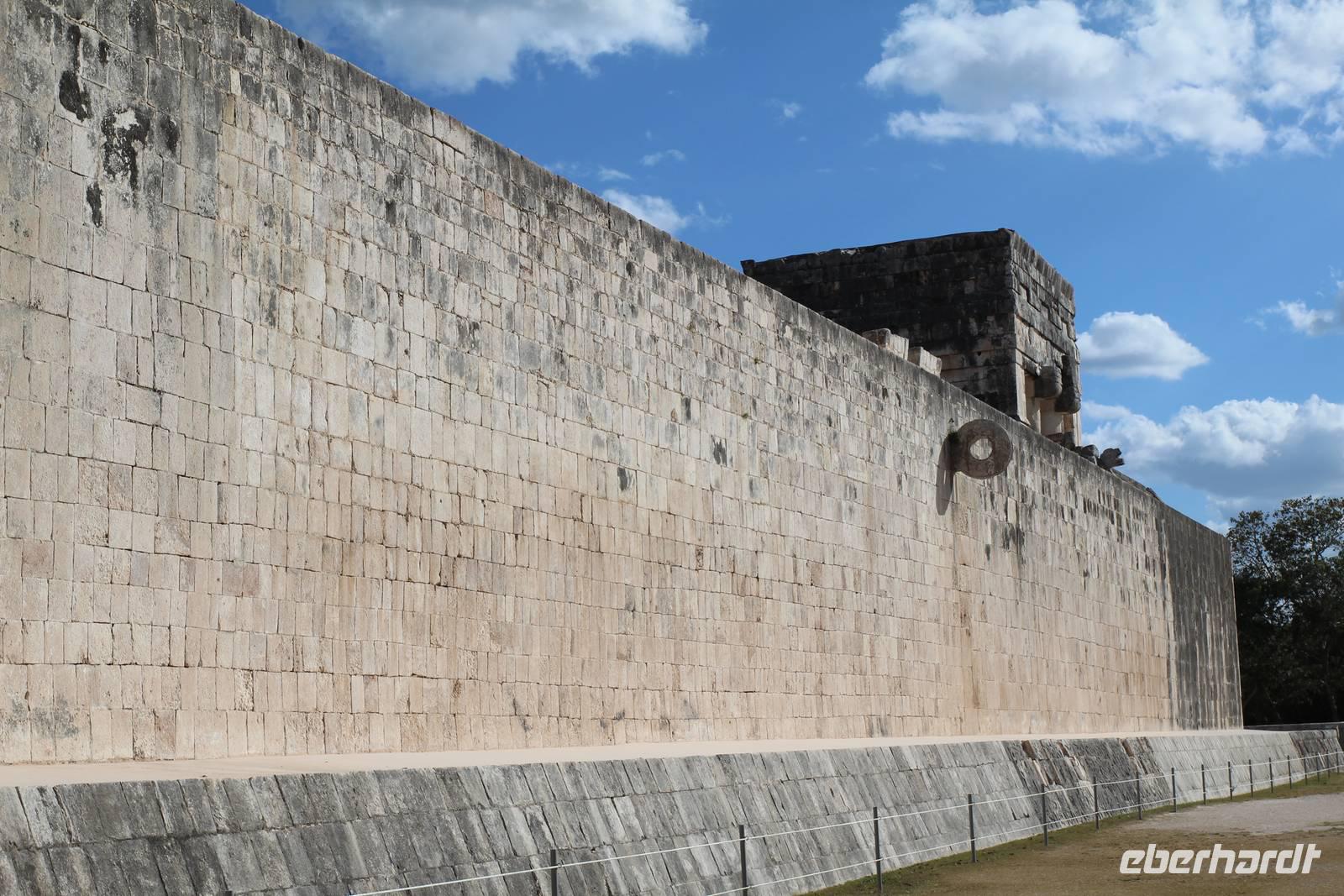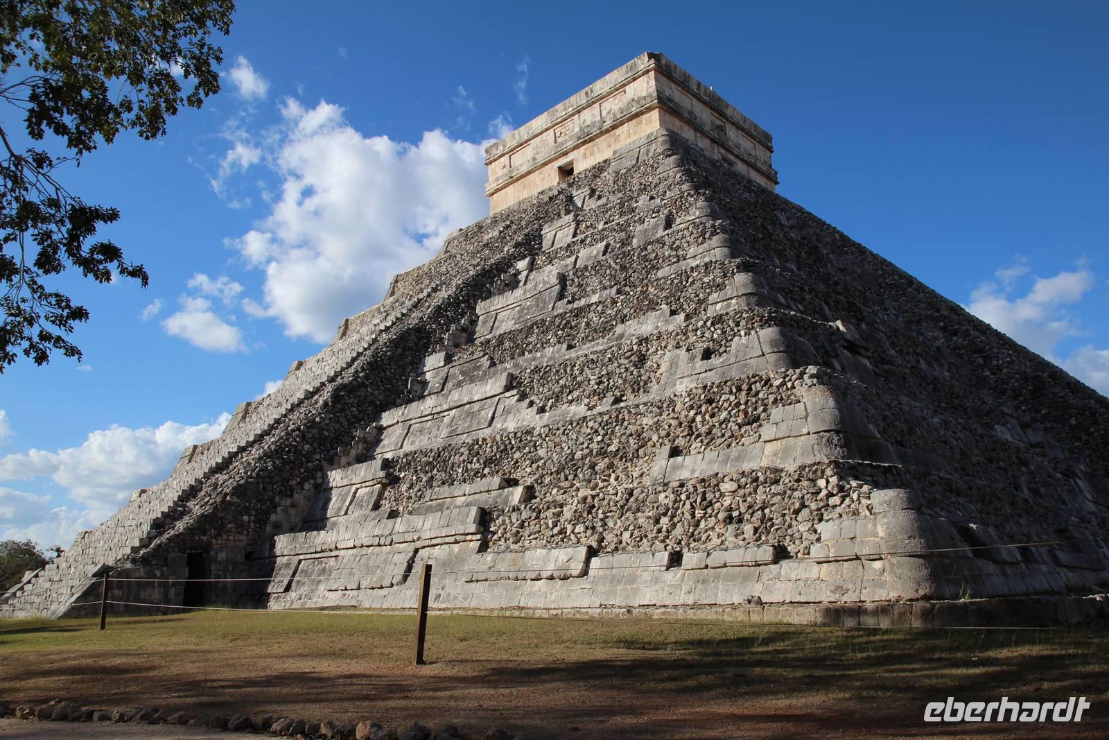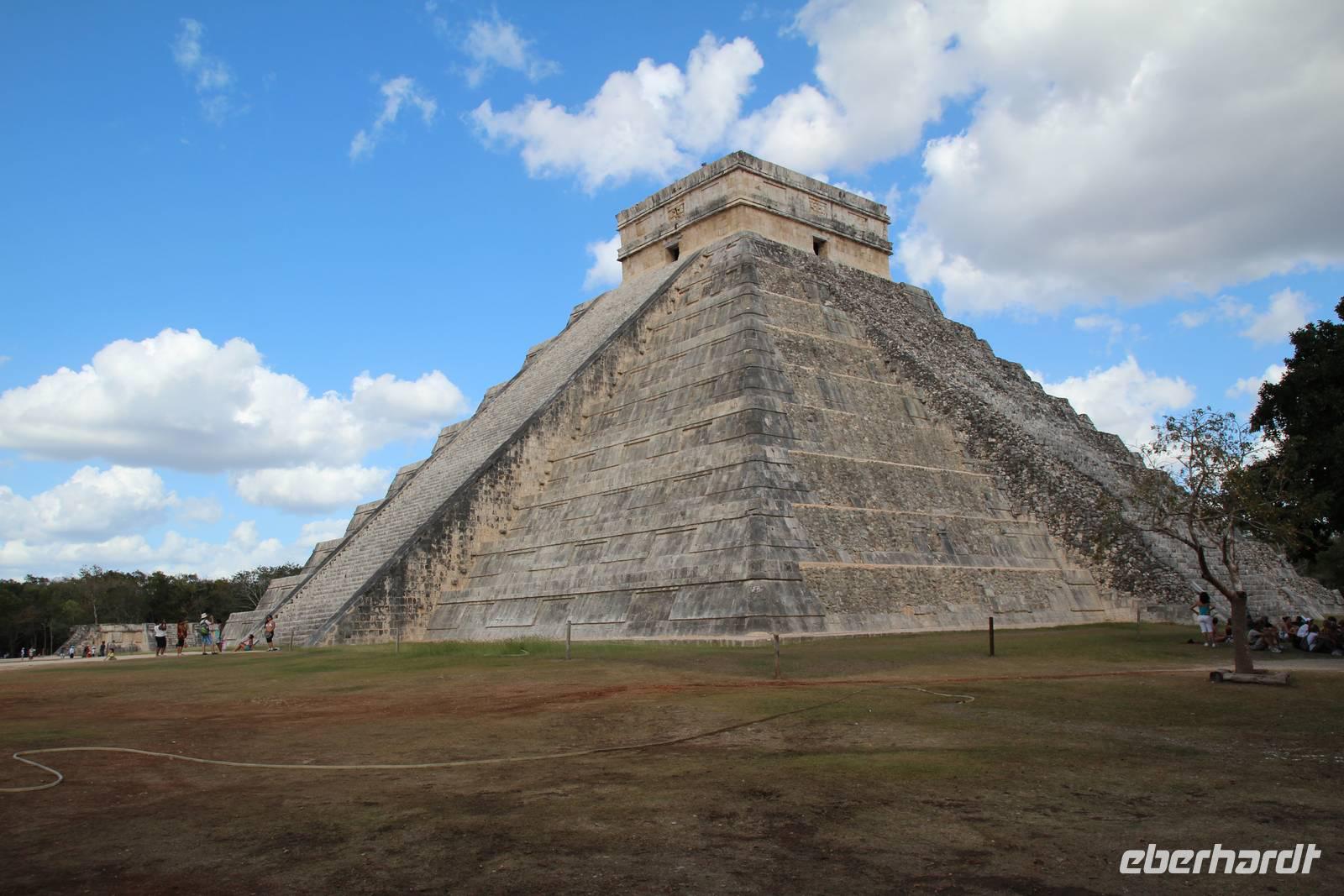 Zur Mittagspause erreichten wir auch schon unsere Hotelanlage Mayaland, die direkt neben Chichén Itzá liegt. Nach einer Stärkung ging es auf Erkundungstour. Wir merkten recht schnell, dass wir nun an der bekanntesten Ruinenstätte waren, denn es waren allerhand Touristengruppen unterwegs, so dass kaum ein Foto ohne Mensch möglich war. Auch die Händler hatten hier schon einen eigenen Bereich bekommen. Interessant war, dass die Pyramide des Kukulcán schon nach astrologischen Gesichtspunkten errichtet wurde. Exakt 365 Stufen hatte die Pyramide und diese bildeten zweimal im Jahr ein interessantes Schattenspiel. Denn immer wenn die Sonne genau über dem Äquator steht, bilden die Schatten der Stufe eine Schlangendarstellung.