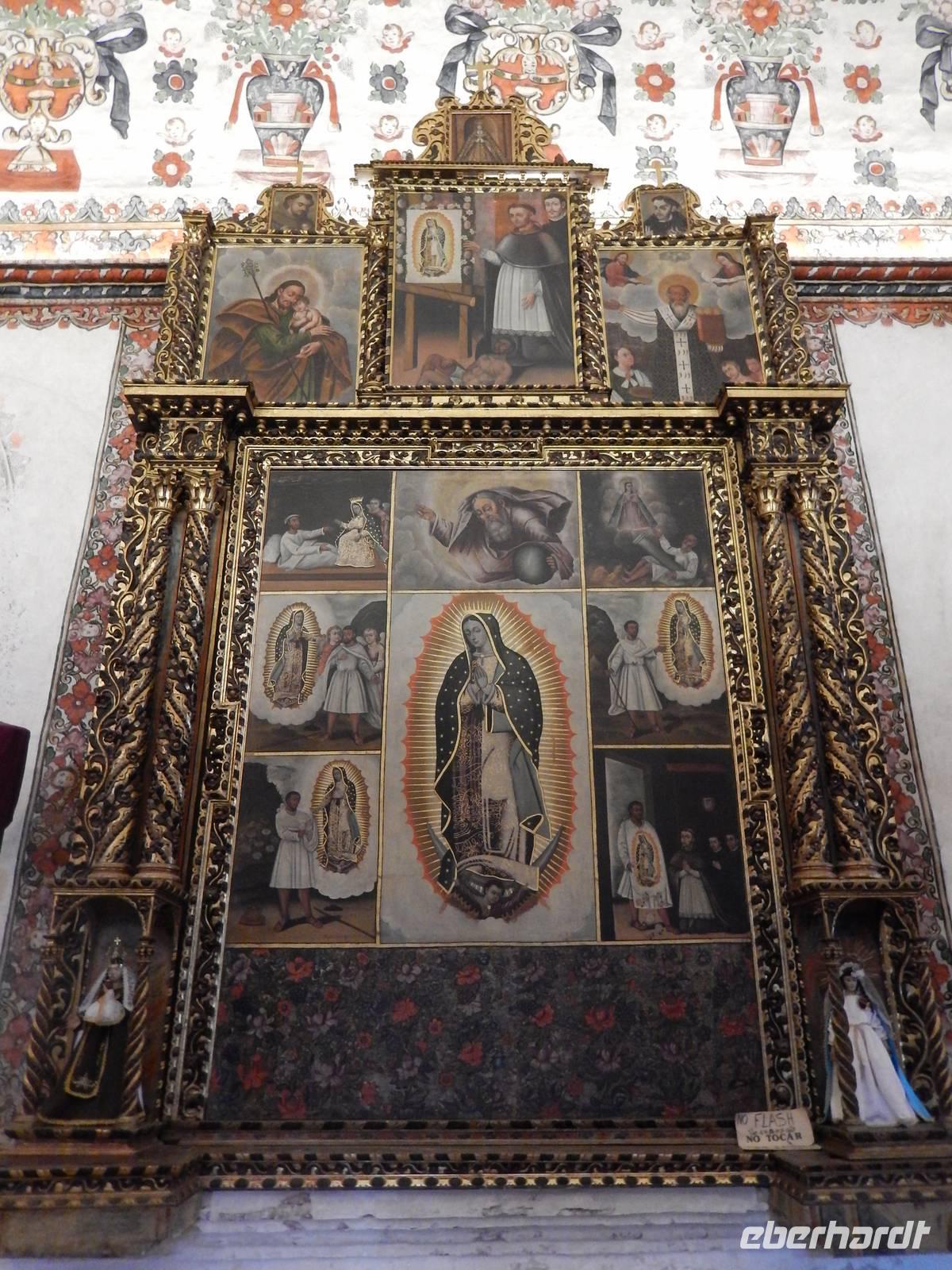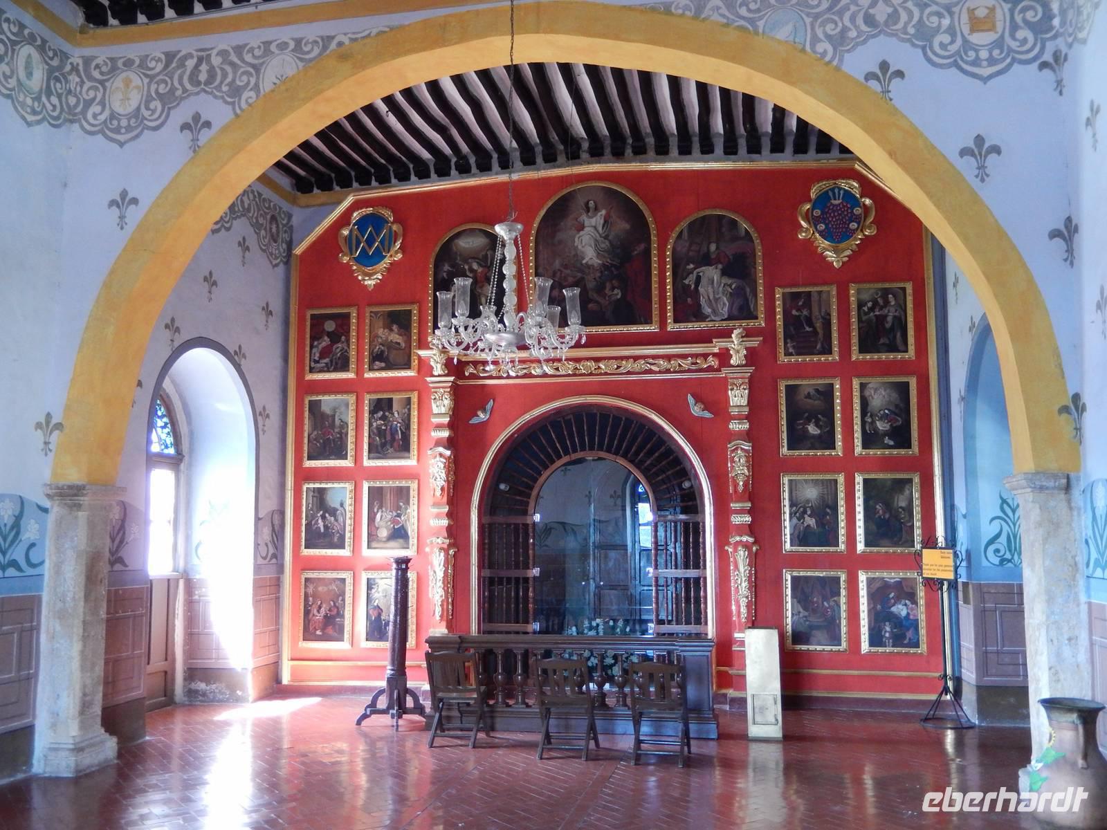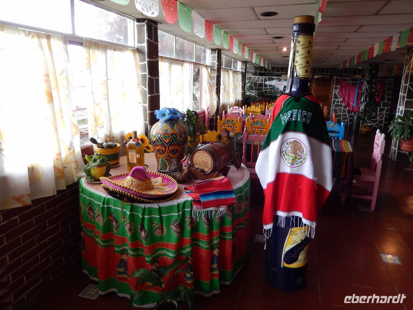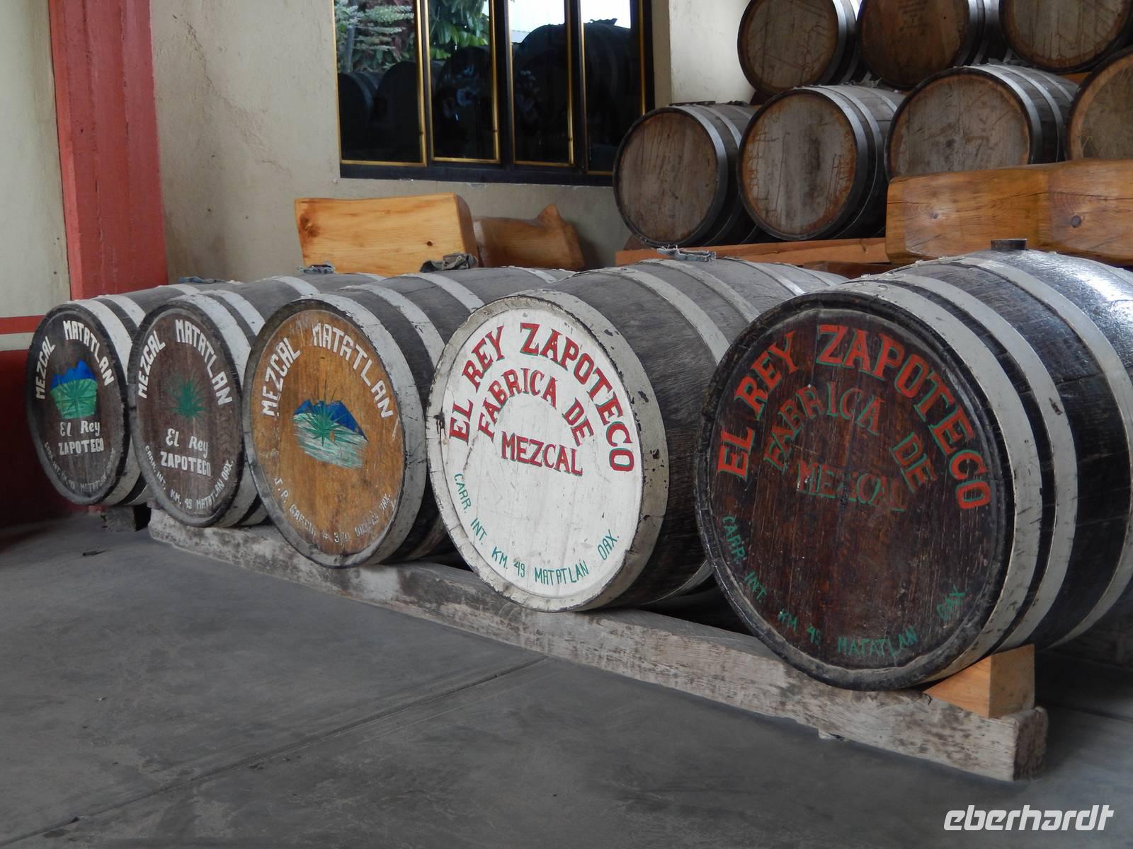 Heute verlassen wir Oaxaca und fahren weiter in Richtung Osten. Kurz hinter der Ortsgrenze stoppen wir bereits wieder in Santa Maria del Tule, einem hübschen kleinen Ort. Seinem scheinbaren Reichtum verdankt der Ort einem Naturphänomen, dem „Baum des Lebens". Diese Zeder ragt 42 Meter in die Höhe und hat einen unglaublichen Umfang von 58 Metern!!! Der Baumriese ist über 2000 Jahre alt und das Wahrzeichen des kleinen Ortes. Nach einer Umrundung fahren wir weiter auf einem Teilstück der berühmten Panamericana bis in das kleine Örtchen Tlacochahuaya. Unser stets umsichtiger Chauffeur Horacio findet in der örtlichen Straße erstmals auf dieser Reise - und das war nicht unbedingt zu erwarten, dass es erst hier passiert - seinen Meister. Wir steigen aus, was uns natürlich nicht stört, und kommen so zu einem kleinen Ortsspaziergang, der uns schließlich zur Kirche des Heiligen Hieronymus führt. Nicht so prunkvoll, aber mit herrlichen, gemalten Wandaltären ausgestattet, entspricht diese Kirche genau der Vorstellung einer Landkirche. Höhepunkt ist allerdings die Barock-Orgel, die wir mit Ruths Charme und der Freundlichkeit des Kirchendieners sogar eigenständig in Augenschein nehmen dürfen. Anschließend fahren wir weiter nach Teotitlan del Valle und besuchen die Teppich-Weberei von Familie Hernandez. Hier wird uns ausführlich und sehr anschaulich der Weg von der schmutzigen Schafswolle bis zum bunt schillernden Wandteppich erklärt. Alle Familienmitglieder sind hier eingespannt, sogar die Kinder ab ca. 7 Jahre. Wir lernen, wie die Farben Indigo und Karminrot entstehen, Frau Müller erhält sogar ein einzigartiges Handkunstwerk, wie gewaschen und gewebt wird. Außerdem überreichen wir eine DVD, die ein Eberhardt-Gast bei einer letzten Reise nach Mexiko aufgenommen hat. Das rührt die Familie in allen drei Generationen fast zu Tränen. Nach den abschließenden Einkäufen fahren wir nach Mitla, in die Stadt der Königsgräber. Wir schauen uns die zapotekische, archäologische Fundstätte an und schlendern noch etwas über den Markt. Für die Gäste die wollen, hat Ruth inzwischen einen kleinen Mittags-Snack versorgt - und nicht nur das, wir bekommen auch alle den „Orden der Puppe am Strick" verliehen - und da wir sowieso schon hinter dem Zeitplan liegen, essen wir direkt an Bord und starten in Richtung Tehuantepec. Nicht lange, denn einen Programmpunkt haben wir noch: den Besuch einer Mezcal-Destillerie. Diesen Besuch machen wir in Matatlan bei „El Rey Zapoteco". In rustikaler Umgebung sehen wir wie die Herzen der dafür gezüchteten Agaven angeröstet werden, anschließend die Maische verarbeitet und dann der Alkohol gewonnen wird. Natürlich dürfen wir auch jede Menge Sorten bzw. Geschmacksrichtungen probieren und der eine oder andere nimmt auch eine kleine Ration mit. Nun heißt es nochmal knapp 200 Kilometer bewältigen, bevor wir unser heutiges Übernachtungsziel erreichen. Die Fahrt nach Tehuantepec führt uns über eine schier endlose Serpentinenstraße hinab bis auf Meeresniveau. Die ersten Palmen sind zu sehen und dem zunehmenden Wind folgen auch zunehmende Temperaturen, so dass bei Anknft im Hotel erstmals tropische Gefühle aufkommen. Wir wohnen heute in einem schönen Hotel und genießen trotz relativ später Ankunft unser gemeinsames Essen, bevor jeder seinen Lieblingsbeschäftigungen nachgeht...