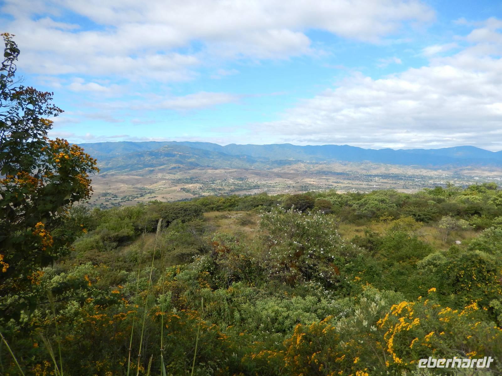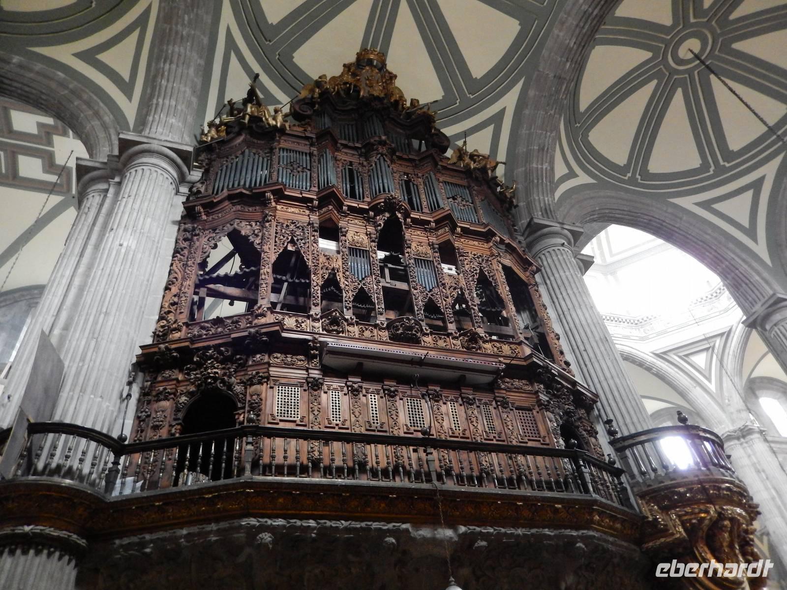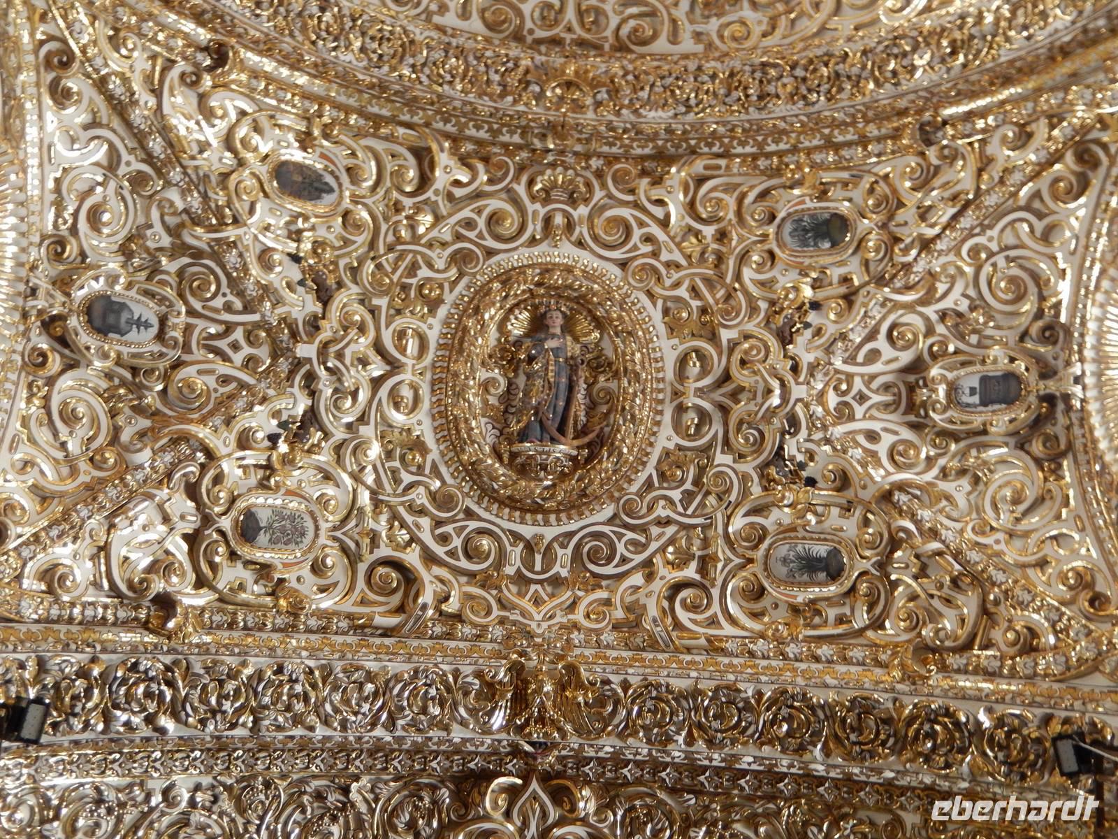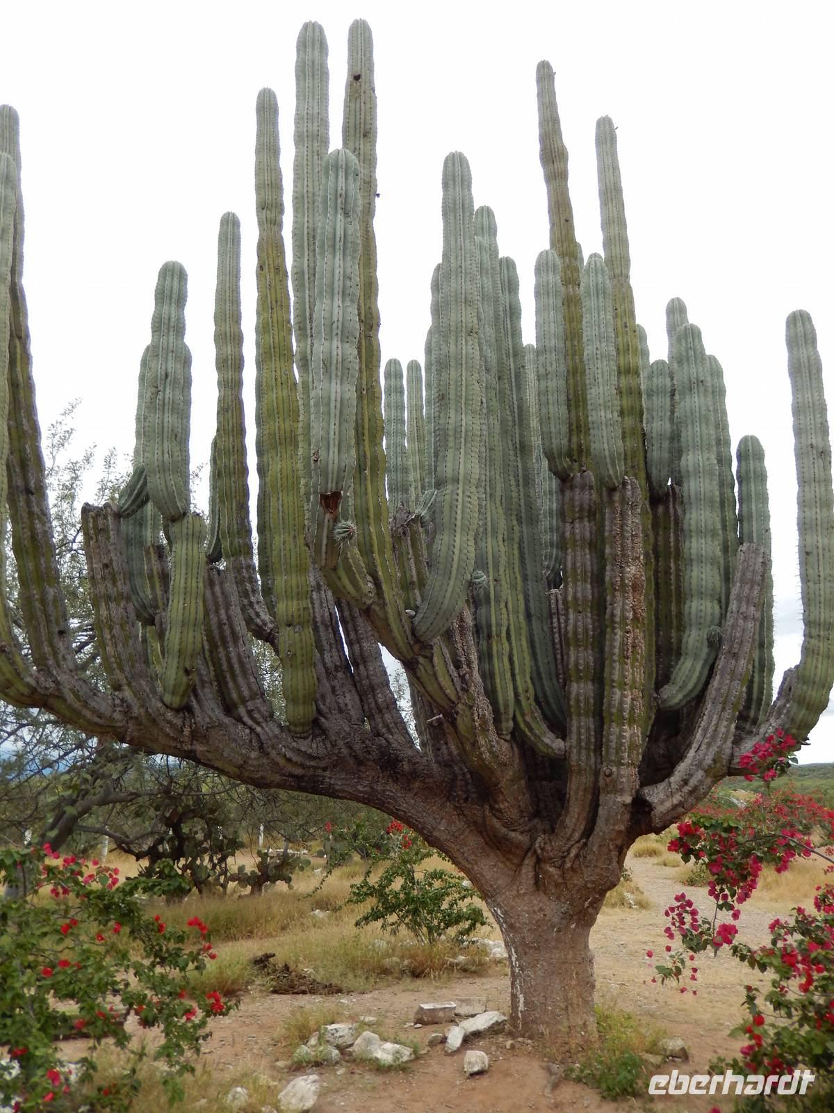 Heute verlassen wir Oaxaca und fahren weiter in Richtung Osten. Kurz hinter der Ortsgrenze stoppen wir bereits wieder in Santa Maria del Tule, einem hübschen kleinen Ort. Seinem scheinbaren Reichtum verdankt der Ort einem Naturphänomen, dem „Baum des Lebens". Diese Zeder ragt 42 Meter in die Höhe und hat einen unglaublichen Umfang von 58 Metern!!! Der Baumriese ist über 2000 Jahre alt und das Wahrzeichen des kleinen Ortes. Nach einer Umrundung fahren wir weiter auf einem Teilstück der berühmten Panamericana bis in das kleine Örtchen Tlacochahuaya. Unser stets umsichtiger Chauffeur Horacio findet in der örtlichen Straße erstmals auf dieser Reise - und das war nicht unbedingt zu erwarten, dass es erst hier passiert - seinen Meister. Wir steigen aus, was uns natürlich nicht stört, und kommen so zu einem kleinen Ortsspaziergang, der uns schließlich zur Kirche des Heiligen Hieronymus führt. Nicht so prunkvoll, aber mit herrlichen, gemalten Wandaltären ausgestattet, entspricht diese Kirche genau der Vorstellung einer Landkirche. Höhepunkt ist allerdings die Barock-Orgel, die wir mit Ruths Charme und der Freundlichkeit des Kirchendieners sogar eigenständig in Augenschein nehmen dürfen. Anschließend fahren wir weiter nach Teotitlan del Valle und besuchen die Teppich-Weberei von Familie Hernandez. Hier wird uns ausführlich und sehr anschaulich der Weg von der schmutzigen Schafswolle bis zum bunt schillernden Wandteppich erklärt. Alle Familienmitglieder sind hier eingespannt, sogar die Kinder ab ca. 7 Jahre. Wir lernen, wie die Farben Indigo und Karminrot entstehen, Frau Müller erhält sogar ein einzigartiges Handkunstwerk, wie gewaschen und gewebt wird. Außerdem überreichen wir eine DVD, die ein Eberhardt-Gast bei einer letzten Reise nach Mexiko aufgenommen hat. Das rührt die Familie in allen drei Generationen fast zu Tränen. Nach den abschließenden Einkäufen fahren wir nach Mitla, in die Stadt der Königsgräber. Wir schauen uns die zapotekische, archäologische Fundstätte an und schlendern noch etwas über den Markt. Für die Gäste die wollen, hat Ruth inzwischen einen kleinen Mittags-Snack versorgt - und nicht nur das, wir bekommen auch alle den „Orden der Puppe am Strick" verliehen - und da wir sowieso schon hinter dem Zeitplan liegen, essen wir direkt an Bord und starten in Richtung Tehuantepec. Nicht lange, denn einen Programmpunkt haben wir noch: den Besuch einer Mezcal-Destillerie. Diesen Besuch machen wir in Matatlan bei „El Rey Zapoteco". In rustikaler Umgebung sehen wir wie die Herzen der dafür gezüchteten Agaven angeröstet werden, anschließend die Maische verarbeitet und dann der Alkohol gewonnen wird. Natürlich dürfen wir auch jede Menge Sorten bzw. Geschmacksrichtungen probieren und der eine oder andere nimmt auch eine kleine Ration mit. Nun heißt es nochmal knapp 200 Kilometer bewältigen, bevor wir unser heutiges Übernachtungsziel erreichen. Die Fahrt nach Tehuantepec führt uns über eine schier endlose Serpentinenstraße hinab bis auf Meeresniveau. Die ersten Palmen sind zu sehen und dem zunehmenden Wind folgen auch zunehmende Temperaturen, so dass bei Anknft im Hotel erstmals tropische Gefühle aufkommen. Wir wohnen heute in einem schönen Hotel und genießen trotz relativ später Ankunft unser gemeinsames Essen, bevor jeder seinen Lieblingsbeschäftigungen nachgeht...