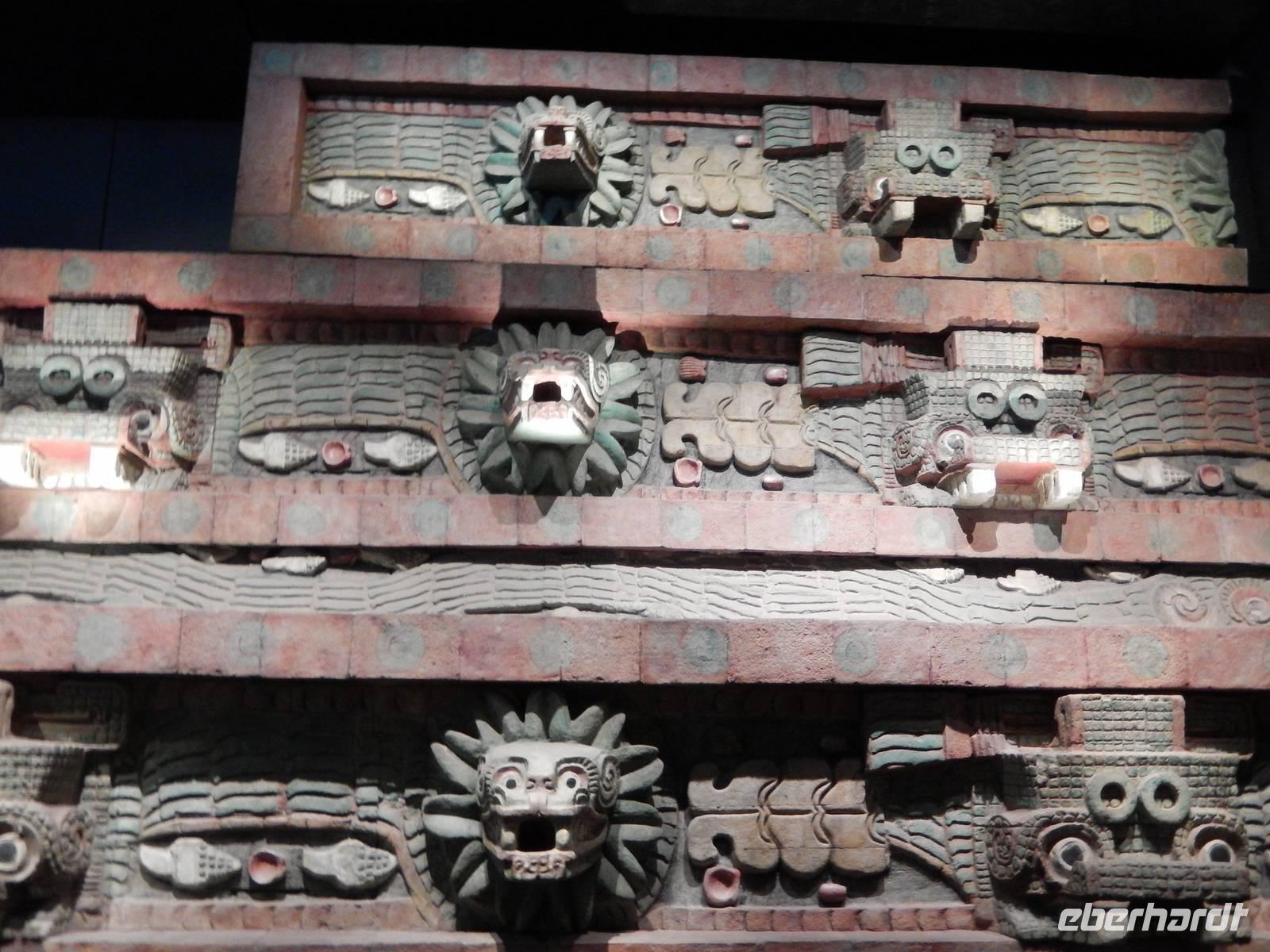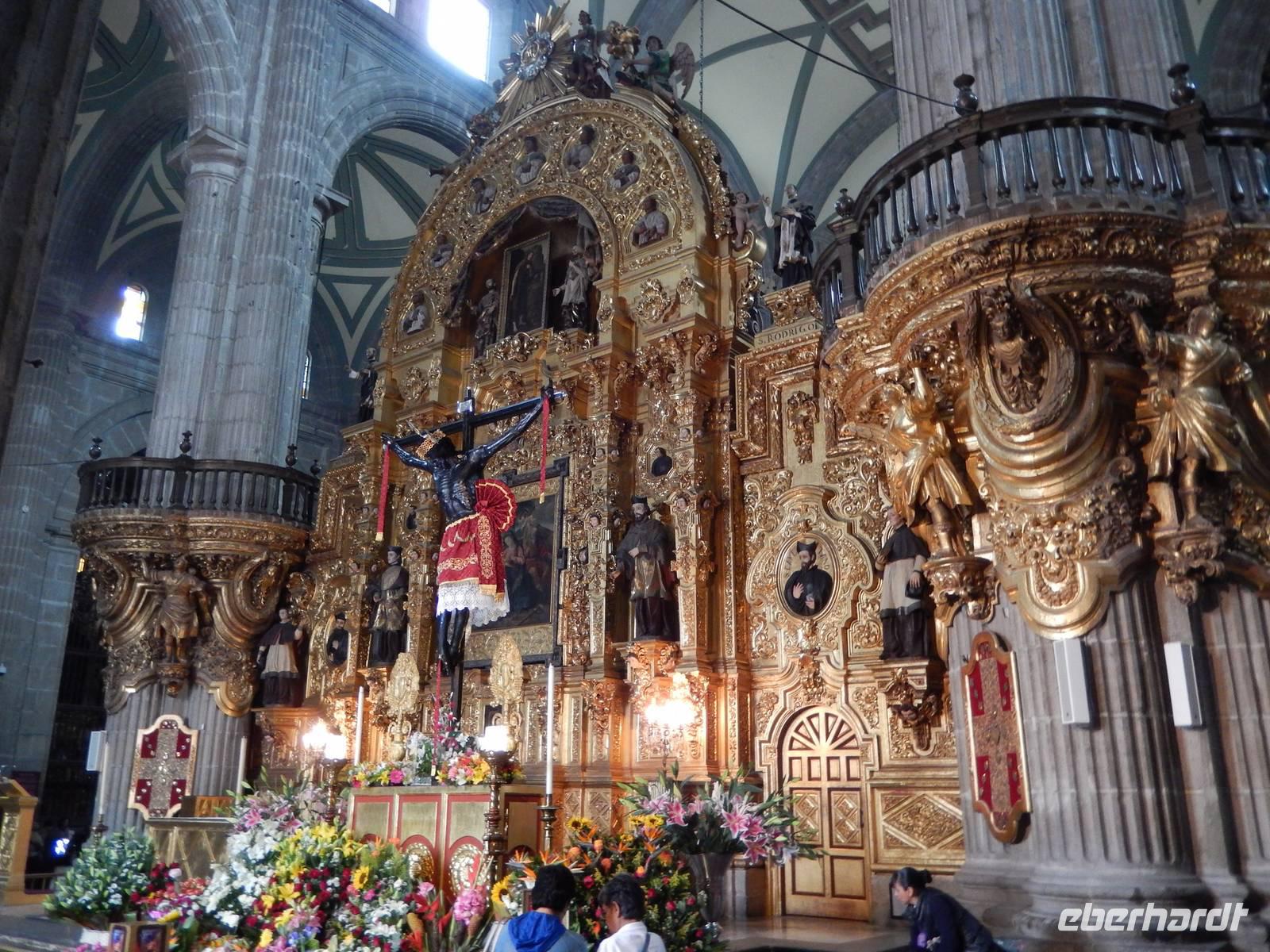 Die meisten von uns holen ein wenig Schlafdefizit auf, aber der eine oder andere zeigt Jetlag-Symptome und so sind wir beim Frühstück mehr oder weniger ausgeschlafen. Abreise ist heute human um 08.30 Uhr und wir starten direkt zum Anthropologischen Museum Mexikos. Hier kann man alles, aber wirklich alles über die mexikanischen Hochkulturen erfahren. Neben Unmengen Einheimischer - sonntags ist der Museumsbesuch für die Mexikaner frei - verbringen wir 3 Stunden im Reich der Olmeken, Azteken, Mayas... Wundervolle Ausgrabungsgegenstände, Nachbildungen berühmter Funde der Frühzivilisationen und zahlreiche Kunstgegenstände erklärt uns Ruth mit Engelsgeduld und so lernen wir gleich am ersten Tag Mexiko besser zu verstehen. Wir wissen nun auch alles über die Jaguar- und Adler-Krieger, das Leben vor und nach der Eroberung Mexikos durch die Spanier und welche Rechte die Menschen „... mit angehäufter Jugend..." hatten. Mit unzähligen Eindrücken verlassen wir mental geschlaucht das Museum am Mittag und stürzen uns in das Sonntagsleben der Einheimischen - zu Beginn gleich mit einem Snack von Heuschrecken... Anschließend fahren wir nach Xochilmilco, das ehemalige Gebiet der „schwimmenden Gärten", wo uns eine Stakenbootsfahrt erwartet. Ähnlich wie in unserem Spreewald - nur in anderen Dimensionen - starten wir mit unserem bunt verzierten Boot Carolina auf den „See". Es wird nur eine Kanalfahrt, da zum Sonntag auch Hunderte andere Boote unterwegs sind. Die Mexikaner nutzen diese Möglichkeit für einen Familienausflug oder auch eine Feierlichkeit. Es gibt fliegende Händler mit Speisen und Getränken und Boote mit Musikkapellen - ein lustiges Treiben und für uns eine schöne Erfahrung. Auch wir genießen unser Mittagessen auf dem Schiff und kommen in ersten Kontakt mit der mexikanischen Küche bei leckeren Tortillas Wir haben noch etwas Zeit auf dem kleinen Markt in Xochimilco und fahren dann zurück ins Stadtzentrum, wo uns ein zweistündiger Spaziergang durch die Innenstadt erwartet. Wir fahren bis zum Zocalo, dem Hauptplatz, wo gerade die Buchmesse stattfindet und schauen uns zuerst die Kathedrale von Mexiko an. Es ist ein sehr beeindruckendes Bauwerk und es ist von Gläubigen quasi überfüllt. Anschließend spazieren wir noch zu den Ausgrabungen eines Maya-Tempels und dann über die Einkaufsstraße Madero in Richtung Oper. Faszinierend sind vor allem die vielen Baustile, die in der Innenstadt zu sehen sind glücklicherweise kennt sich Ruth bestens aus und zeigt uns das eine oder andere Kleinod, zum Beispiel das Jugendstil-Hotel Gran Hotel de Mexico. Nach unserer Stadtbesichtigung sind wir alle ziemlich „pflastermüde" und freuen uns auf das Hotel, zumal die eine oder andere Jetlag-Nachwirkung doch zu spüren ist. Einige wenige besuchen noch ein Restaurant und dann beginnt schon die Vorbereitung auf den nächsten Tag...