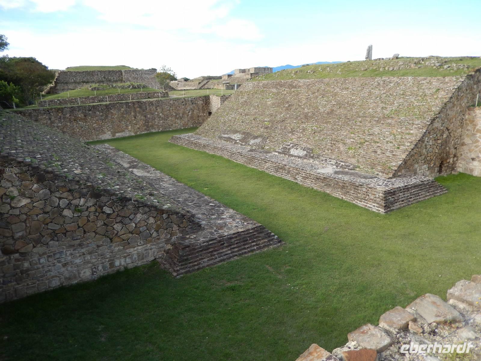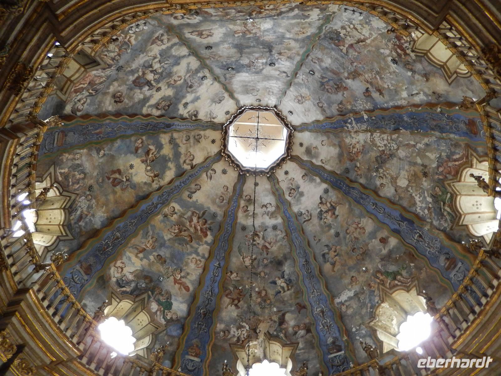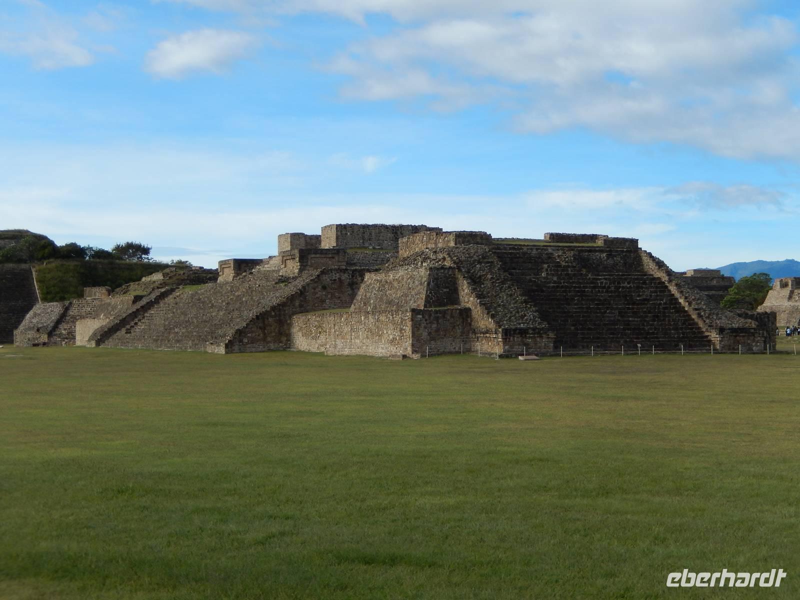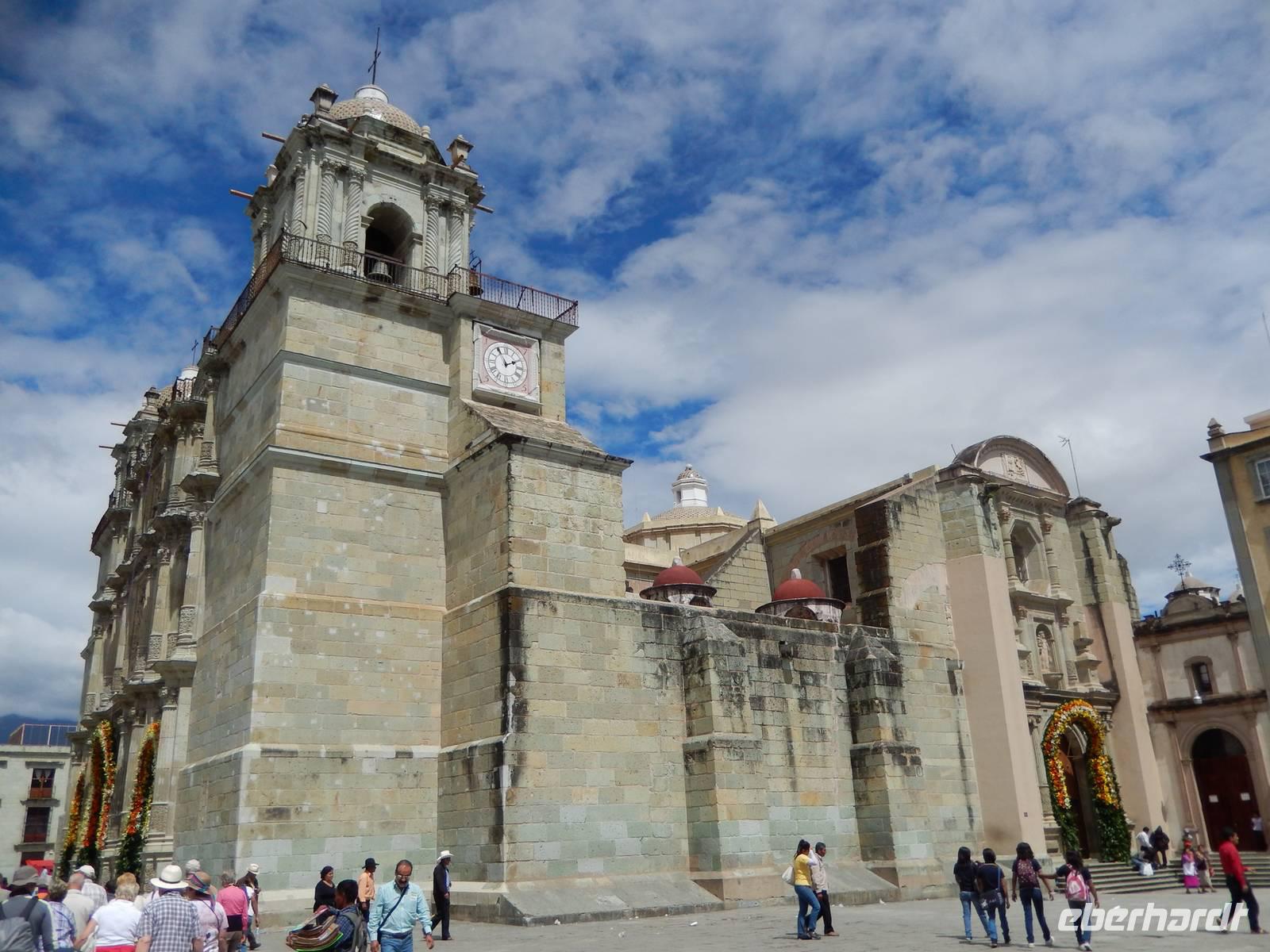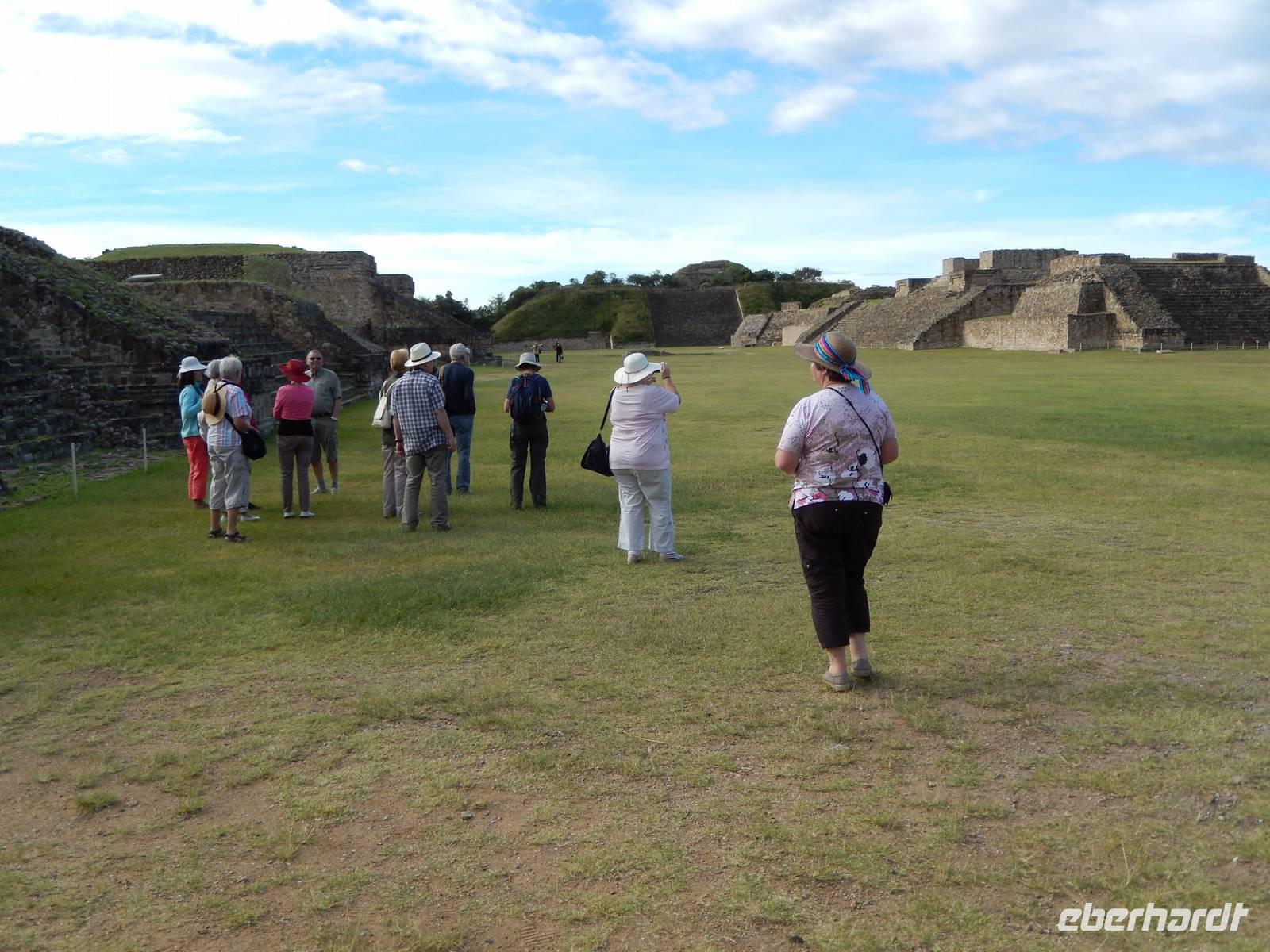 Um 08.00 Uhr starten wir heute zu unseren nächsten Besichtigungen, weil wir zu den ersten gehören wollen, die an der Ausgrabungsstätte sein wollen. Das gelingt uns zwar nicht ganz, aber trotzdem ist es auch hier von Vorteil, zeitig da zu sein, vor allem weil die Temperatur - und heute sehen wir die ersten richtigen Sonnenstrahlen unserer Reise - einladender ist und noch nicht so viele andere Touristen da sind. Wir besuchen Monte Alban, eine zapotekische Ausgrabungsstätte, die den meisten von uns sehr gut gefällt. Es sind ein paar Stufen weniger zu bewältigen als beim letzten Mal und das Areal ist übersichtlicher Außerdem sorgen Vegetation und grüne Wiesen für ein angenehmeres Gesamtbild. Ruth führt uns gewohnt allwissend durch die Anlage und wir besteigen Süd- und Nordplateau, sehen den Ballspielplatz und lernen alles über die Darstellungen von „Tänzern" und „Schwimmern". Den Rundgang beschließen wir mit einem Besuch im kleinen, feinen Museum und einer Tasse leckeren Kakaos auf der Terrasse des Museums. Die süße Köstlichkeit geht dabei auf Kosten von Eberhardt, was ein noch größeres Lächeln auf unsere Gesichter zaubert. Anschließend fahren wir in die Innenstadt von Oaxaca und bleiben gleich beim Thema Schokolade. Beim Besuch eines Familienbetriebs sehen wir wie aus den Kakaobohnen die köstliche Masse unter Beigabe von Zucker und ggf. Mandeln, Vanille o. ä. entsteht. Natürlich nutzen die meisten die Möglichkeit zum Kauf von Ess- oder Trinkschokolade bzw. von Pulver für die Zubereitung von Mole Negro oder Mole Rojo, einer köstlichen Soße, die gerade in der Gegend um Oaxaca zur Zubereitung von Hühnchen benutzt wird. Nach den Einkäufen schlendern wir mit Ruth über den einheimischen Markt und bestaunen Obst, Fleisch, Gemüse und jede Menge Handwerksarbeiten. Natürlich finden wir hier auch schon das eine oder andere Mitbringsel für zu Hause. Wir besuchen noch die reichlich mit Blumen geschmückte Kathedrale und fahren dann zu einer kleinen Vorführung zur Zubereitung eines Huhns in Chilisoße. Der weite Weg dahin und die Bezeichnung Kochkurs stehen nicht wirklich im Verhältnis zum Aufwand, aber eine kleine Kostprobe macht Appetit auf mehr. Nun geht es zurück in die Stadt, wo wir gemeinsam mit Ruth noch die prächtige Kirche Santo Domingo mit der Rosenkreuz-Kapelle anschauen. Auch hier geht das Auge über vor Goldverzierungen, prächtigen Deckenmalereien und fantastischen künstlerischen Kleinoden. Nach der Besichtigung haben wir das erste Mal Freizeit... Die meisten nutzen diese für einen Bummel durch Oaxaca, einen Café oder Einkäufe. Auf dem Zocalo - dem Hauptplatz finden heute Demonstrationen statt, was den Genuss des Flairs dort natürlich stark einschränkt. Erhöhte Polizei-Präsenz und unzählige Menschen lassen den Platz als Ziel für einen gemütlichen Abend-Spaziergang ausfallen. Wir genießen also unser Abendessenim Hotel und beginnen dann schon wieder langsam mit Kofferpacken, denn die nächsten Tage stehen immer Hotelwechsel nach jeweils einer Nacht an...
