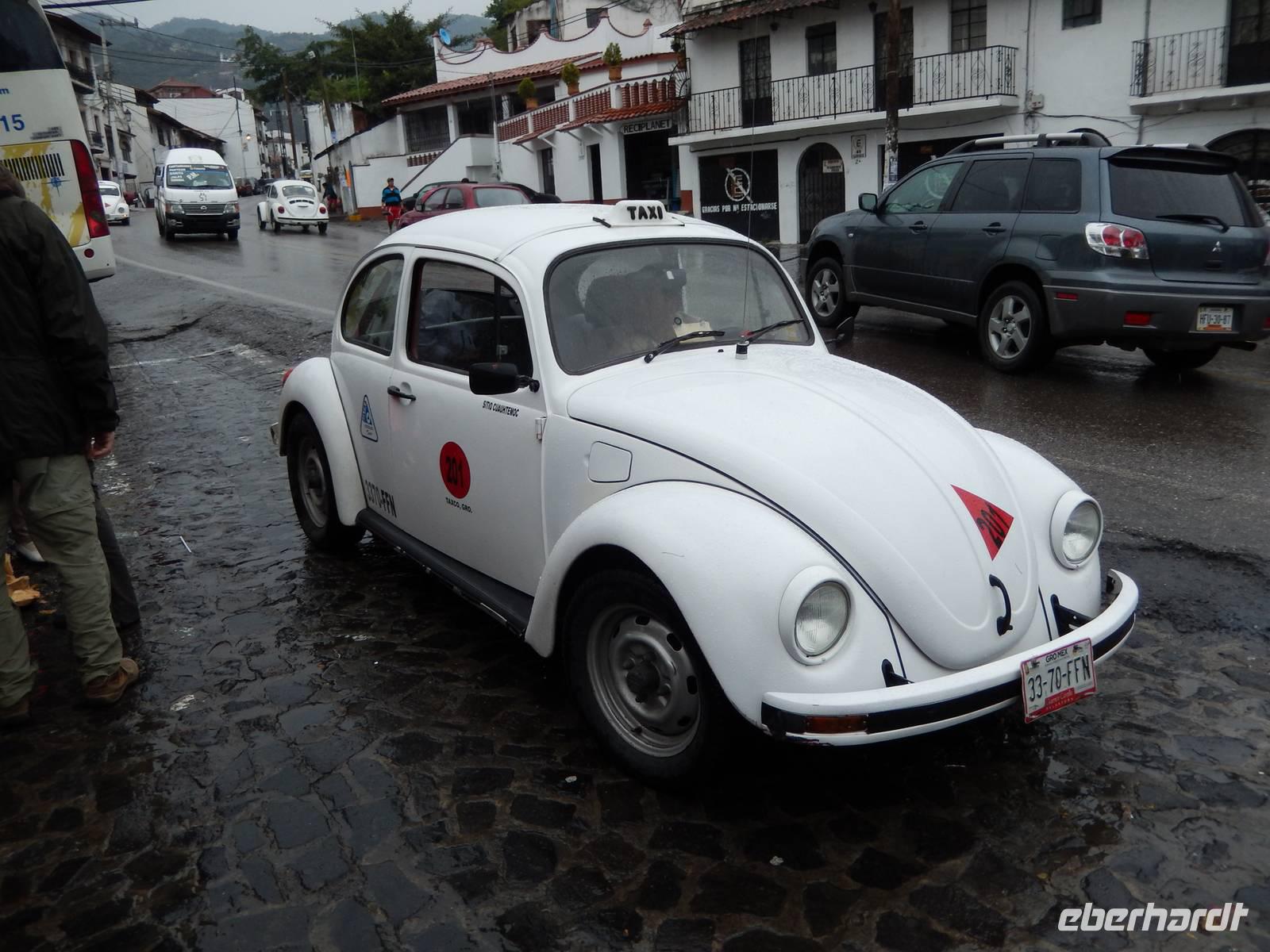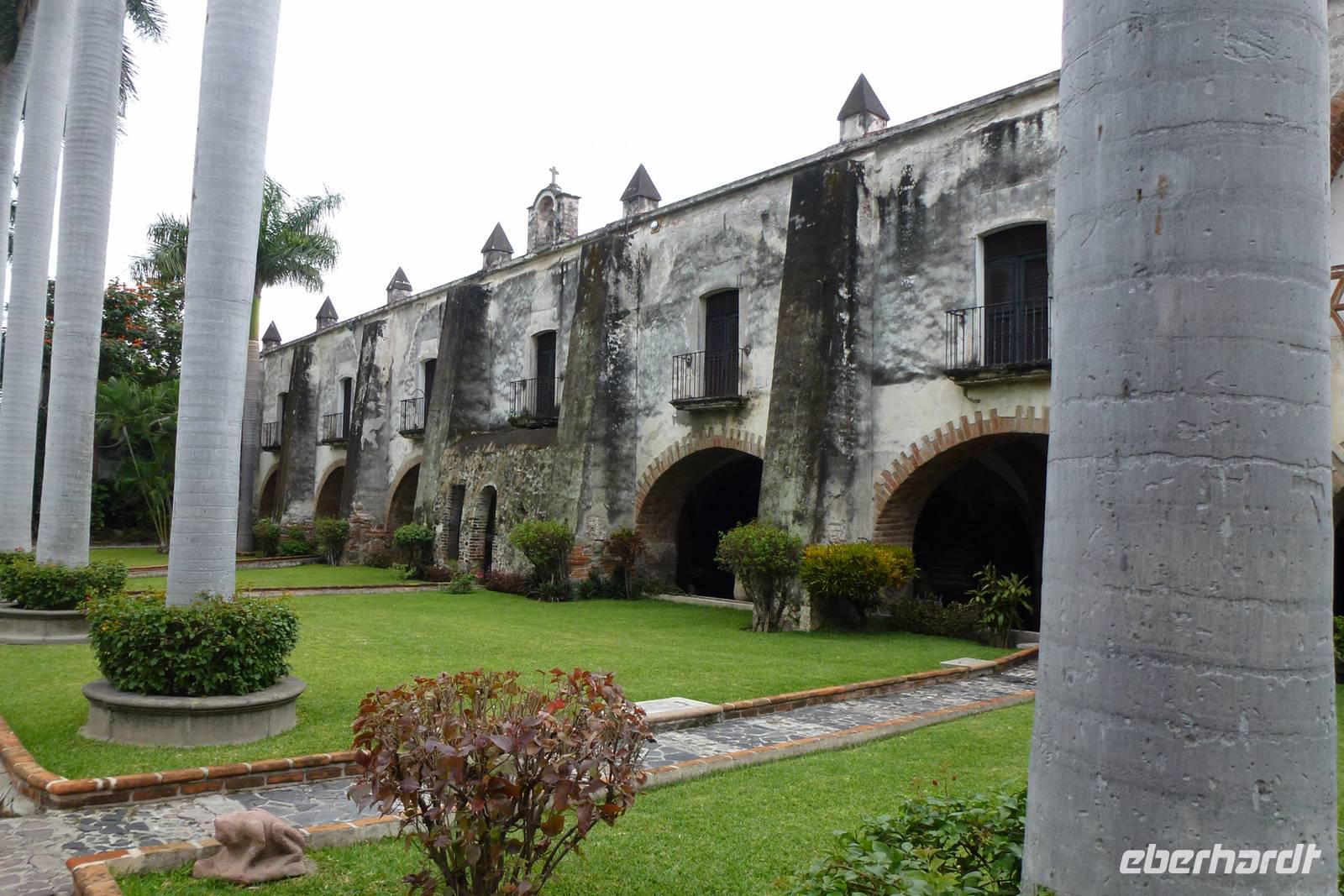 ... und so klingelt bereits kurz vor 6 Uhr der Wecker... Wir frühstücken und fahren bereits 07.15 Uhr ab, damit wir den morgendlichen Stau auf der Straße in Richtung Süden, möglichst umgehen. Der erste Halt ist ein besonderer für mich. Als Sportfan erreiche ich gerade wieder mal eine historisch bedeutsame Sportstätte - das Olympia-Stadion von 1968, wo Bob Beamon seinen legendären Weitsprung-Weltrekord erzielt hat. Nach einer weiteren „Möglichkeit zur Entsorgung" überqueren wir bei inzwischen guter Sicht auf den rauchenden Popocatepetl einen Pass in Höhe von 3.018 Metern. Anschließend geht es wieder bergab nach Cuernavaca, wo wir bei einem Stadtrundgang die dortige Franziskaner-Kirche und das Brady-Museum - unter anderem können wir in der Sammlung des privaten Kunstsammlers Werke von Frida Kahlo bestaunen - besuchen. Wir spazieren noch zum Cortez-Palast und zum Zocalo und nach ein wenig Freizeit in dem gemütlichen kleinen Städtchen besteigen wir den Bus und wenig später holt uns der befürchtete Regen ein. Über Acapulco, also ca. 200 Kilometer entfernt, hängt der Hurricane Raymond fest und beschert dem Binnenland viel Feuchtigkeit. So erleben wir auch unsere nächste Station, die Silber-Stadt Taxco, auch im Regen. Wir beginnen den Besuch in einem Familienbetrieb für Silberschmuck-Herstellung und der eine oder andere findet bezaubernde Schmuckstücke, die hier in Handarbeit hergestellt werden. Da die Gassen der Stadt viel zu eng für den Bus sind, spazieren wir das Kopfsteinpflaster entlang in die obere Altstadt. Unser Ziel ist die Kirche Santa Prisca mit Ihren wundervollen Wandaltären, die vor filigraner Handarbeit strotzen. Überhaupt wirken viele der Kirchen sehr prunkvoll, teilweise überladen, aber im katholischen Mexiko spielt die Religion seit jeher die größte Rolle im Leben der meisten Menschen. Nach unserem kirchengeschichtlich und kunsthistorisch hervorragenden Rundgang, suchen wir aufgrund des Regens eine Zuflucht in einem kleinen Restaurant für einen Mittags-Snack. Nun steht noch die Rückkehr durch die Altstadt im Regen bevor... kurzerhand entscheiden sich Ruth und ich für die typischste Fortbewegung in Taxco - die Fahrt im Käfer-Taxi. Und so zwängen wir uns jeweils zu dritt auf die Rückbank des Klassikers der deutschen Automobil-Industrie und genießen mehr oder minder die rasante Fahrt durch die engen Gassen und steilen Anstiege bis uns die Fahrer, bei dem einen oder anderen darf angezweifelt werden, ob er in Deutschland schon einen Führerschein besitzen dürfte..., am Bus aus den weißen Fahrzeugen entlassen. Nach diesem Abenteuer geht es nun direkt zu unserem heutigen Hotel, der Hacienda Villa Hermosa. Die Umgebung der Anlage sieht nicht sehr einladend aus, dafür scheinen wir hinter dem schweren Tor in eine andere Welt einzutauchen. Eine ehemalige Zuckerrohr-Hacienda mit kolonialen Gebäuden, einer riesigen Pool-Anlage und ganz pittoresken Anblicken bietet sich uns dar. Nach einem Willkommens-Cocktail am Pool erwartet uns dann noch ein 3-Gang-Menü im Gewölbe-Restaurant - sehr romantisch. Als einige dann noch zu einem Abschluss-Getränk sitzen bleiben, haben wir noch eine Begegnung der anderen Art: ziemlich große Fledermäuse zählen das Gewölbe und die darunterliegenden Keller zu ihrem Wohnraum und je später der Abend desto häufiger wird der „Luftraum" über uns zischend durchquert...