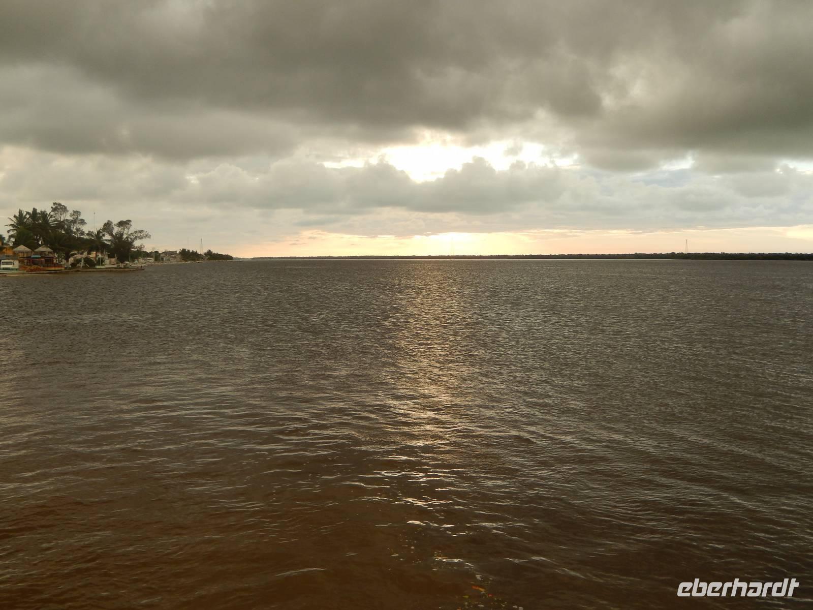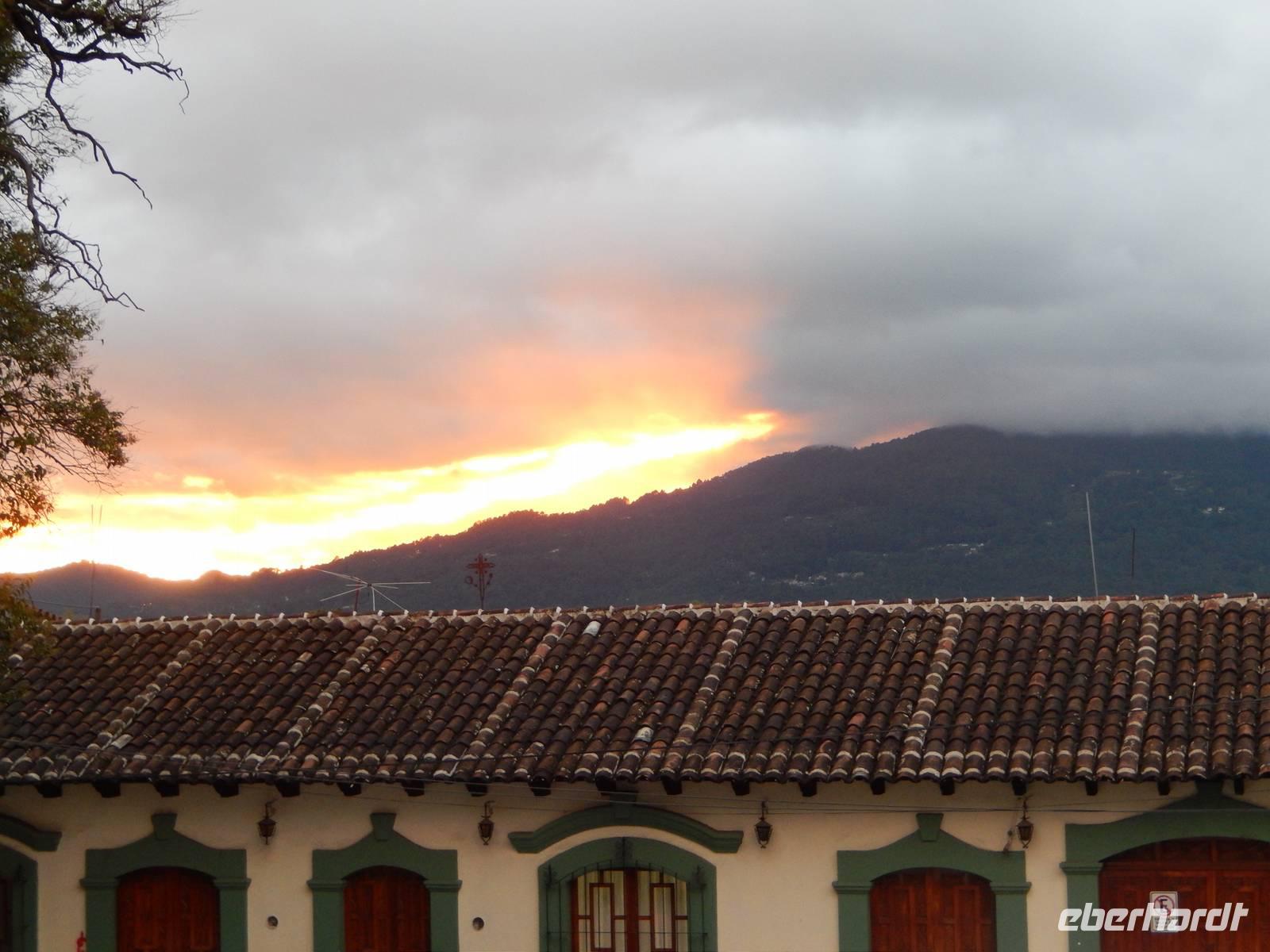 ... ein Blick hinaus verrät: SONNE! ENDLICH! Heute steht die berühmte Maya-Stadt Palenque auf unserem Entdeckungsplan und wie immer starten wir zeitig genug, um möglichst zu den ersten in der archäologischen Zone zu gehören. Das gelingt uns auch fast... aber wir sind ja vom hervorragenden Buffet gestärkt. Wir freuen uns über das Wetter, auch wenn die Sonne sofort unbarmherzig auf uns brennt und die Feuchtigkeit des Regens aus der Nacht ein wirkliches Tropenwetter verursacht. Die Luftfeuchtigkeit ist sehr hoch und so beginnen wir mit Sonnenausrüstung und Wasser gerüstet die Expedition in Palenque. Hierbei handelt es sich um ein Areal der früheren Maya-Kultur von 16 km² mit ca. 300 Tempeln und Gebäuden, von denen jedoch bisher nur 10 % entdeckt bzw. ausgegraben sind. Über alles andere herrscht nach wie vor der Dschungel... Wir lernen verschiedene Tempel durch Ruth kennen, u.a. den Tempel der Inschriften oder den Schädel-Tempel. Wir klettern auf den Palast und entdecken faszinierende Details der Maya-Architektur. Nun wandern wir weiter über das große Gelände und erreichen bald den Kreuz- und Sonnentempel. Ausgepowert, verschwitzt und trotzdem voll positiver Energie nehmen wir für ein tolles Fotomotiv auch diese „knieunfreundlichen" Stufen nochmals auf uns und werden mit einem tollen Blick über das Gelände belohnt. Inhaltlich sind wir jetzt dank Ruth voll im Bilde und wissen, warum sich die Maya mit Ihrer Untergangstheorie 2012 verrechnet haben. Der Weg zurück zum Bus führt durch ein Stück Regenwald mit Baumriesen, einer Ameisenstraße wie aus dem Bilderbuch und einem Wasserfall. Das Museum in Palenque hat heute leider geschlossen, aber die meisten von uns sehnen sich einfach nur nach Trocknung und etwas weniger Luftfeuchtigkeit... Unser nächster Stopp erfolgt auf einer Kautschukplantage, wo uns der Juniorchef herumführt und zeigt, wie hier Latex gewonnen wird. Viele Dinge, die wir noch nicht gehört hatten - über Aufforstung, Gewinnung und Verarbeitung - machen den Besuch zu einem Bildungstrip. Anschließend folgen 10 Minuten Fahrt zum Hotel Ciudad Real, wo wir bereits zum Mittagessen erwartet werden. Wir genießen die Möhrensuppe, das Buffet und füllen natürlich unseren Mineralienhaushalt auch wieder auf! Kurz nach Mittag brechen wir dann auf unsere mit 5-6 Fahrtstunden avisierte Reise nach Campeche am Golf von Mexiko auf. Hier schlafen wir das nächste Mal. Horacio nimmt extra die viel schönere Küstenstraße, doch erstmal werden wieder von einem typisch, tropischen Regenschauer heimgesucht. Wie gut, dass wir im Bus sitzen! So schnell wie die Regenfront kam, ist sie auch wieder weg und wieder da und... so bieten sich vor Einbruch der Dunkelheit noch der eine oder andere schöne Blick in die abwechslungsreiche mexikanische Flora. Nach dem Sonnenuntergang im Golf von Mexiko faszinieren uns die Farbspiele, die den Himmel von dunkelblau bis zartrosa schimmern lassen. Als die Sonne dann endgültig verschwunden ist, ist der Regen wieder da und Blitze durchzucken den Himmel - auch sensationell. Im Finstern erreichen wir unser Hotel Oceanview in Campeche und da im Rahmen der Halbpension heute bereits das Mittagessen inkludiert war, geht der eine oder andere am Abend noch einmal los für einen kleinen Snack.