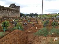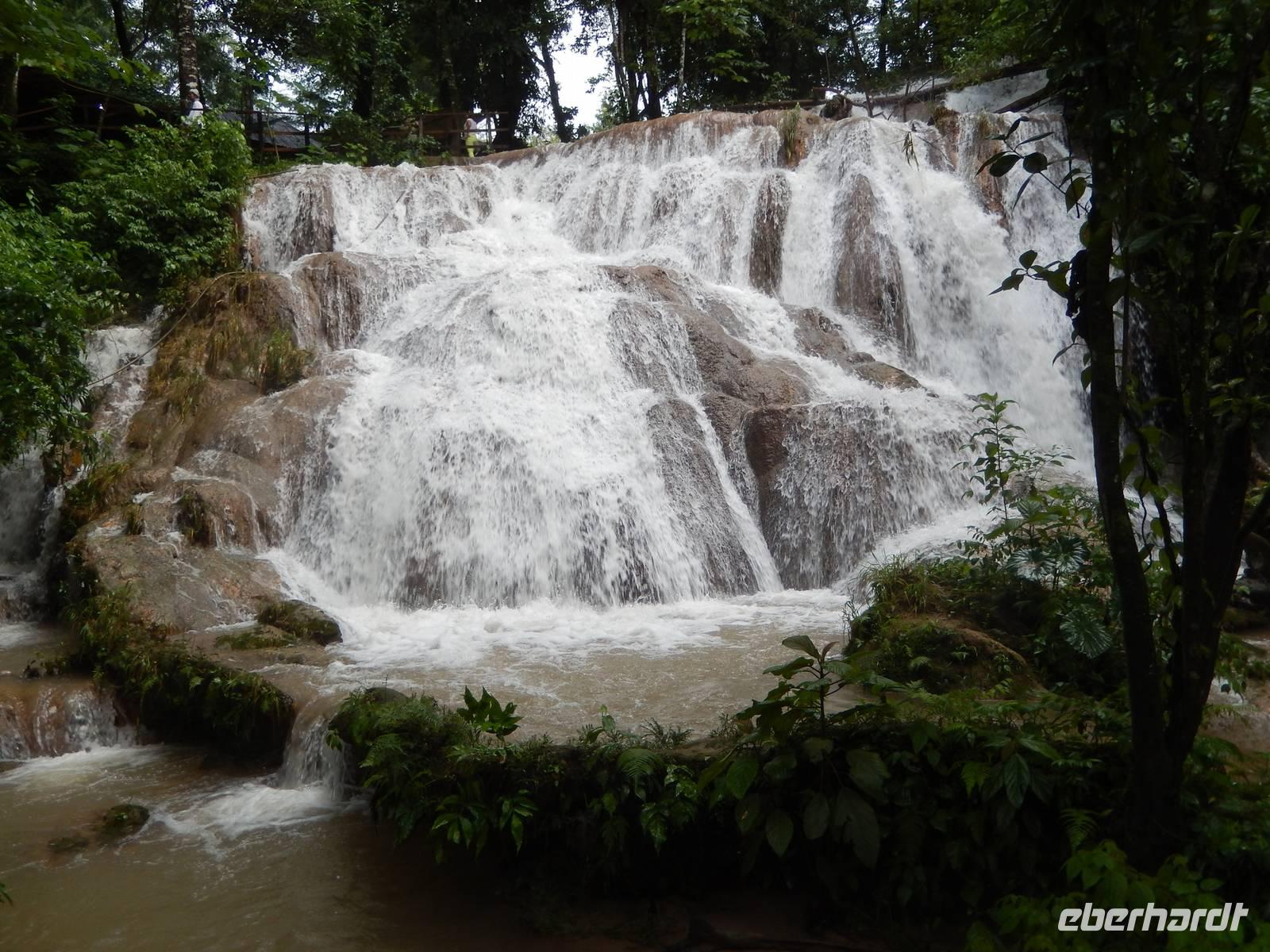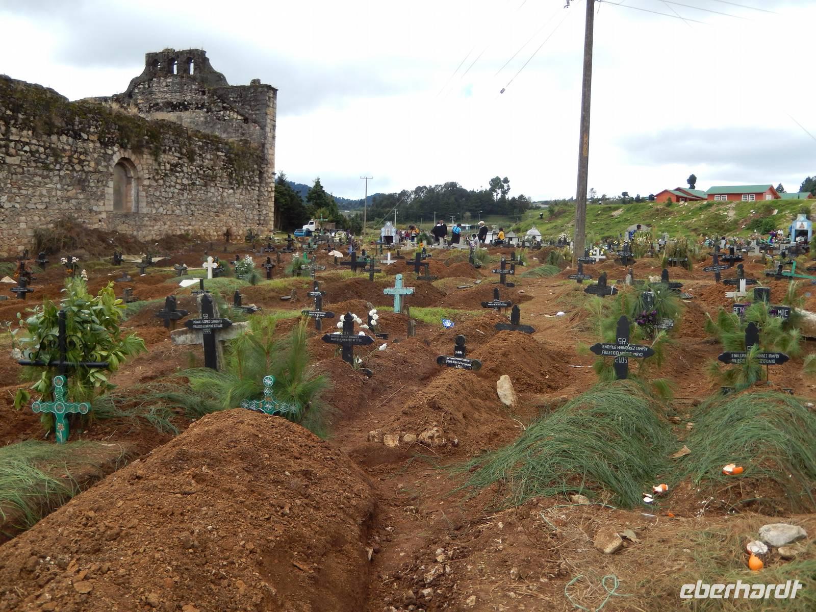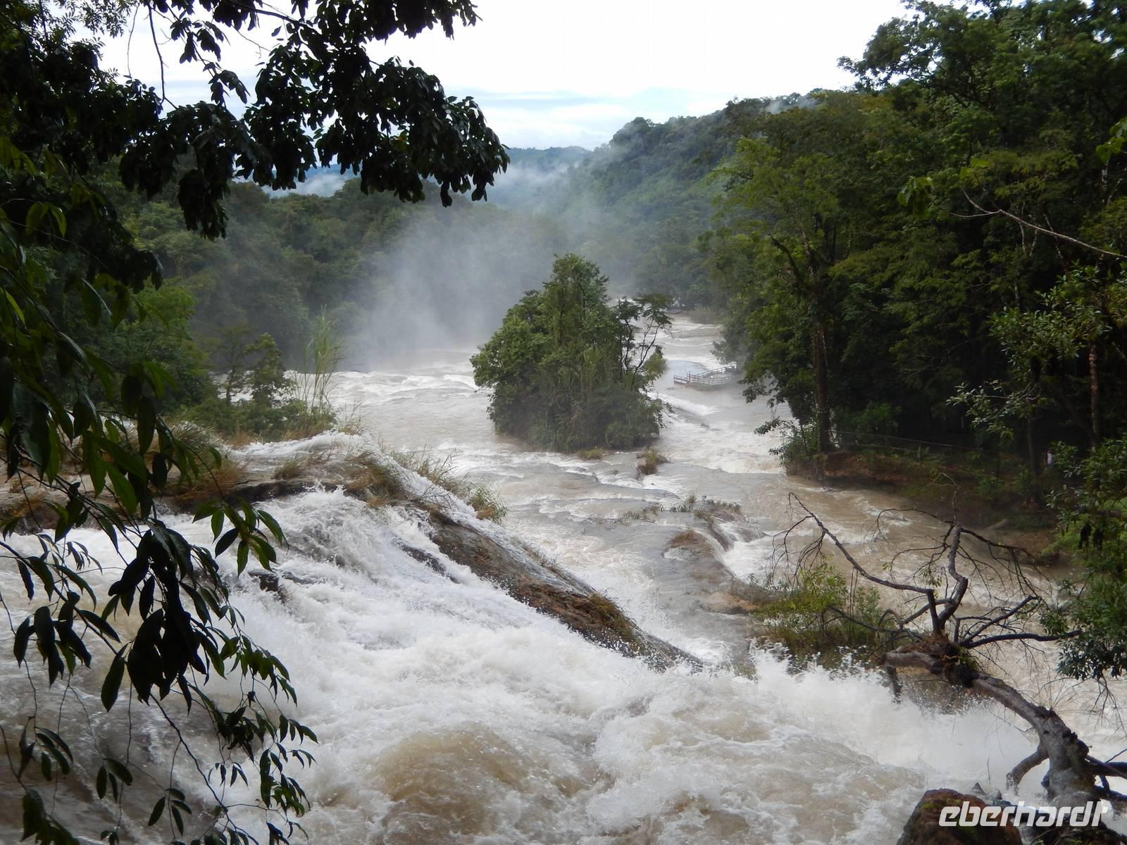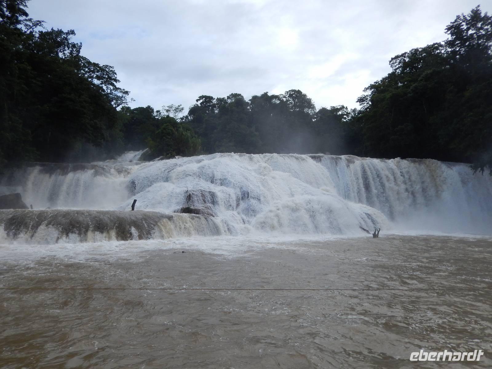 Heute Morgen wollen wir das Land der Indigenas so gut es geht kennenlernen. Dafür fahren wir in das kleine Indigena-Dorf San Juan de Chamula. Horacio lässt uns am Busparkplatz raus und wir stürzen uns ins Getümmel. Wegen des anstehenden Allerseelen-Festes scheinen alle 90.000 Tausend Indgenas heute hier zu sein. Der Markt ist wunderschön und bietet alles von der Zwiebel bis zur Handwerkskunst. Natürlich verfallen auch wir dem Flair und einige lassen sich zu Käufen hinreisen. Und so kämpfen wir uns durch die Masse an Menschen um zur Kirche zu gelangen. Fotografieren ist hier im Dorf der Indigena schwierig, denn trotz einer Fotoerlaubnis, die uns Ruth besorgt hatte, fällt es schwer gerade dann auf den Auslöser zu drücken, wenn kein Würdenträger in der Nähe ist. Wir besichtigen die fantastische Indigena-Kirche, in der Fotografieren komplett verboten ist. Die wunderschöne Kirche ist innen nahezu überall mit Piniennadeln ausgelegt, es brennen 100e Kerzen und an der einen oder anderen Stelle wird eine rituelle Handlung mit Eiern, Cola, Schnaps und einem Huhn vollzogen - auch wenn wir zumindest kein Huhn sehen. Es ist eine sehr mystische Erfahrung und ein Ort der Besinnung. Anschließend „kämpfen" wir uns zurück über den Markt und nehmen die Straße vorbei am Friedhof - wo bereits die Vorbereitungen der Gräber für Allerseelen auf Hochtouren laufen - zurück zum Bus. Nun starten wir zu unserer nächsten langen Teiletappe in Richtung der Wasserfälle von Agua Azul. Unterwegs überholen wir eine Prozession zu Ehren Martin von Boris, dessen Namenstag kommenden Dienstag, also immer am 5.11. ist. Über eine serpentinenreiche Straße, durch viele kleine Ortschaften und inzwischen immer nur noch Höhenmeter verlierend, verbringen wir die nächsten Stunden im Bus. Der Weg ist also heute das Ziel und die Straße in Richtung Palenque ist nicht nur extrem kurvenreich, sondern wird auch permanent durch „schlafende Polizisten" also den Geschwindigkeit bremsenden Straßenhindernissen, unterbrochen. Eine flüssige Fahrt kommt so nicht zustande. Zur Mittagszeit stoppen wir in der „Serva Maya", einem kleinen Restaurant mit Café. Vom hiesigen Aussichtspunkt haben wir einen tollen Blick auf den mexikanischen Regenwald und sehen so auch schon, was diesem Urwald den Namen gibt ... und was uns erwartet. Kaum sitzen wir wieder im Bus, bricht ein kräftiger, tropischer Regenguss über uns herein. Aber kaum erreichen wir unser nächstes Ziel, die Agua Azul-Wasserfälle hört es auch schon wieder auf. Den Wasserfällen an sich hat dieser Guss natürlich gut getan. In einer kaum gekannten Breite und Fließgeschwindigkeit zeigen Sie sich uns. Einzig ihrem Namen machen sie keine Ehre: statt blauem Wasser sehen wir „Schokoladenwasser", aber das stört nur ein bisschen. Wegen der Wucht des Wassers müssen wir leider auch auf das geplante Baden verzichten und können nur mal die Füße ins Wasser stecken. Eine - auf meinen Reisen sonst übliche - wirkliche Herausforderung ist dies bei subtropischen Temperaturen und nach dem Regenguss unheimlich hoher Luftfeuchtigkeit natürlich nicht, aber was sein muss, muss sein... Nun dann auf zur letzten Etappe zu unserem heutigen Übernachtungsort Palenque. Durch die Umstellung auf Winterzeit letzte Nacht durften wir zwar eine Stunde mehr schlafen, aber es heißt auch, es wird noch eher dunkel. So erreichen wir unser heutiges Ziel im Finstern und freuen uns auf unser gemeinsames Abendessen vom Buffet... bei inzwischen strömendem Regen...