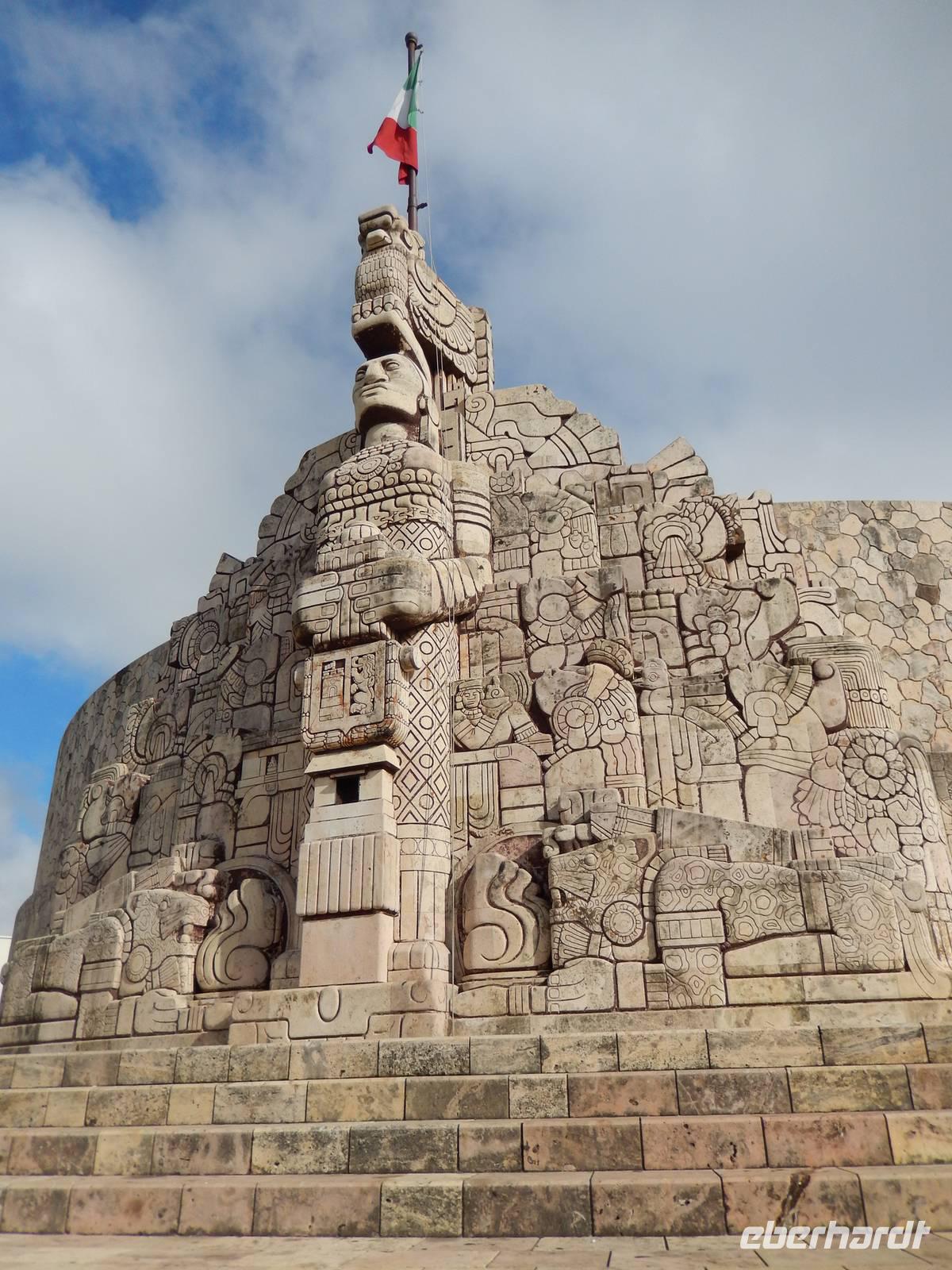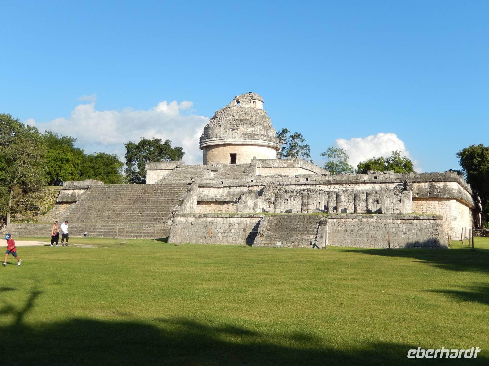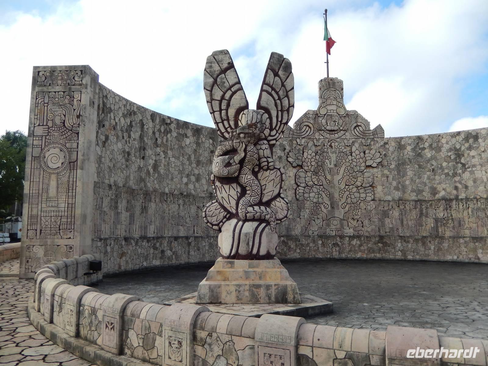 Auf geht's heute zur wohl berühmtesten Maya-Kultstätte nach Chichén Itzá! Doch bevor es soweit ist, haben wir noch ein paar Programmpunkte. Wir beginnen mit einer kleinen Stadtrundfahrt in Merida entlang der Prachtstraßen und mit einem Fotostopp am Fahnendenkmal, einem sehr schönen Denkmal mit historischen Darstellungen und alten Maya-Symbolen. Da das Denkmal inmitten eines Platzes steht, bekommen wir freundlicherweise Unterstützung von der Polizei. Die Straße wird für die Überquerung unserer Gruppe kurzfristig abgesperrt so dass jeder unbeschadet seine Fotos machen kann. Nun setzen wir die Fahrt in Richtung Izamal fort und halten unterwegs in Tahmek, um die Dorfkirche zu fotografieren und in Hoctun. Hier haben wir die Chance, einen echten Maya-Friedhof zu besuchen. Die bunt bemalten Gräber schillern in allen Farben und werden auch hier auf Allerseelen vorbereitet. Jede Begräbnisstätte ist von Form, Schmuck und Farbe her ein Unikat. Nun aber auf nach Izamal, die „Stadt der Hügel". Dieses Mal besuchen wir die Architektonische Zone nicht, sondern „nur" das Franziskaner-Kloster inmitten der Stadt. Mittelpunkt des Baus stellt der Altar zu Ehren der „Heiligen Jungfrau von Izamal" dar. Die Heilige des Ortes zog 1993 sogar Papst Johannes Paul II. an. Wir besichtigen das „Umkleidezimmer" der Heiligen-Statue und ein kleines Museum, bevor wir noch etwas Zeit im Ort verbringen können. Wenn die Sonne zu sehen ist - heute ziemlich häufig - brennt sie auch unbarmherzig herunter. Kurz vor der Mittagszeit starten wir dann also nach Chichén Itzá. Bevor wir die Archäologische Zone erkunden, halten wir in unserem Hotel für heute, welches sich in unmittelbarer Nähe der Kultstätte befindet. Direkt vom Hotel aus, sozusagen über den Hintereingang nehmen wir die nächste Besichtigung in Angriff. Wir spazieren und genießen - meist auf der Suche nach einem schattigen Plätzchen - 3 Stunden den ausführlichen Aufenthalt nebst den ausführlichen Erläuterungen Ruths in Chichén Itzá, dem wohl berühmtesten Ort der Maya-Kultur auf der Halbinsel Yucatan. Nachdem die letzten Steine von uns bezwungen wurden, kehren wir ins Hotel zurück und genießen die freie Zeit am Pool, beim Karten schreiben etc. Unser heutiges Abendessen ist quasi unser Abschiedsessen, da Ruth und Horacio die Gruppe morgen verlassen werden, trotz der uns noch erwartenden Karibik-Tage natürlich ein wehmütiger Augenblick. Das Abendessen und die gesamte Hotelanlage genießen wir in vollen Zügen und freuen uns auf erlebnisreiche letzte Tage in Mexiko.