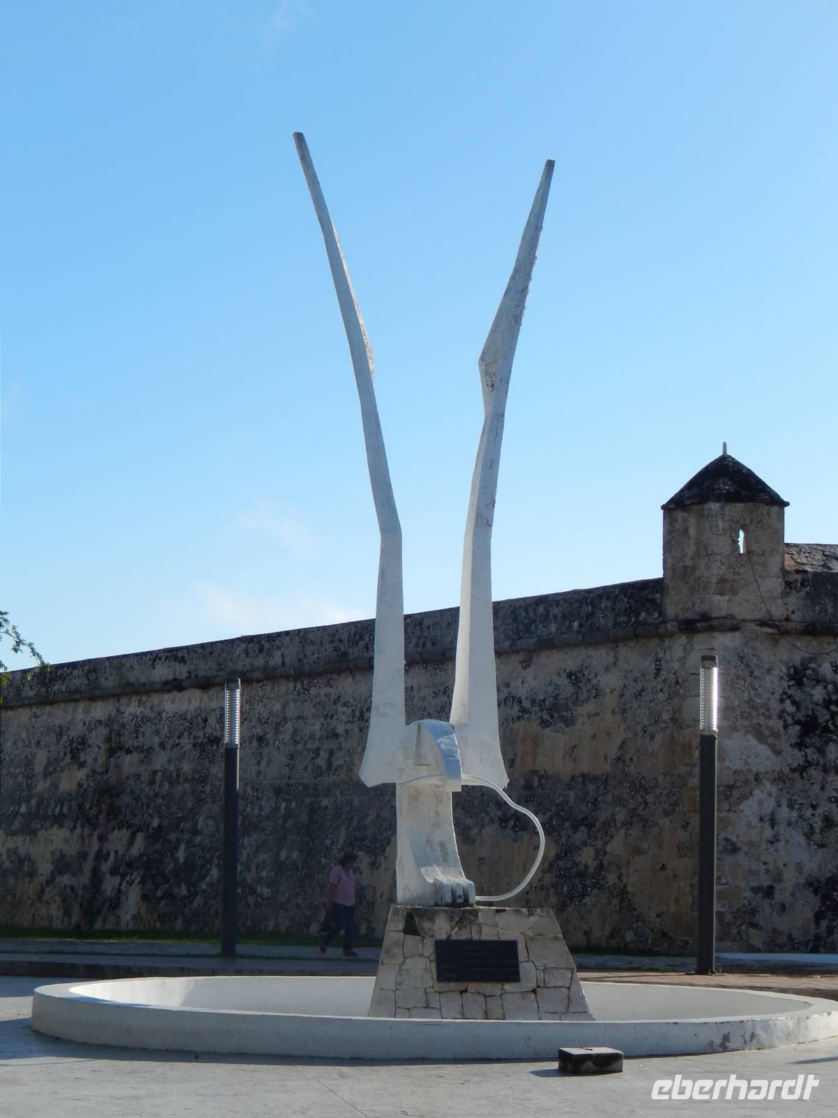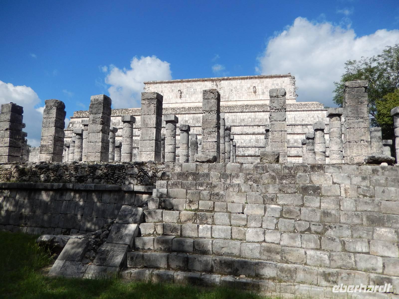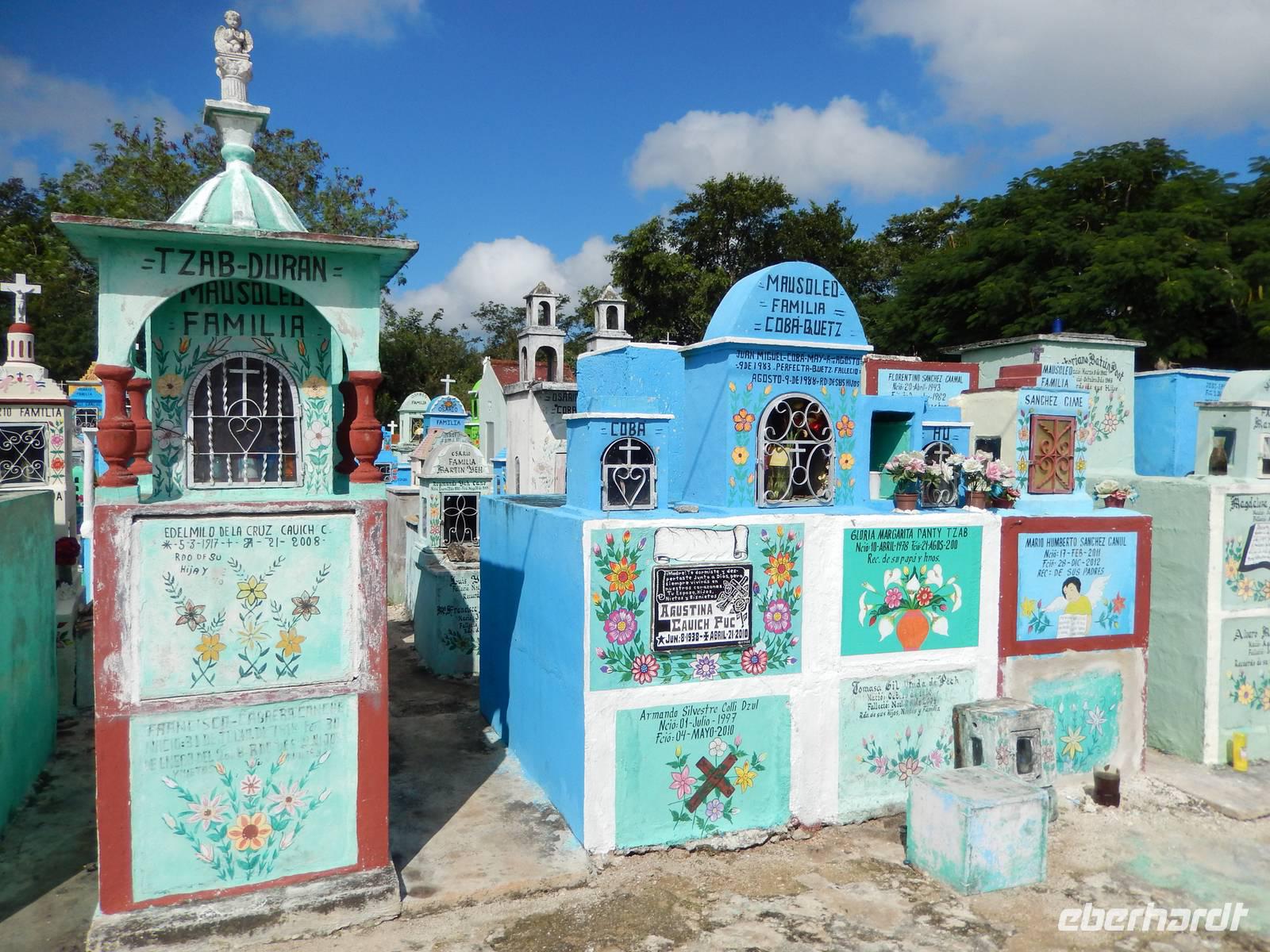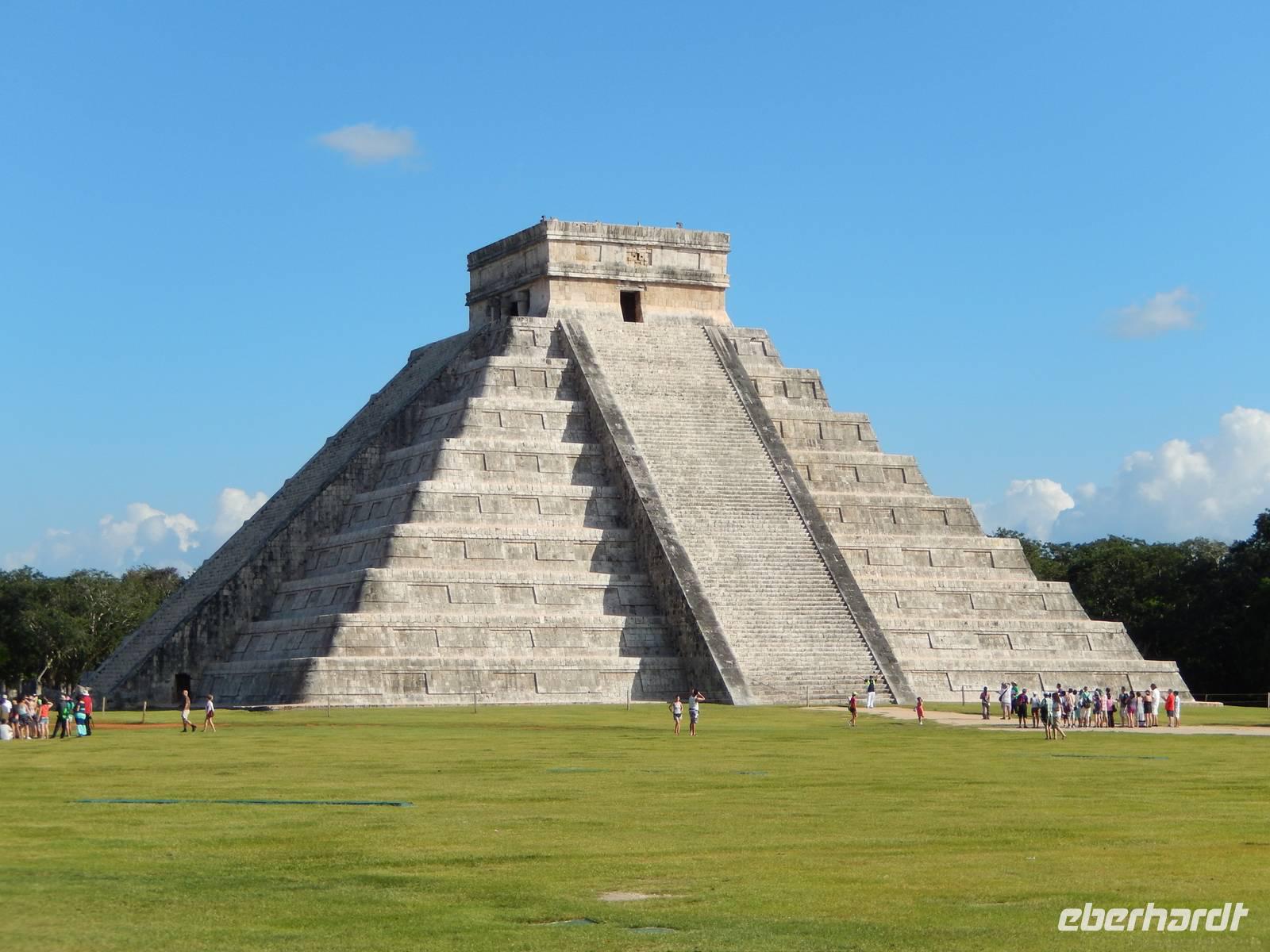 Auf geht's heute zur wohl berühmtesten Maya-Kultstätte nach Chichén Itzá! Doch bevor es soweit ist, haben wir noch ein paar Programmpunkte. Wir beginnen mit einer kleinen Stadtrundfahrt in Merida entlang der Prachtstraßen und mit einem Fotostopp am Fahnendenkmal, einem sehr schönen Denkmal mit historischen Darstellungen und alten Maya-Symbolen. Da das Denkmal inmitten eines Platzes steht, bekommen wir freundlicherweise Unterstützung von der Polizei. Die Straße wird für die Überquerung unserer Gruppe kurzfristig abgesperrt so dass jeder unbeschadet seine Fotos machen kann. Nun setzen wir die Fahrt in Richtung Izamal fort und halten unterwegs in Tahmek, um die Dorfkirche zu fotografieren und in Hoctun. Hier haben wir die Chance, einen echten Maya-Friedhof zu besuchen. Die bunt bemalten Gräber schillern in allen Farben und werden auch hier auf Allerseelen vorbereitet. Jede Begräbnisstätte ist von Form, Schmuck und Farbe her ein Unikat. Nun aber auf nach Izamal, die „Stadt der Hügel". Dieses Mal besuchen wir die Architektonische Zone nicht, sondern „nur" das Franziskaner-Kloster inmitten der Stadt. Mittelpunkt des Baus stellt der Altar zu Ehren der „Heiligen Jungfrau von Izamal" dar. Die Heilige des Ortes zog 1993 sogar Papst Johannes Paul II. an. Wir besichtigen das „Umkleidezimmer" der Heiligen-Statue und ein kleines Museum, bevor wir noch etwas Zeit im Ort verbringen können. Wenn die Sonne zu sehen ist - heute ziemlich häufig - brennt sie auch unbarmherzig herunter. Kurz vor der Mittagszeit starten wir dann also nach Chichén Itzá. Bevor wir die Archäologische Zone erkunden, halten wir in unserem Hotel für heute, welches sich in unmittelbarer Nähe der Kultstätte befindet. Direkt vom Hotel aus, sozusagen über den Hintereingang nehmen wir die nächste Besichtigung in Angriff. Wir spazieren und genießen - meist auf der Suche nach einem schattigen Plätzchen - 3 Stunden den ausführlichen Aufenthalt nebst den ausführlichen Erläuterungen Ruths in Chichén Itzá, dem wohl berühmtesten Ort der Maya-Kultur auf der Halbinsel Yucatan. Nachdem die letzten Steine von uns bezwungen wurden, kehren wir ins Hotel zurück und genießen die freie Zeit am Pool, beim Karten schreiben etc. Unser heutiges Abendessen ist quasi unser Abschiedsessen, da Ruth und Horacio die Gruppe morgen verlassen werden, trotz der uns noch erwartenden Karibik-Tage natürlich ein wehmütiger Augenblick. Das Abendessen und die gesamte Hotelanlage genießen wir in vollen Zügen und freuen uns auf erlebnisreiche letzte Tage in Mexiko.