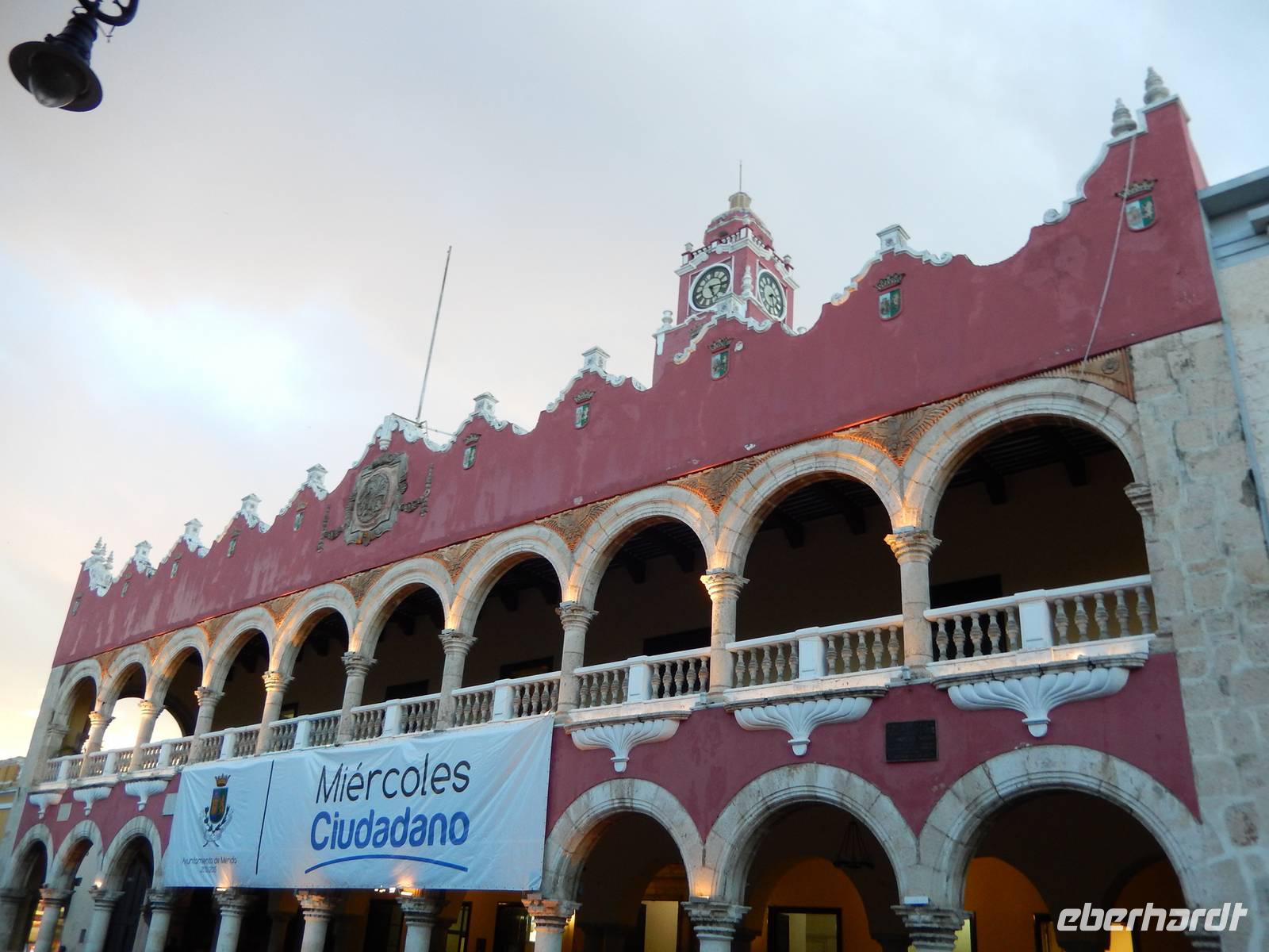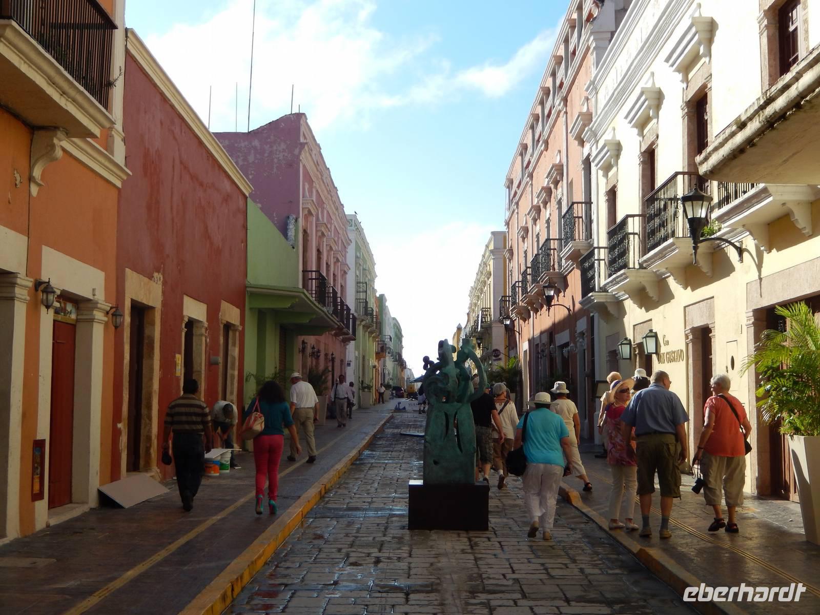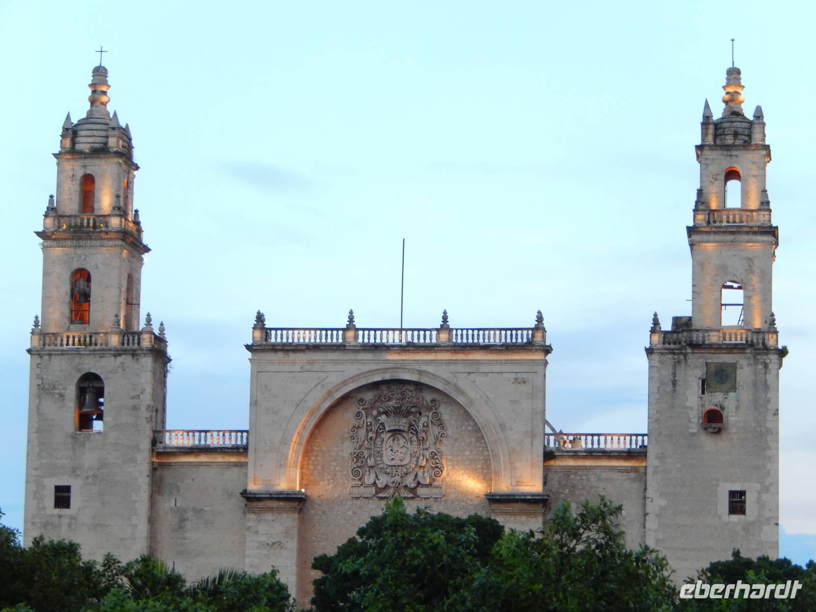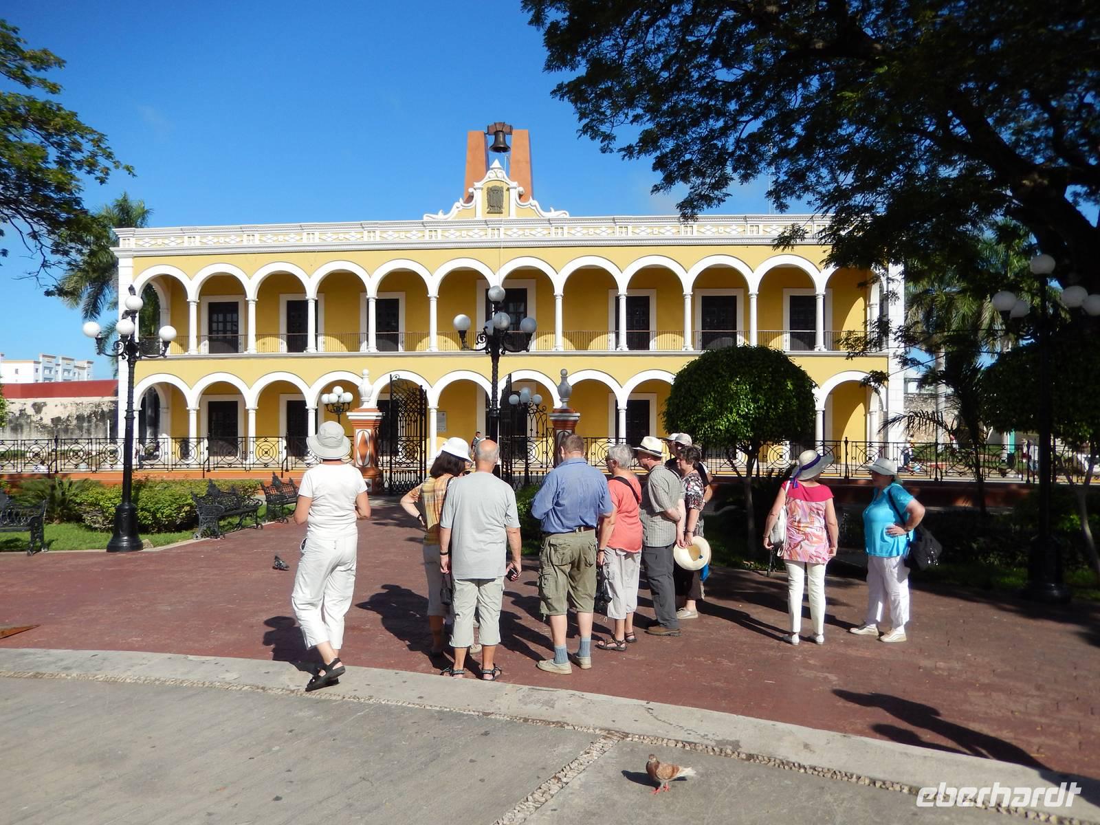 Wie gewohnt sind alle trotz früher Stunde pünktlich am Bus und so können wir mit der Erkundung der Weltkulturerbe-Stadt Campeche beginnen. Die Sonne lacht uns, auch wenn die ersten Wolken schon am Himmel zu sehen sind. Bei einem kleinen Stadtspaziergang in der Kulturerbe-Innenstadt sehen wir Teile der ehemaligen Stadtmauer und neu restaurierte Abschnitte, das Meeres-Tor, die Fußgängerstraße mit wunderschönen Kolonialgebäuden und natürlich den Zocalo mit der Kathedrale. Direkt zur Kathedrale gehört auch ein kleines Museum, was wir uns anschauen und wo wichtige Reliquien zu sehen sind. Nach dem Rundgang besteigen wir den Bus und entlang des Golfs von Mexiko reisen wir zur nächsten Maya-Stätte nach Uxmal. Hier angekommen geht es wieder auf zu sportlichen Höchstleistungen im Sinne der Wissenserweiterung. Eine wunderbare Anlage erwartet uns mit deutlich sichtbaren Verzierungen der Maya an den einzelnen Gebäuden. Die berühmten Chaac-Masken zieren die meisten Gebäude und wir bewundern die „Pyramide des Zauberers", den Gouverneurs-Palast, den Ballspielplatz - diesmal mit Ringen - das Schildkrötenhaus und um einen totalen Überblick zu genießen, kraxeln die meisten auf die Sonnenpyramide. Dies alles bei diesmal etwas trockenerer, aber nach wie vor sehr heißer Luft. Und nicht zu vergessen die zahlreichen Leguane, die wir in der Anlage bewundern können und die diese Maya-Stadt inzwischen ihr zu Hause nennen. Erschöpft aber glücklich und mit endlich schönen Postkarten ausgestattet, fahren wir zu unserem heutigen Mittagessen auf der Hacienda Ochil. Wir fahren über eine Passhöhe und stoppen im Künstlerdorf Muna noch für ein paar Fotos von typischen heutigen Maya-Häusern (vollkommen strohbedeckt) bevor wir unser 3-Gamg-Menü auf der ehemaligen Sisal-Hacienda, die heute zum Restaurant umfunktioniert ist, genießen. Pünktlich zur Mittagszeit melden sich dann auch die tropischen Schauer wieder und wir hoffen, dass wir beim bevorstehenden Stadtrundgang am Nachmittag in Merida trocken bleiben... Dort angekommen, setzt uns Horacio am Zocalo ab und übernimmt den Check-In der Gruppe im Hotel während wir eine Führung in der Kathedrale und im Regierungs-Palast des Bundesstaates Yucatan durch Ruth genießen. Wie immer bleiben wir trocken, denn der Regenschauer kommt, während wir allerlei Interessantes über die Geschichte anhand der tollen Wandbilder erfahren. Anschließend besteigen wir noch den Balkon des Rathauses für tolle Blicke auf die Kathedrale im Licht der untergehenden Sonne bevor wir gemeinsam zum Hotel laufen. Die Koffer stehen auf dem Zimmer und so können wir unsere Freizeit direkt beginnen. Die Hälfte der Gruppe geht zu einem gemeinsamen Abendessen im Restaurat Los Pancho's. Wir essen und trinken gut in gemütlicher Atmosphäre und erleben als Nachtisch die Zubereitung eines "Café Maya" mit über Kaskaden fließenden Kaffee und einer kleinen Show der Crew. Leider kann ich mein Telefon nicht richtig bedienen, so dass es keine Beweise für die Kaffee-Zeremonie gibt... Ein schöner Abend neigt sich dem Ende.