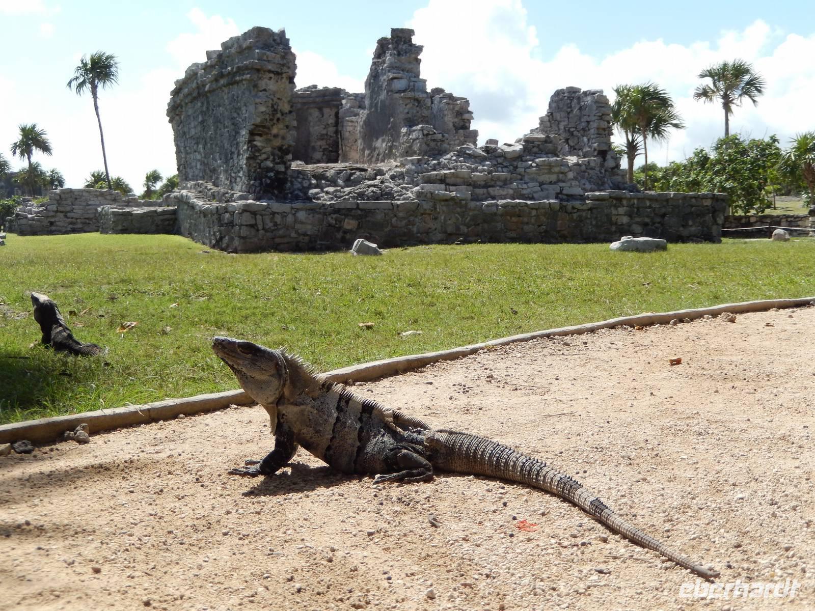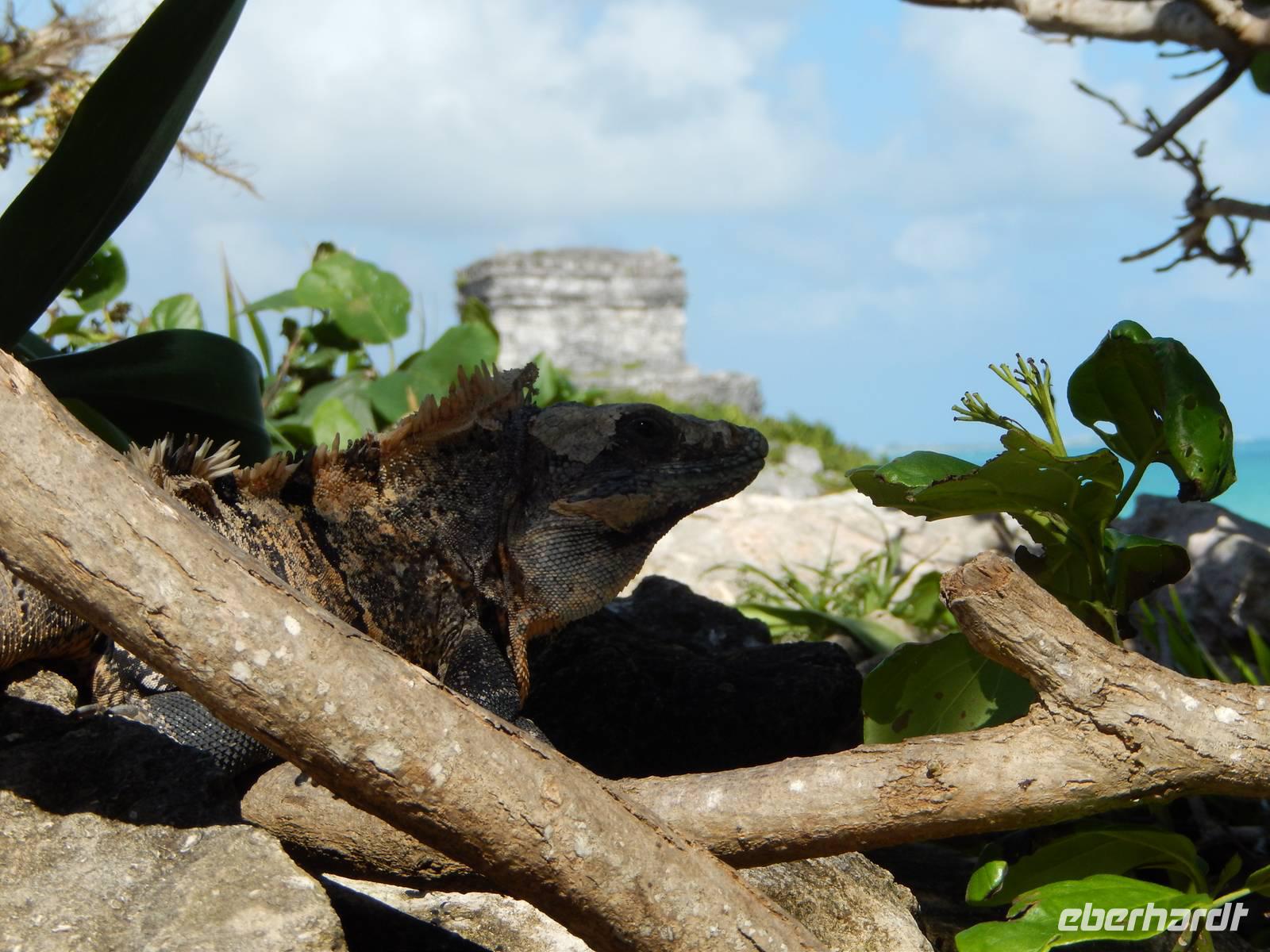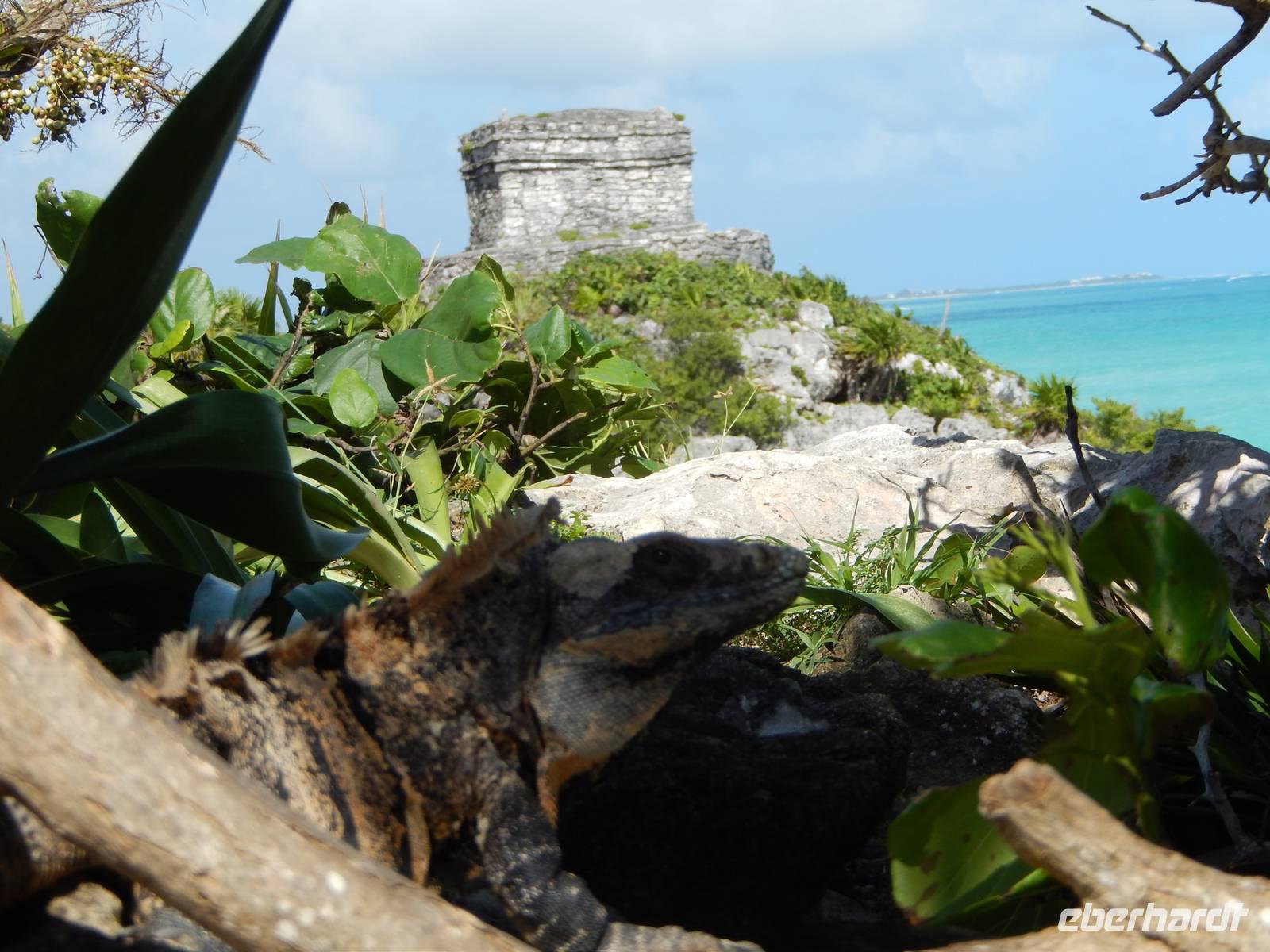Ungewöhnlich spät und entspannt - erst gegen 09.00 Uhr - brechen wir zu unseren letzten gemeinsamen Etappen auf. Der Weg führt uns zuerst nach Valladolid, wo wir eine Pause einlegen und über den Zocalo schlendern. Hier gibt es ganz romantische Sitzmöbel im Park - die Liebessessel. Natürlich entsteht hier das eine oder andere - gelegentlich auch nicht ernst gemeinte - witzige Foto. Bevor wir die Touristenhochburgen am Karibikstrand erreichen bleibt hier auch nochmal Zeit, relativ preisgünstig mexikanische Souvenire zu erwerben. Jetzt müssen wir aber weiter nach Tulum - einer weiteren archäologischen Zone. Inzwischen brennt die Sonne unbarmherzig auf uns und wir versuchen in Tulum von Schatten zu Schatten zu springen. Aber vorsichtig: fast überall gibt es Leguane, vom Baby bist zur mächtigen großen Echse. Ruth erklärt mit Engelsgeduld auch noch diese Bauwerke und wir sind vor allem vom Castello und dem Windgott-Palast fasziniert. In diesem Ort der Spätklassik verbringen wir etwas mehr als 2 Stunden und schützen uns vor der Sonne in einer kleinen Bimmelbahn, die uns zum Eingang der archäologischen Zone und zurück bringt. Am Nachmittag wird es dann tränenreich, denn wir müssen uns schweren Herzens von Ruth und Horacio trennen - von beiden eine sensationelle Arbeit, die wir genießen durften. Ruth hilft uns noch beim Check-In und nach den Umarmungen tauchen wir ein in eine völlig neue Welt. Wir beziehen die Zimmer in unserem All-inklusive-Hotel und stürzen uns direkt ins Getümmel bzw. die meisten erstmal ans Buffet. Für die kommenden 2 Tage ist Essen & Trinken in allen Ausführungen kostenfrei. Natürlich wird auch umgehend das Wasser im Golf von Mexiko sofort getestet und abends treffen sich die meisten - trotz insgesamt 800 Zimmern im Objekt - zu einem Abschluss-Umtrunk bei Live-Musik.