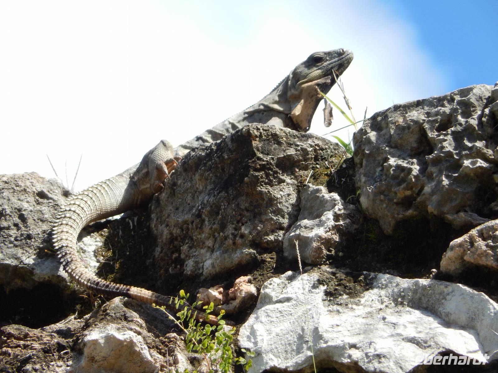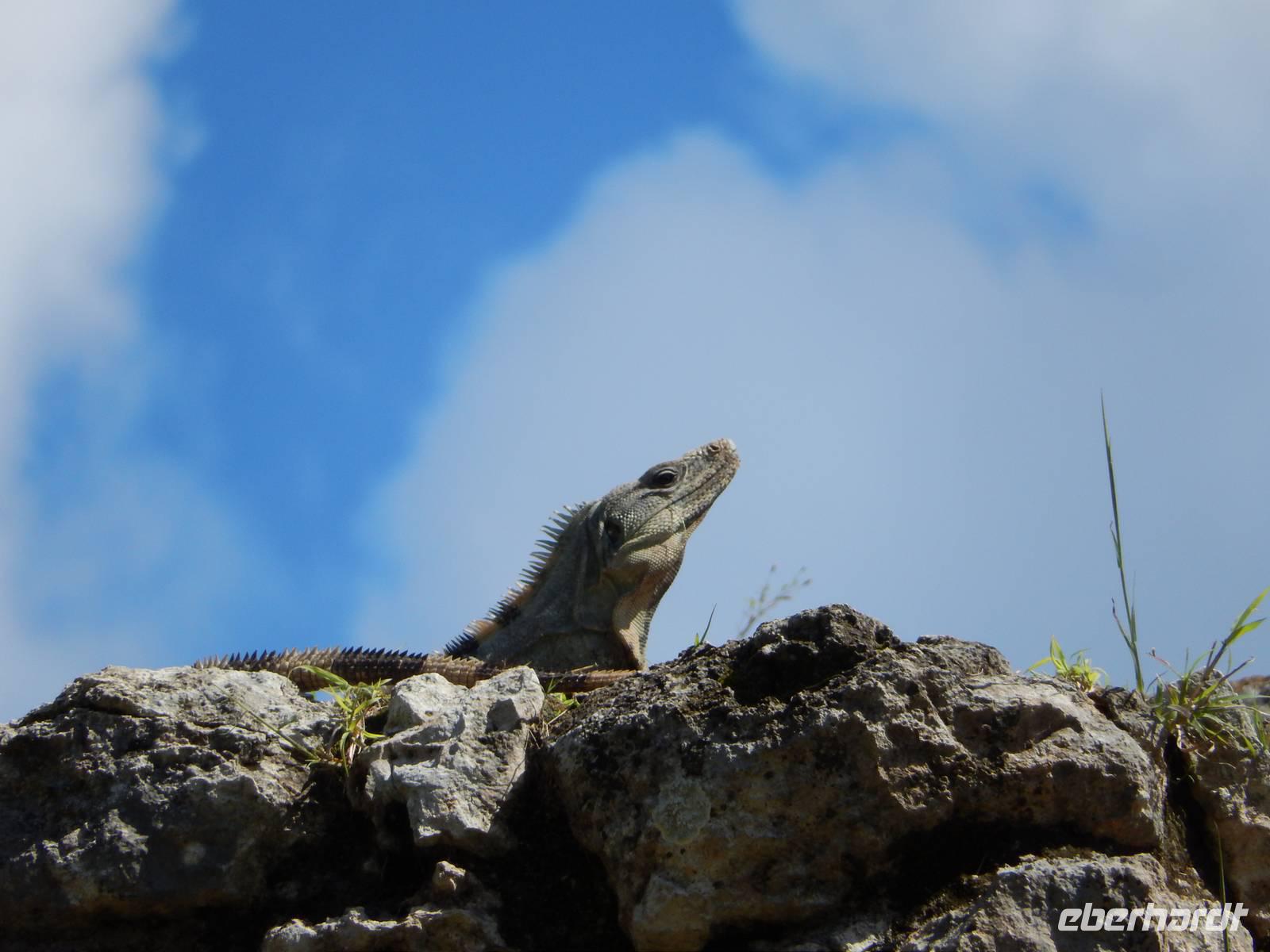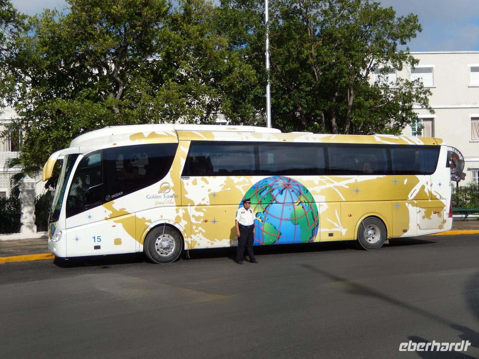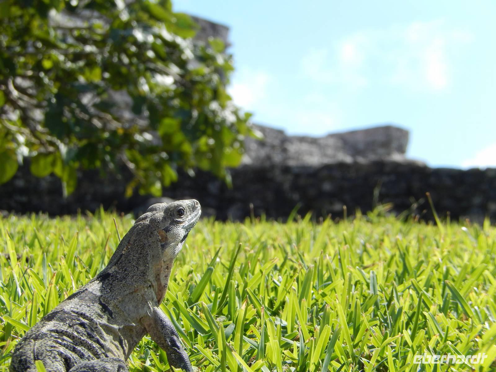 Ungewöhnlich spät und entspannt - erst gegen 09.00 Uhr - brechen wir zu unseren letzten gemeinsamen Etappen auf. Der Weg führt uns zuerst nach Valladolid, wo wir eine Pause einlegen und über den Zocalo schlendern. Hier gibt es ganz romantische Sitzmöbel im Park - die Liebessessel. Natürlich entsteht hier das eine oder andere - gelegentlich auch nicht ernst gemeinte - witzige Foto. Bevor wir die Touristenhochburgen am Karibikstrand erreichen bleibt hier auch nochmal Zeit, relativ preisgünstig mexikanische Souvenire zu erwerben. Jetzt müssen wir aber weiter nach Tulum - einer weiteren archäologischen Zone. Inzwischen brennt die Sonne unbarmherzig auf uns und wir versuchen in Tulum von Schatten zu Schatten zu springen. Aber vorsichtig: fast überall gibt es Leguane, vom Baby bist zur mächtigen großen Echse. Ruth erklärt mit Engelsgeduld auch noch diese Bauwerke und wir sind vor allem vom Castello und dem Windgott-Palast fasziniert. In diesem Ort der Spätklassik verbringen wir etwas mehr als 2 Stunden und schützen uns vor der Sonne in einer kleinen Bimmelbahn, die uns zum Eingang der archäologischen Zone und zurück bringt. Am Nachmittag wird es dann tränenreich, denn wir müssen uns schweren Herzens von Ruth und Horacio trennen - von beiden eine sensationelle Arbeit, die wir genießen durften. Ruth hilft uns noch beim Check-In und nach den Umarmungen tauchen wir ein in eine völlig neue Welt. Wir beziehen die Zimmer in unserem All-inklusive-Hotel und stürzen uns direkt ins Getümmel bzw. die meisten erstmal ans Buffet. Für die kommenden 2 Tage ist Essen & Trinken in allen Ausführungen kostenfrei. Natürlich wird auch umgehend das Wasser im Golf von Mexiko sofort getestet und abends treffen sich die meisten - trotz insgesamt 800 Zimmern im Objekt - zu einem Abschluss-Umtrunk bei Live-Musik.