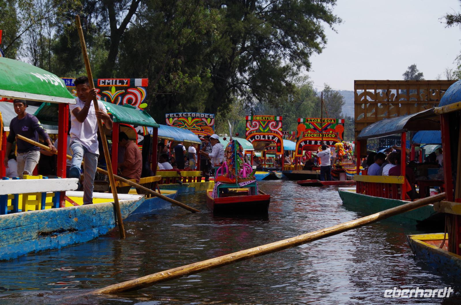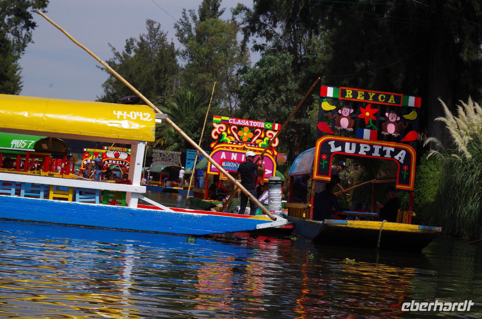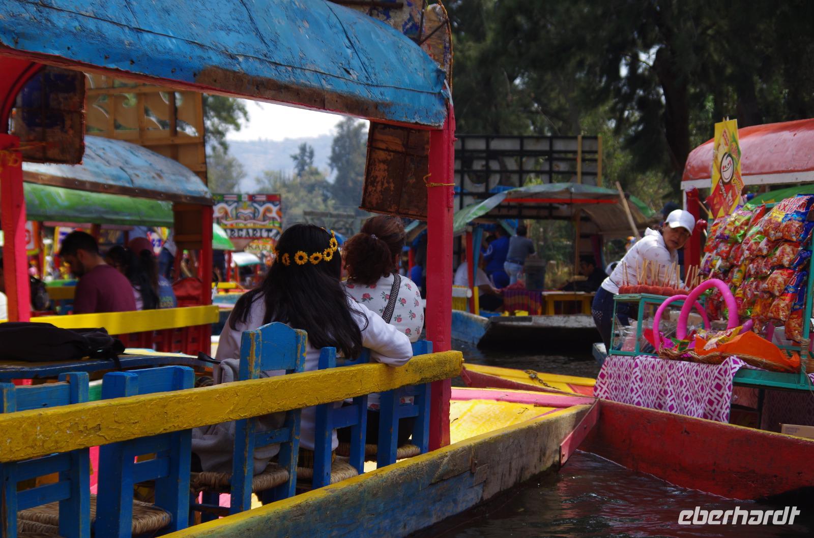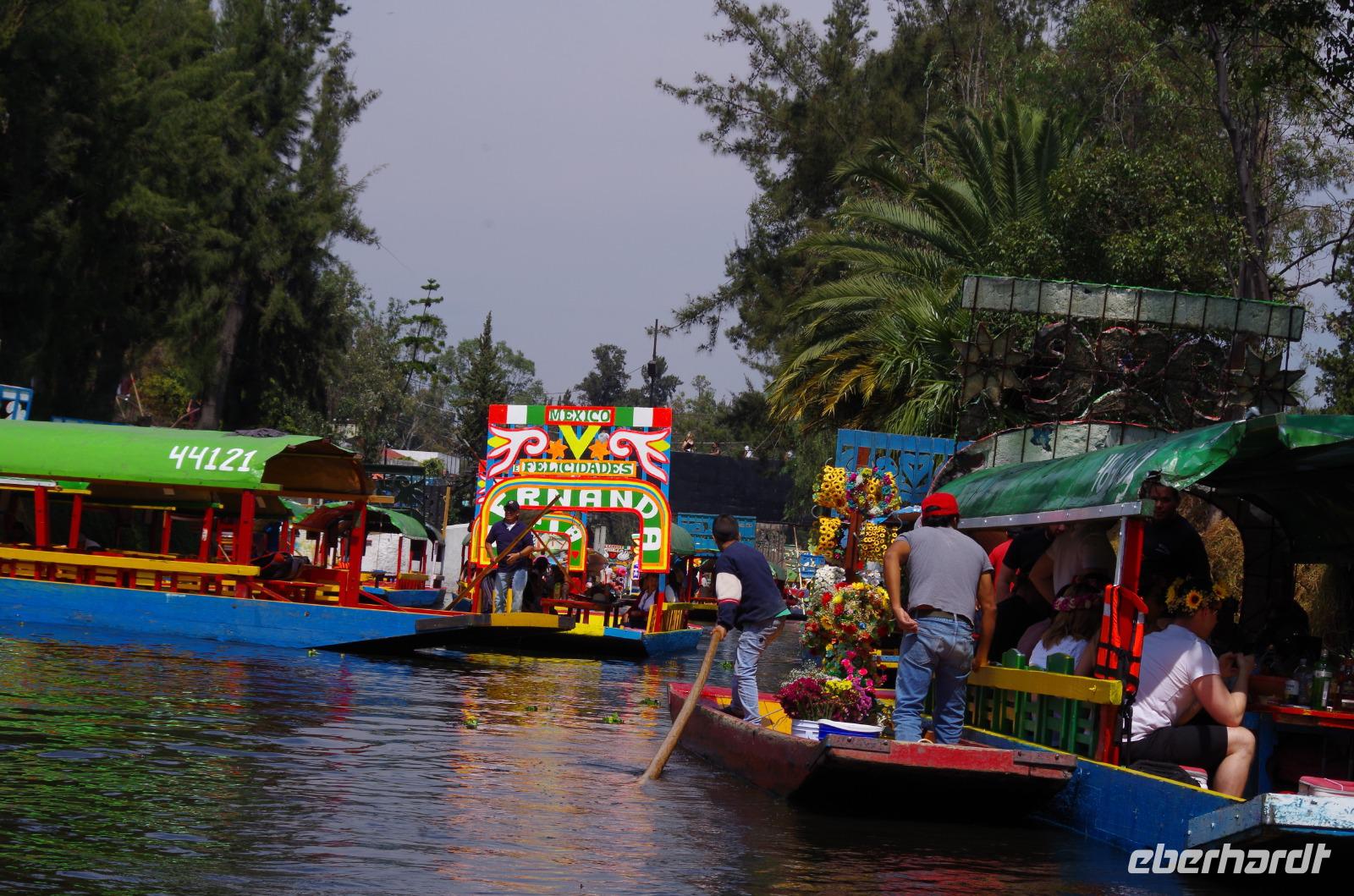 Im Anschluss machten wir uns auf den Weg Xochilmento und unternahmen in den Kanälen, welche einst von den Azteken errichtet wurden, eine Bootsfahrt. Dort fand auch gleich unser Mittagessen statt. Es gab Reis, Huhn und Schokochilisoße sowie Tortillas, Kaktussalat, Guacamole und einiges mehr. Es war der reinste Trubel in den Kanälen unzählige Boote waren unterwegs. Ein Aneinanderstoßen war hier nicht ausgeschlossen. Auf viele Booten wurde Musik gespielt, gekocht oder es wurden die verschiedensten Dinge verkauft.