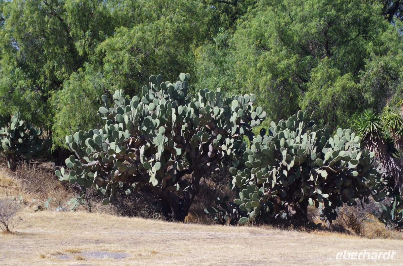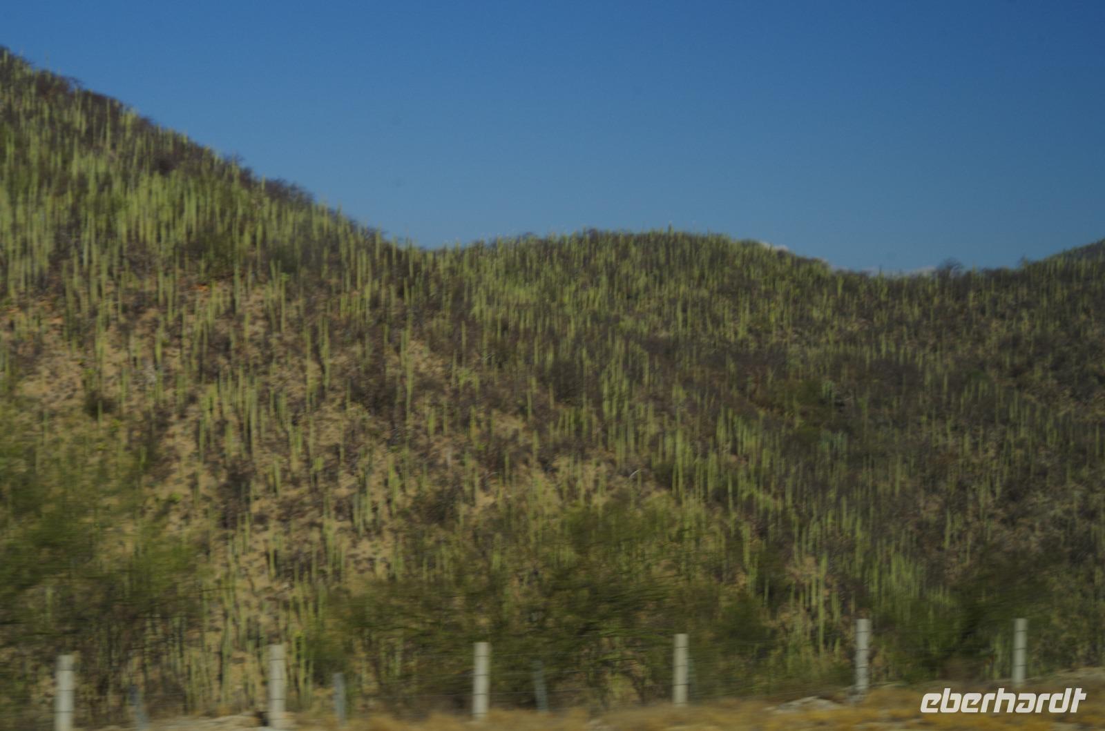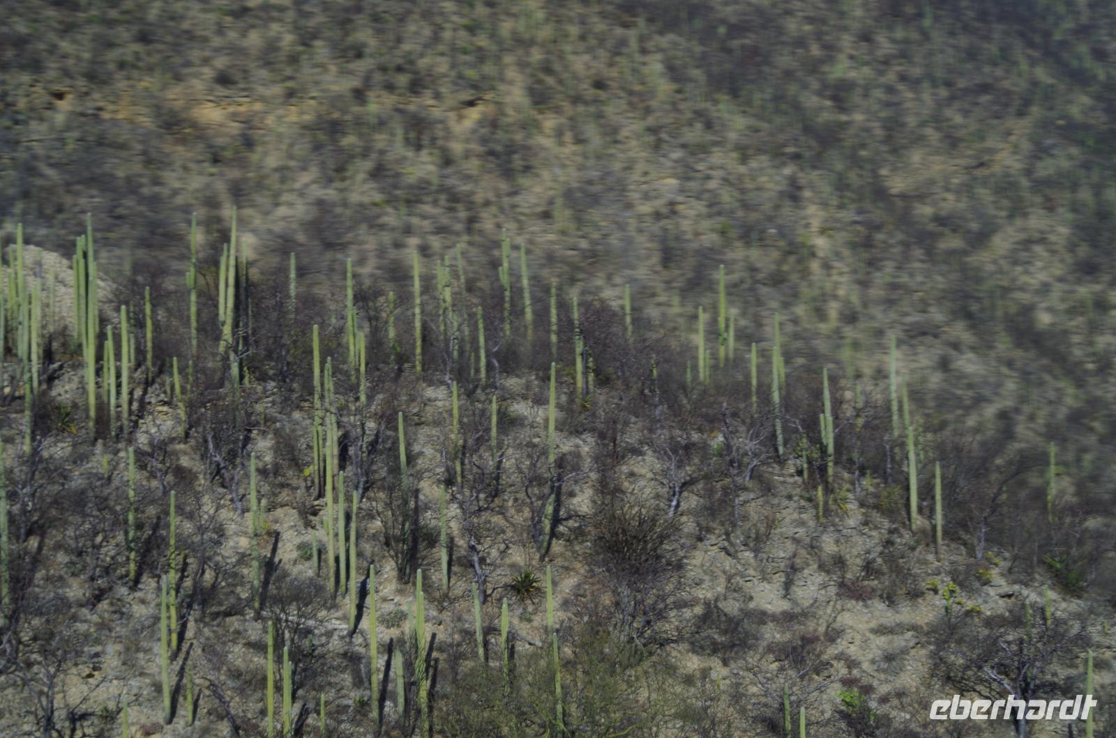 Nach einer Mittagpause stand dann unsere lange Fahrt bis nach Oaxca an. Diese führte uns durch das Gebiet der Korbflechter und später durch Tehuacán. Die Region ist bekannt für das Mineralwasser und für viele Fossilien. Während der Fahrt konnten wir auch unzählige, riesengroße Kakteen betrachten. An ganzen Kakteenwäldern fuhren wir vorbei.