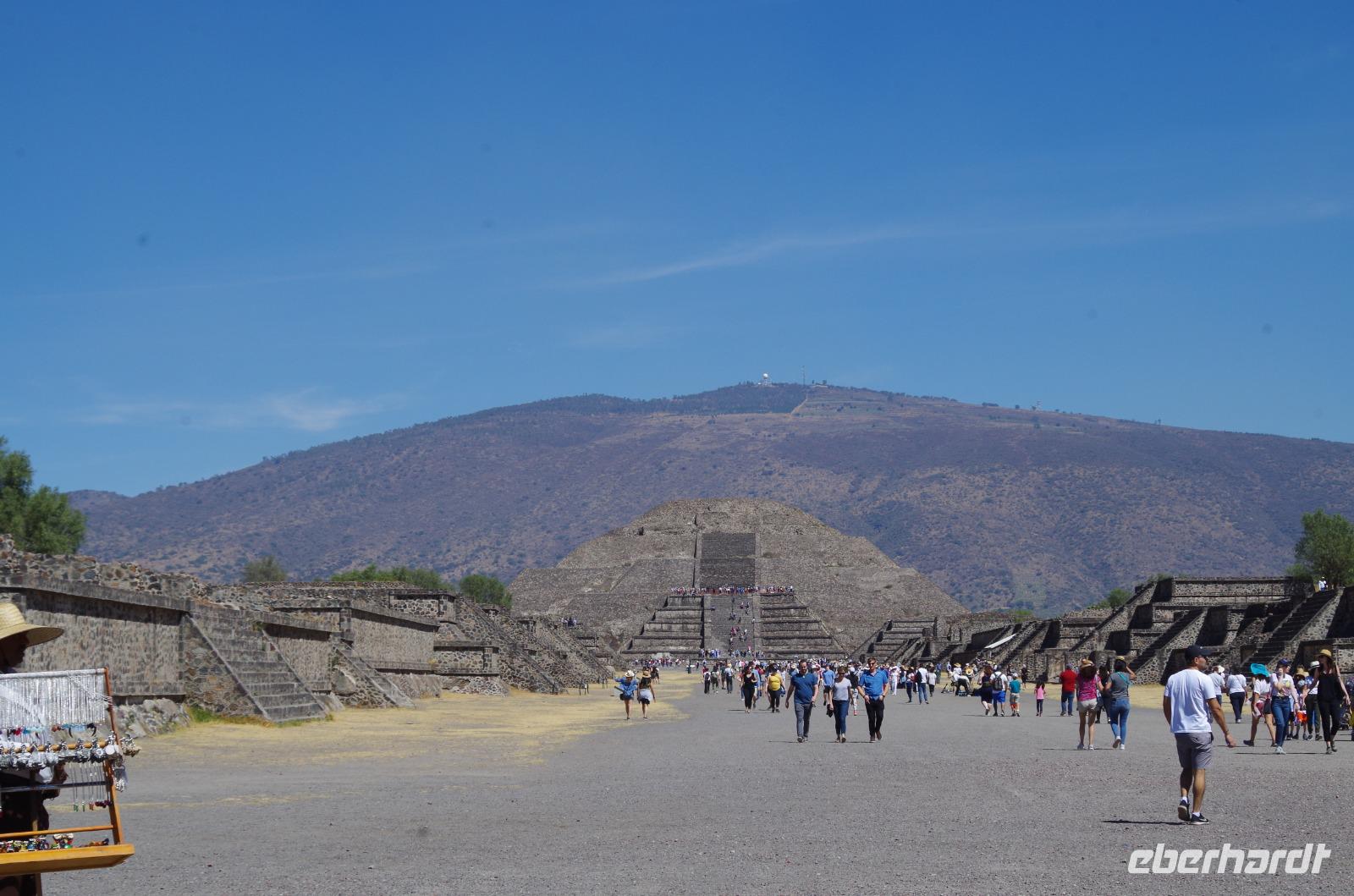Anschließend fuhren wir nach Teotihuacan, die wohl am besten geplante mesoamerikanische Stadt. Mit etwa 200.000 Bewohnern in der Blütezeit von 200 - 500 nach Christus war es auch die größte Stadt der damaligen Zeit. Wir starteten unseren Rundgang an der Mondpyramide. Sie schließt im nördlichen Teil die Straße der Toten ab und ist 45 Meter hoch. Einige Gäste gingen auch die vielen Stufen hinauf, um den Ausblick zu genießen. Auf dem Weg zur Sonnenpyramide erschien die Mondpyramide immer kleiner. Auch der Berg im Hintergrund, wirkte immer größer und ließ die Mondpyramide schrumpfen. Während unseres Spazierganges auf der Anlage war es sehr sonnig und warm. Hier erschraken wir zum ersten Mal über das Geräusch des Jaguars, welches durch eine Art Pfeife ertönte. Diese werden auf vielen Ausgrabungsstätten verkauft und uns also noch im Laufe unserer Rundreise noch öfter verfolgen.