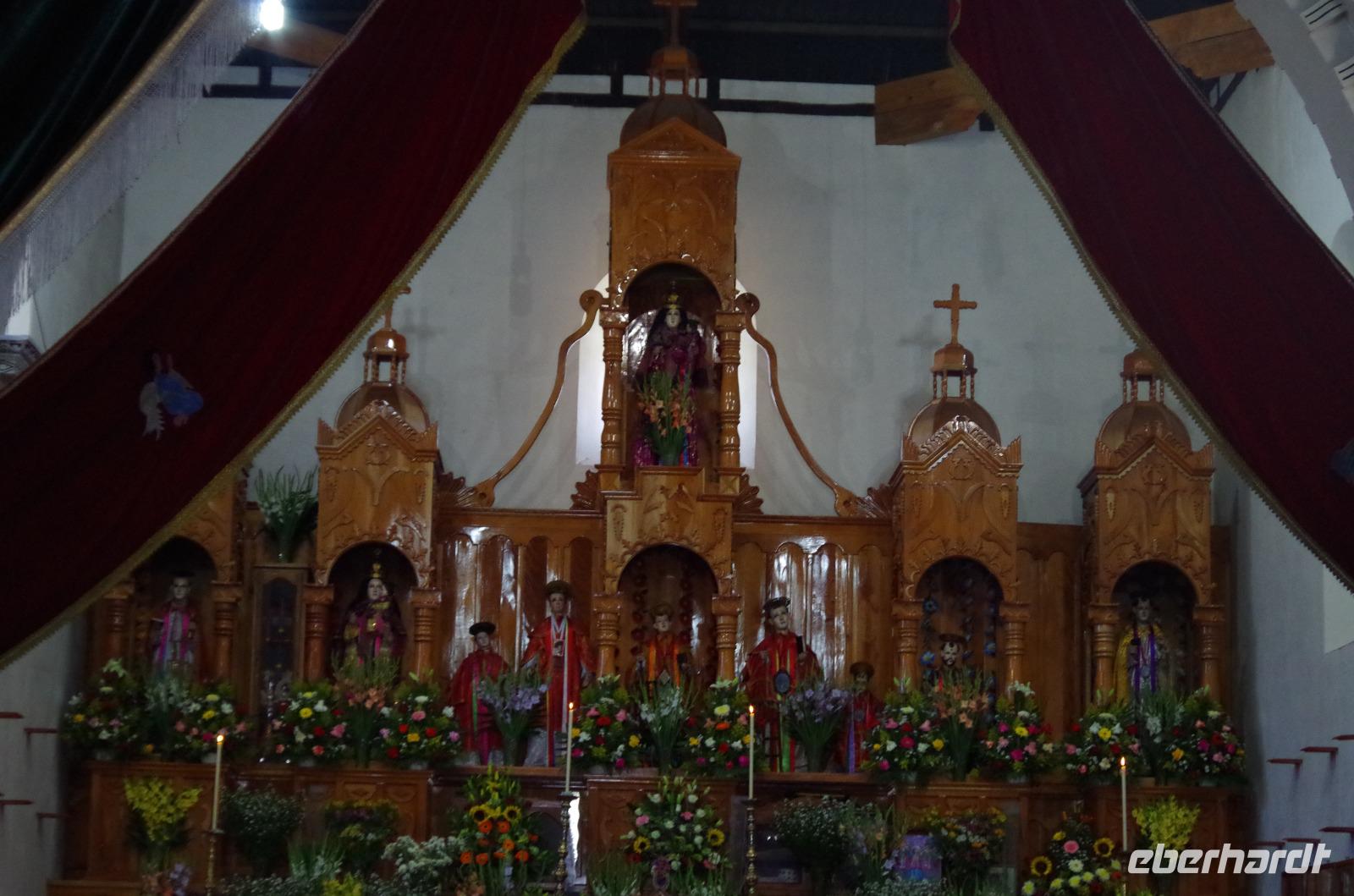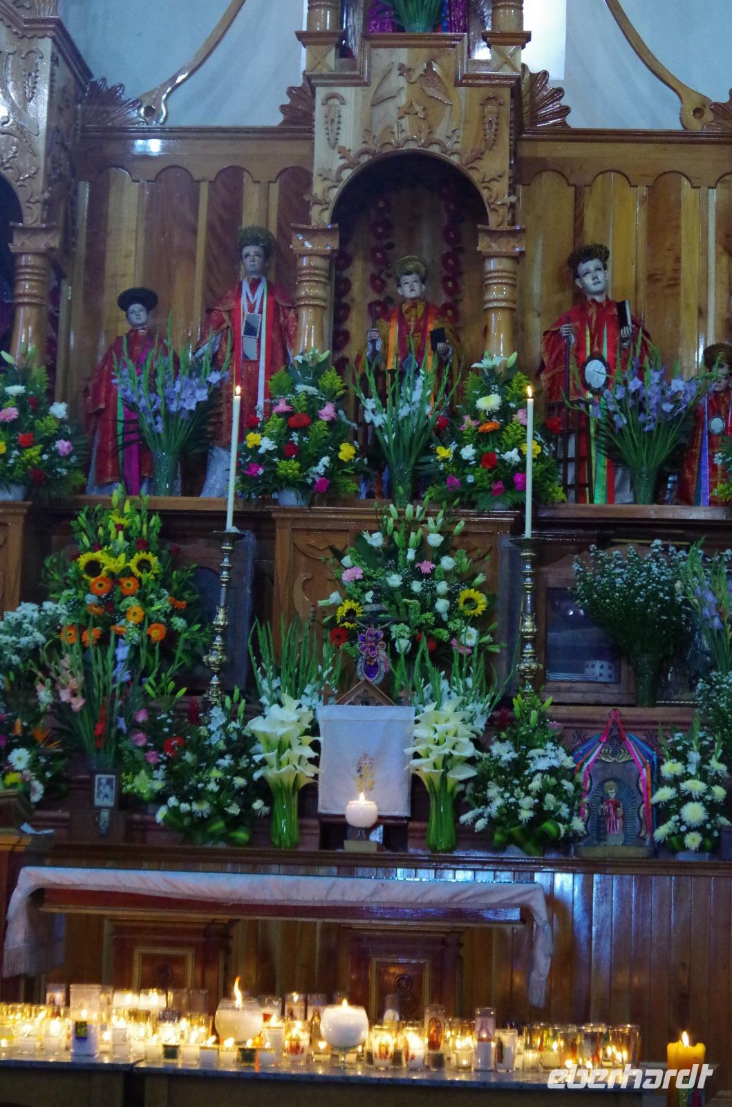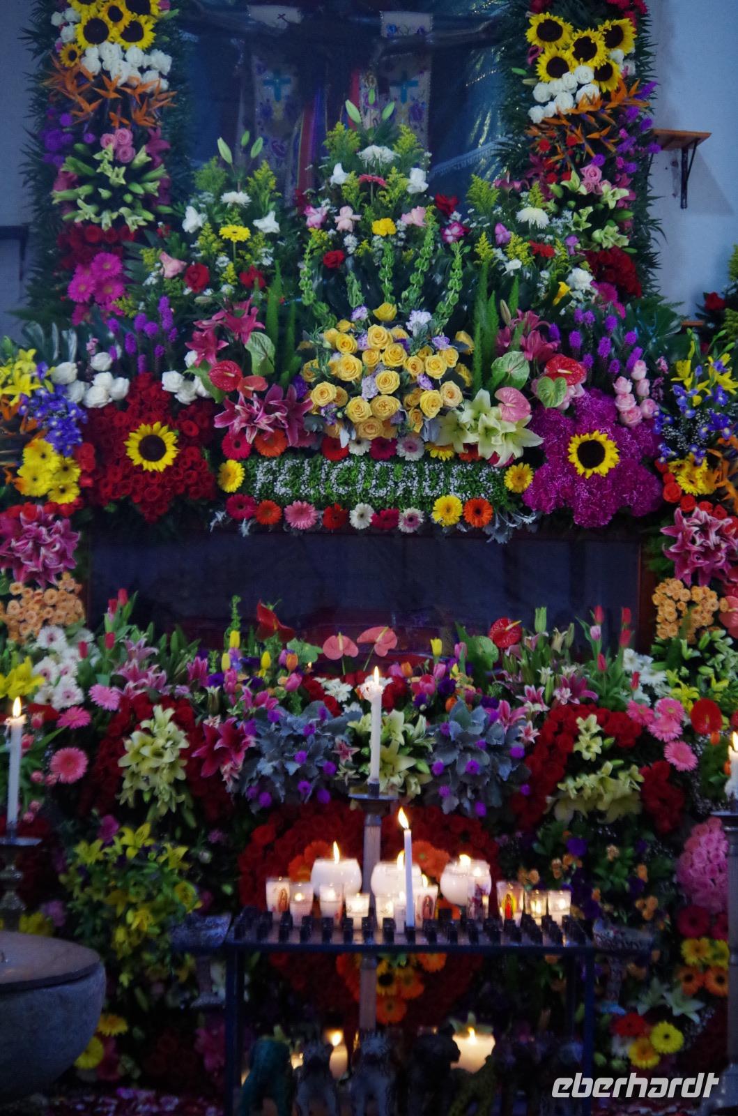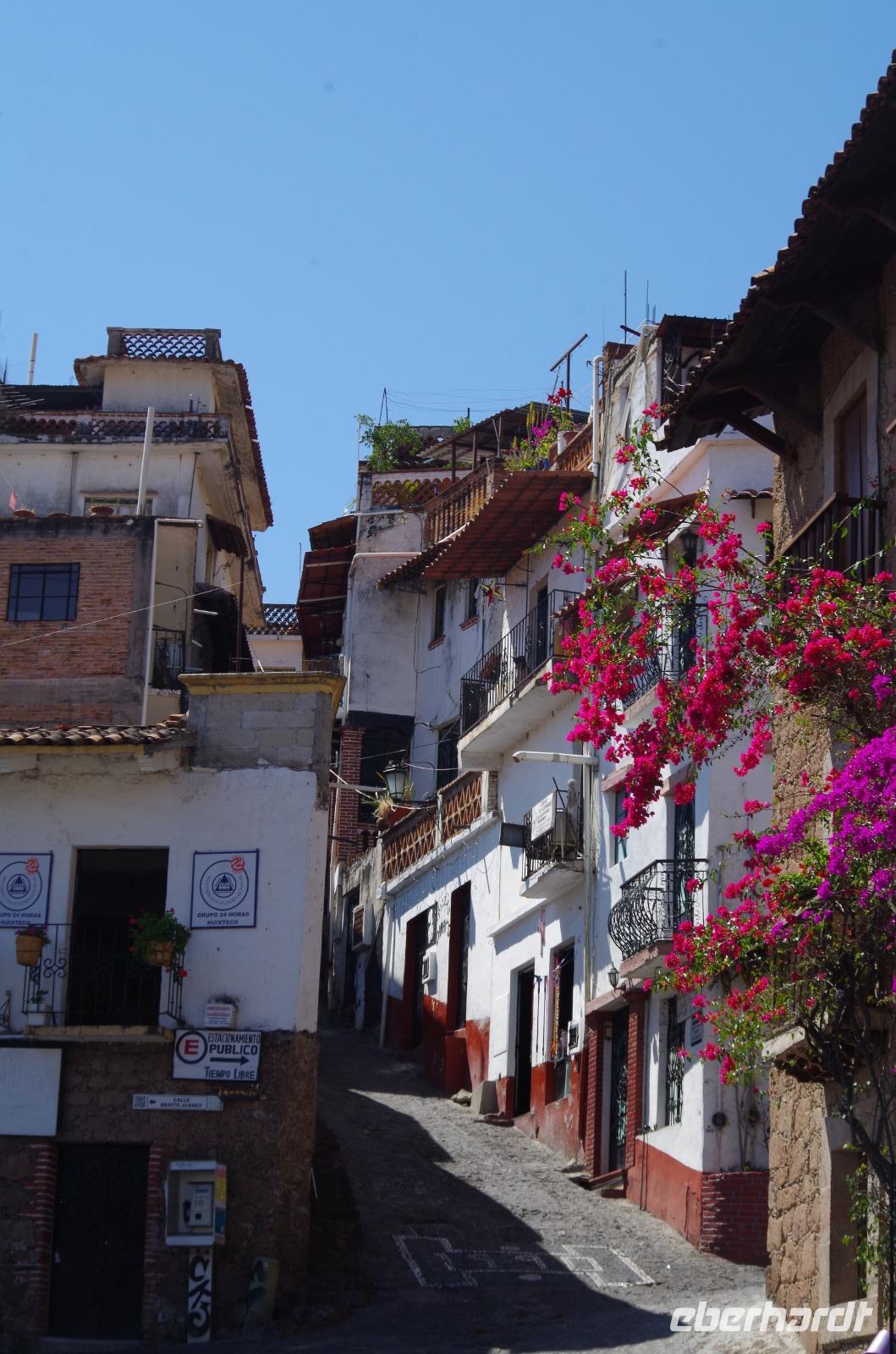 Zu Fuß spazierten wir zum Zócalo und lernten das Flair der wirklich schönen, kleinen Stadt kennen. In den vielen, kleinen Gassen blühten bunte Blumen. Wir besuchten dann noch die Kirche von Taxco. Interessant ist, dass in den Kirchen in Mexiko sehr häufig Joachim und Anna, die Eltern von Maria abgebildet werden, so auch in dieser Kirche. In den europäischen Kirchen ist das nicht zu finden.