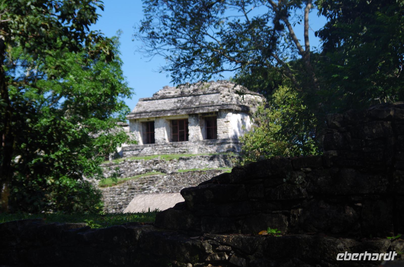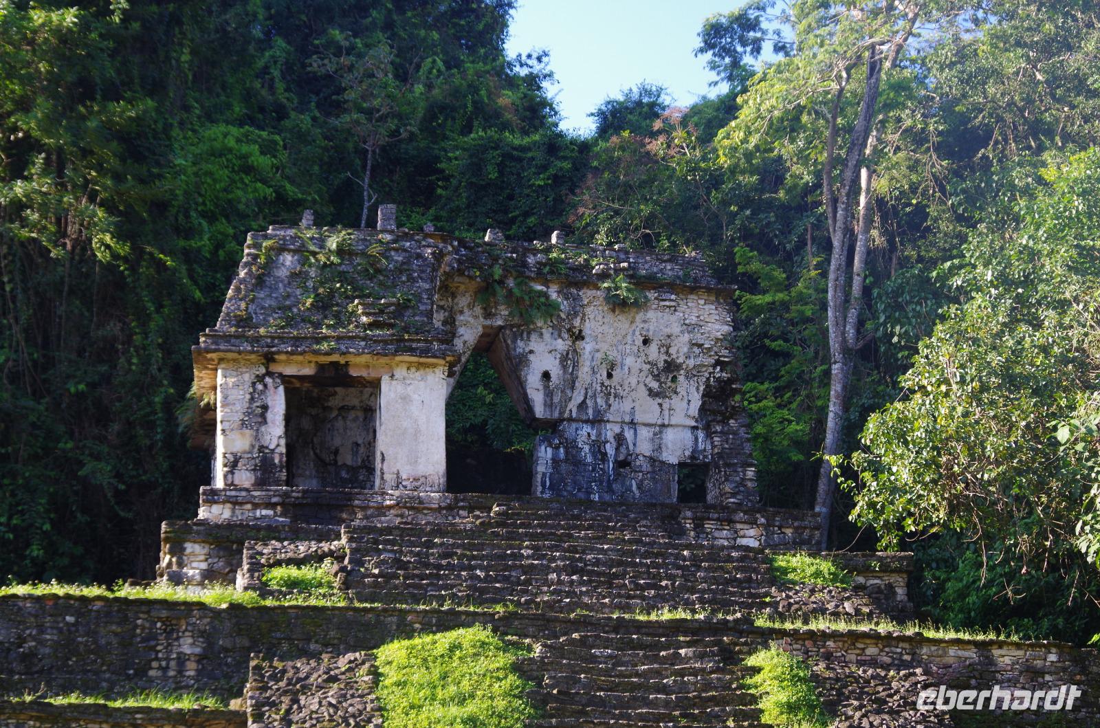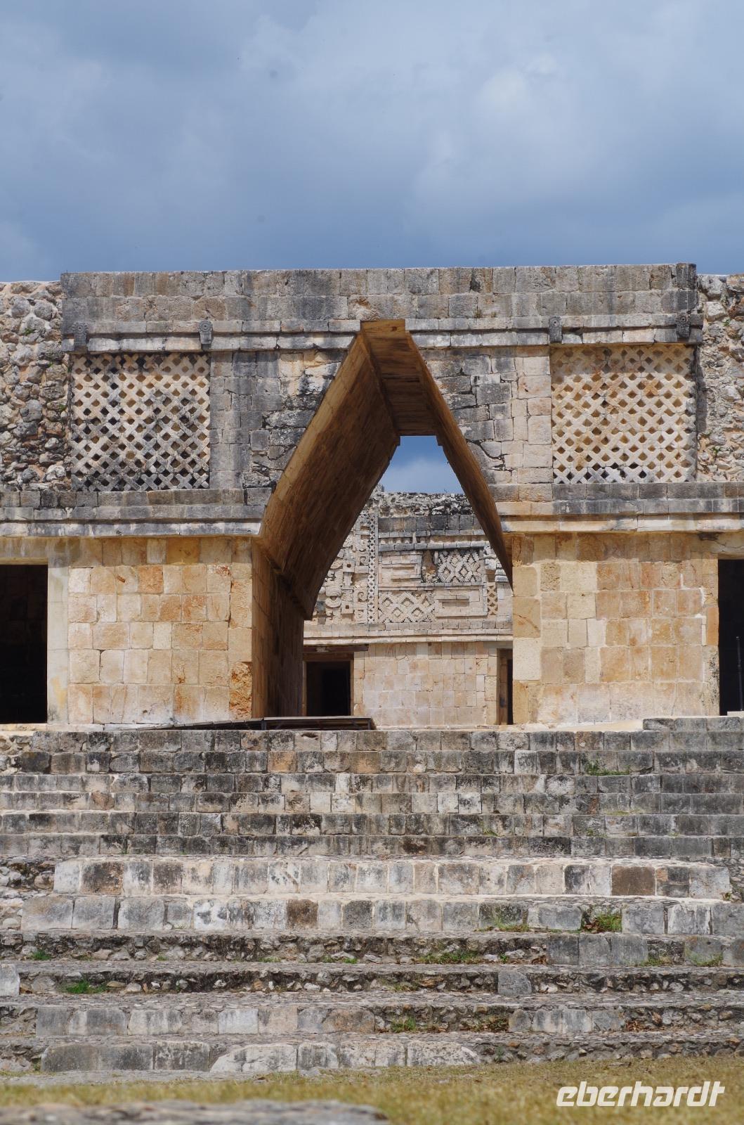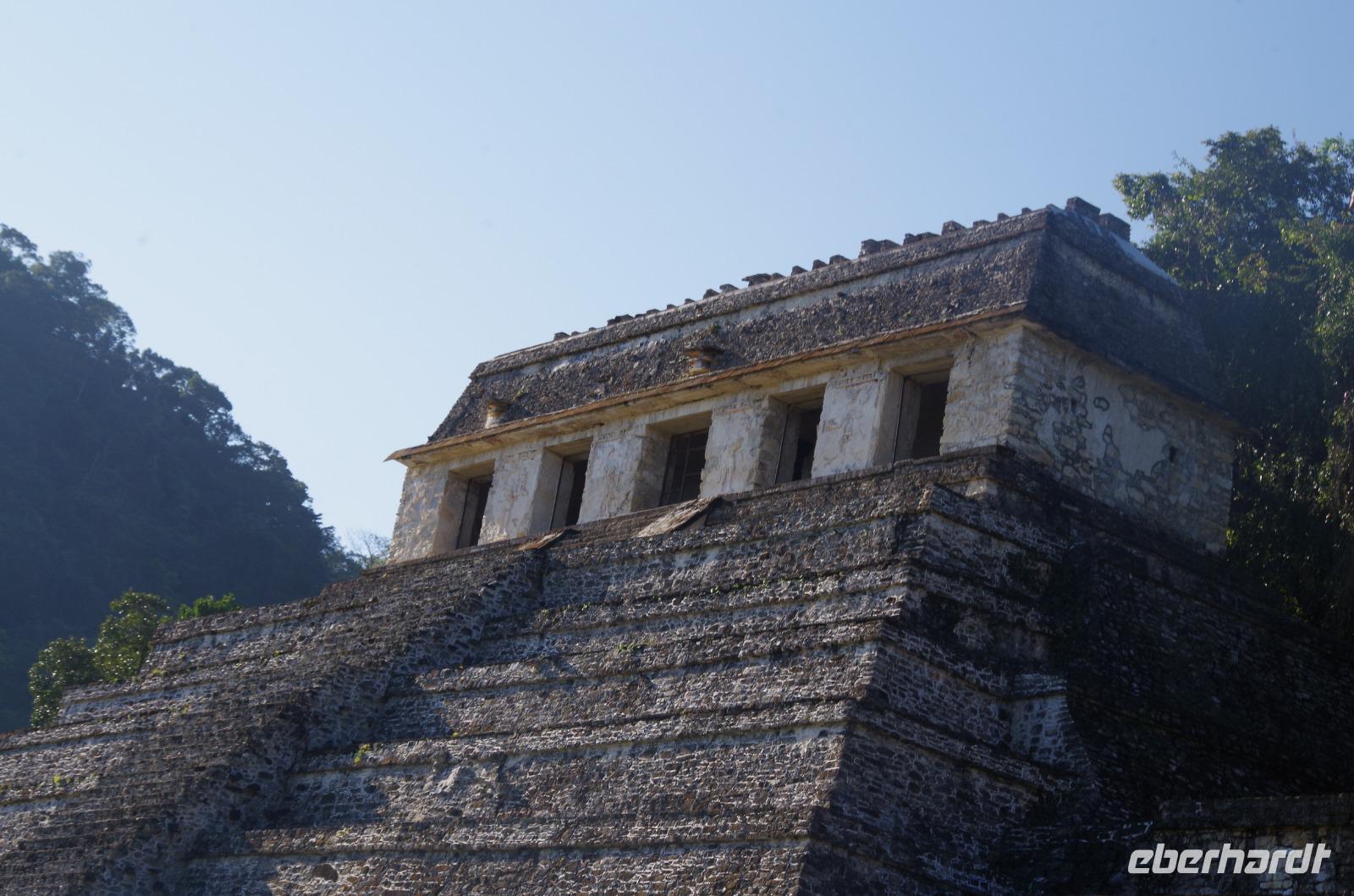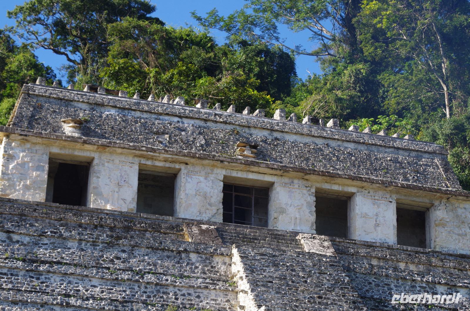 Wir bestiegen dann den Palast, wo wir viele Fenster in Form des Buchstabens T sehen konnten. Fenster in Gebäuden waren in der mesoamerikanischen Zeit sehr ungewöhnlich. Von hier aus konnten wir auch den Turm des Palastes mit dem Altar sehen.
