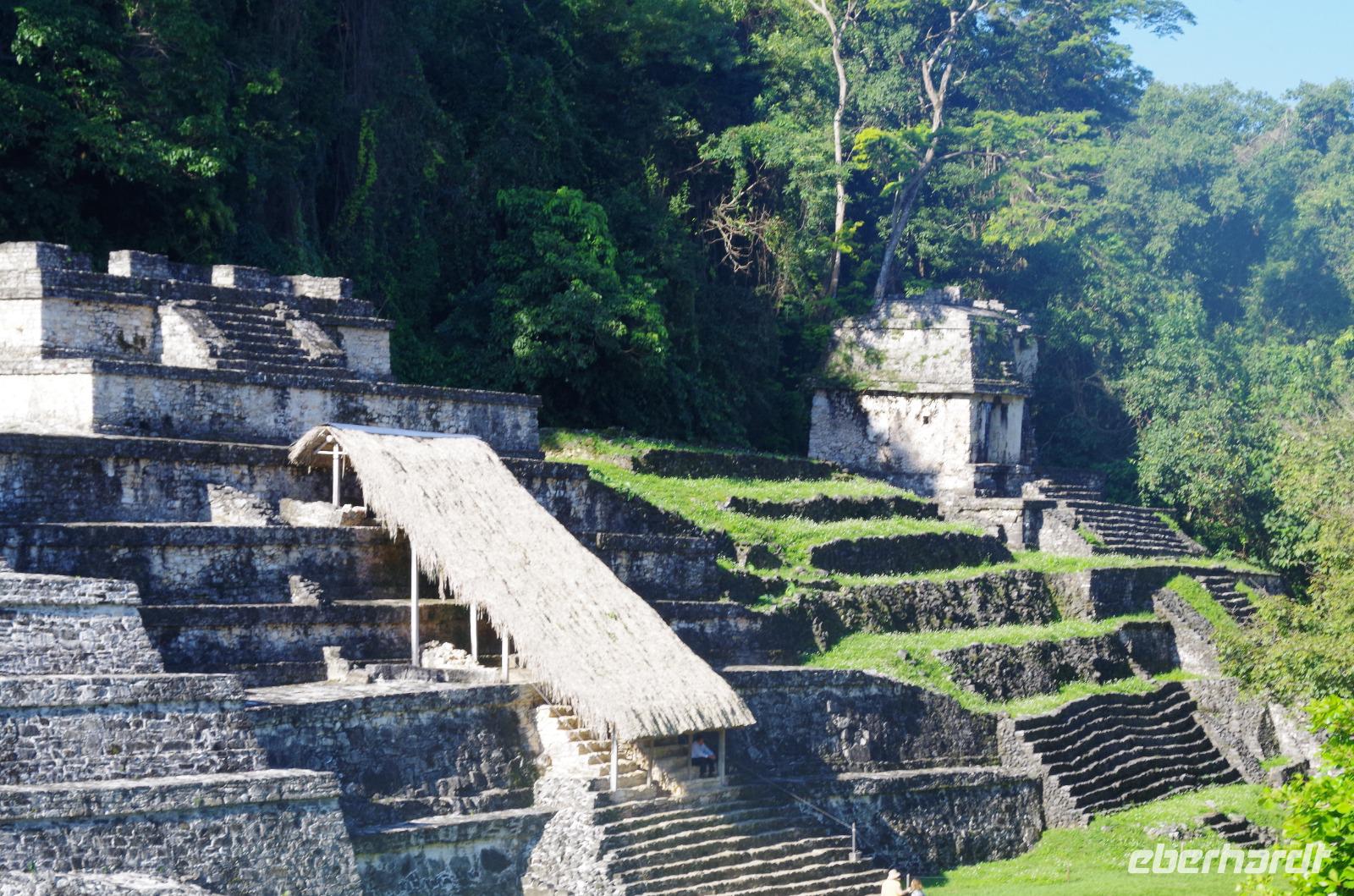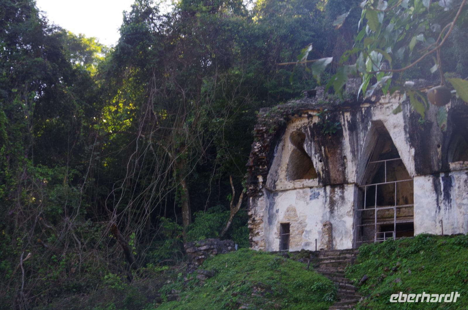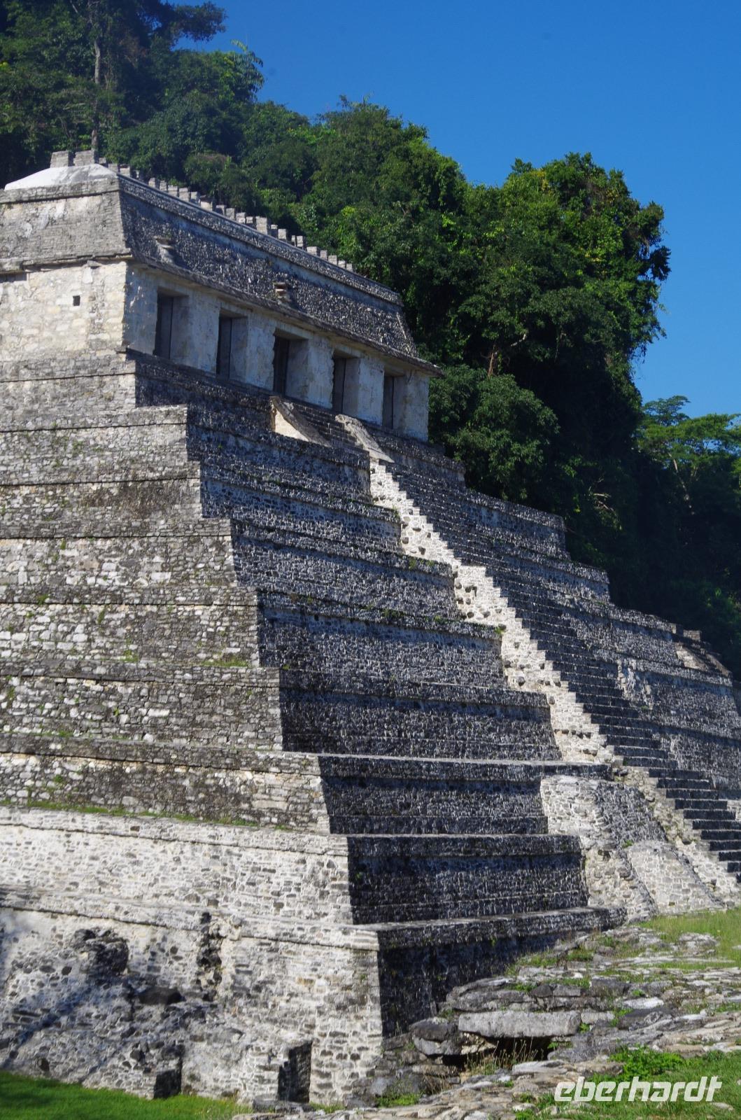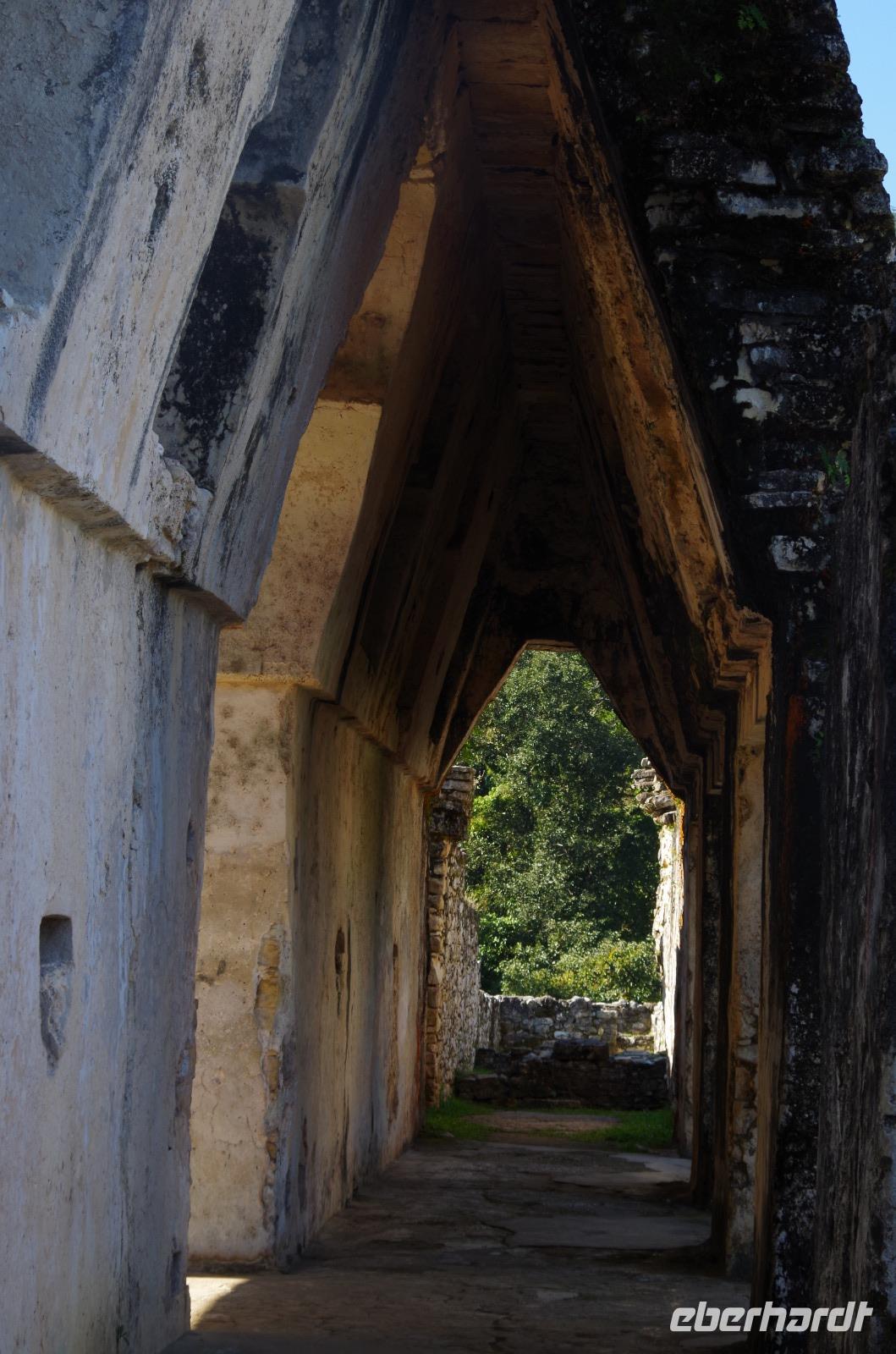 Wir bestiegen dann den Palast, wo wir viele Fenster in Form des Buchstabens T sehen konnten. Fenster in Gebäuden waren in der mesoamerikanischen Zeit sehr ungewöhnlich. Von hier aus konnten wir auch den Turm des Palastes mit dem Altar sehen.