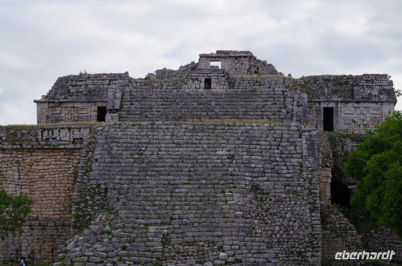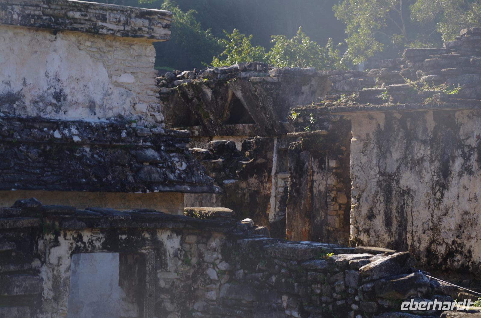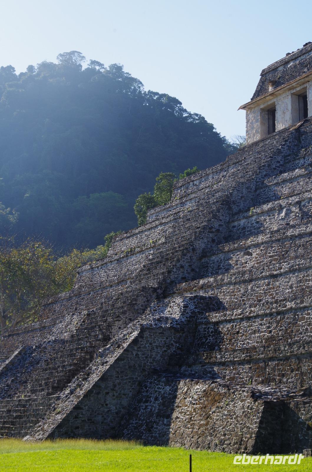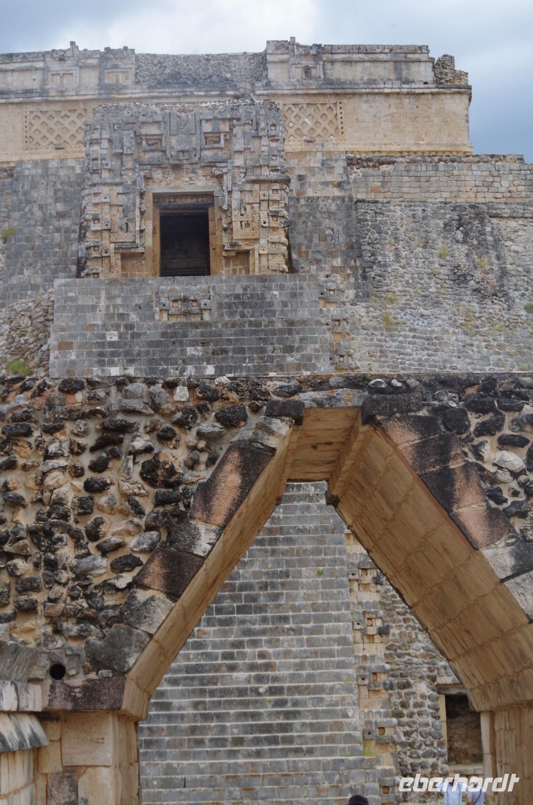 Wir bestiegen dann den Palast, wo wir viele Fenster in Form des Buchstabens T sehen konnten. Fenster in Gebäuden waren in der mesoamerikanischen Zeit sehr ungewöhnlich. Von hier aus konnten wir auch den Turm des Palastes mit dem Altar sehen.