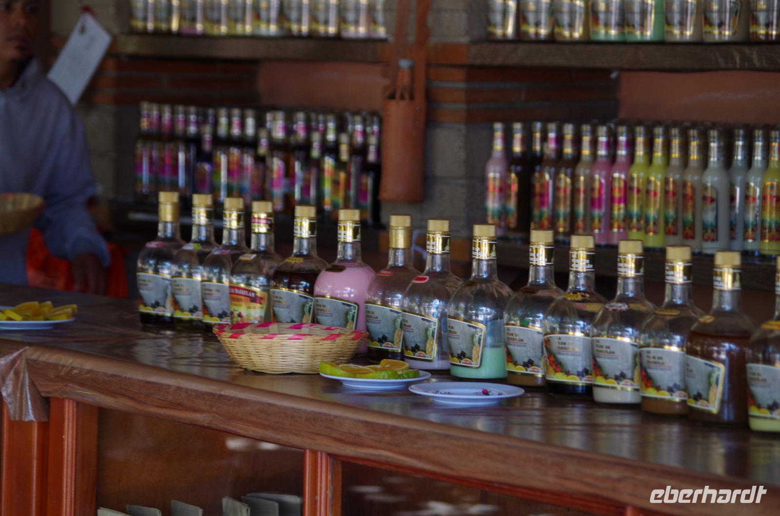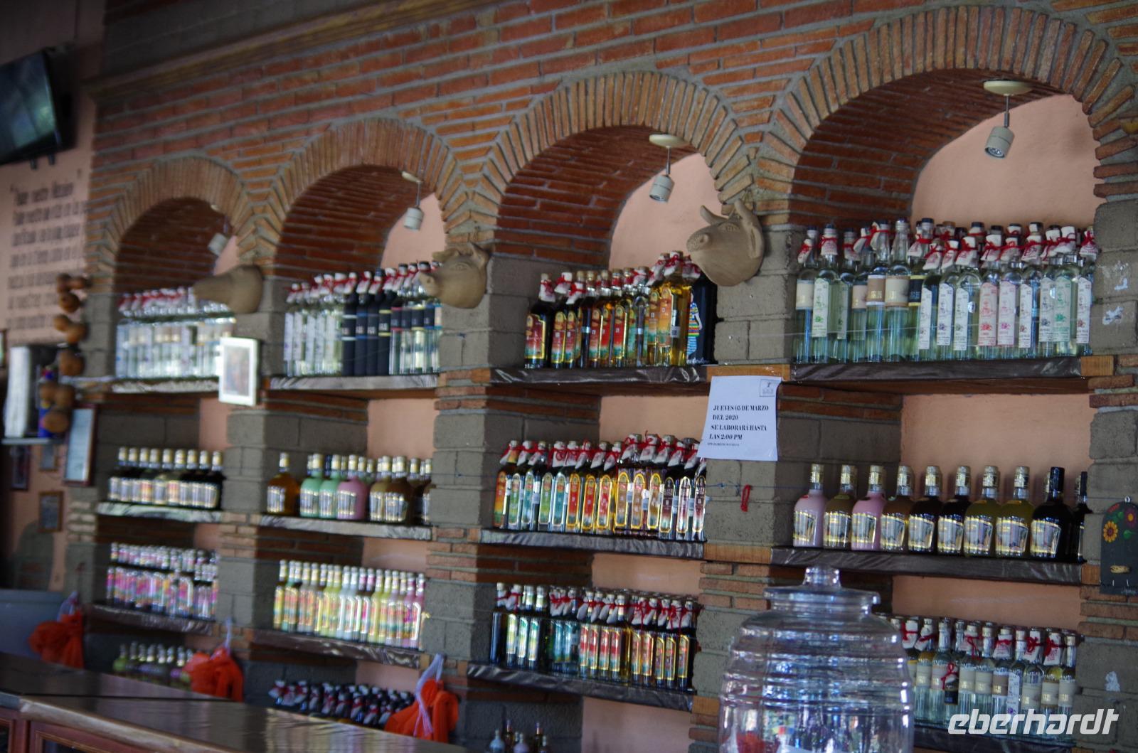 Natürlich dürfte eine Kostprobe nicht fehlen. So konnten von 1/2 Jahr jungen bis zum 8 Jahre alten Mezcal verschiedene Sorten getestet werden. Aber auch verschiedene andere, süßere Sorten wurden probiert.