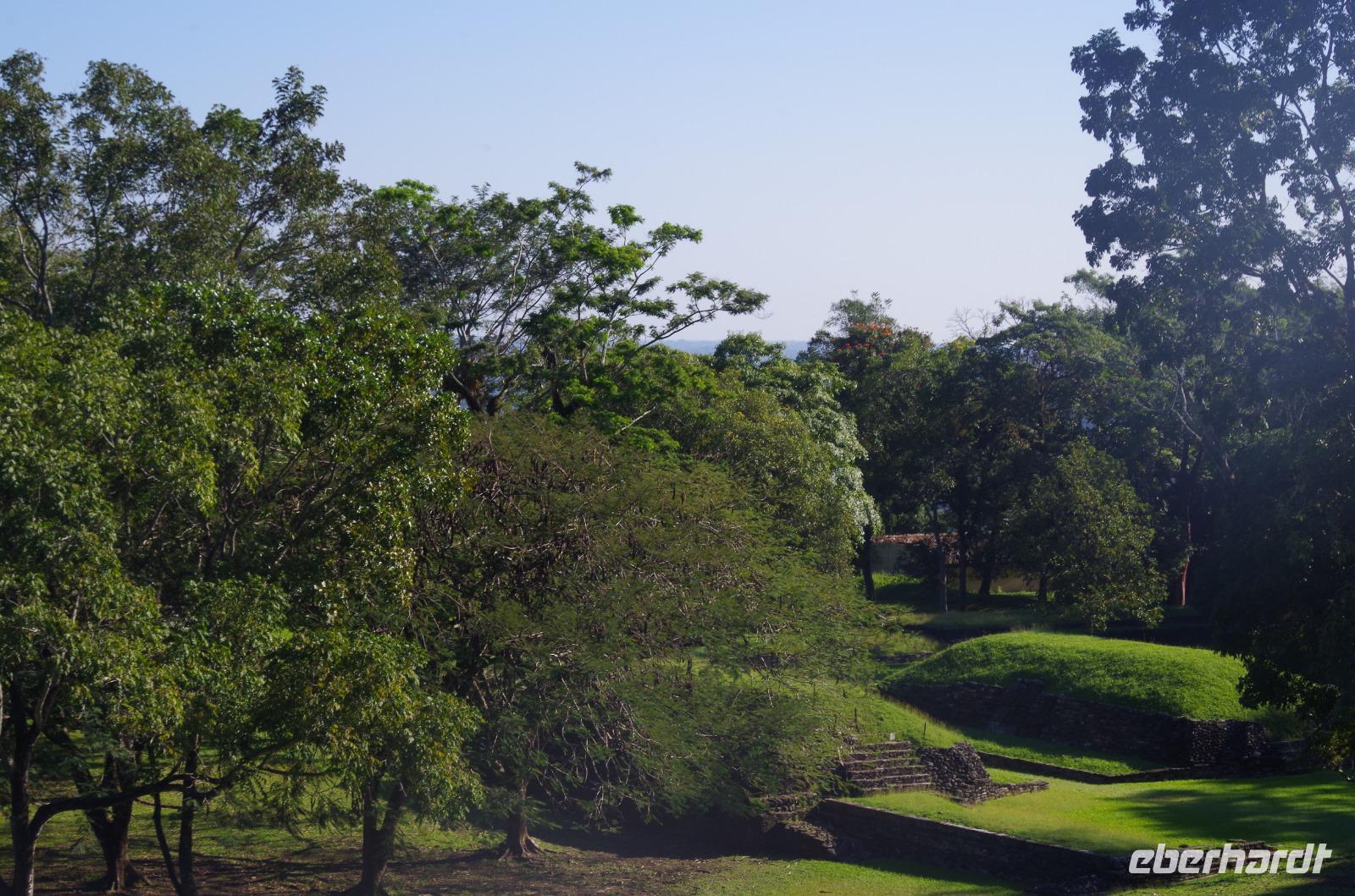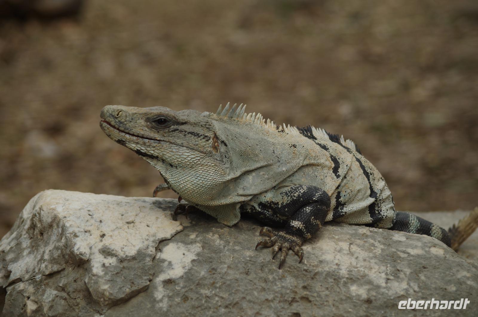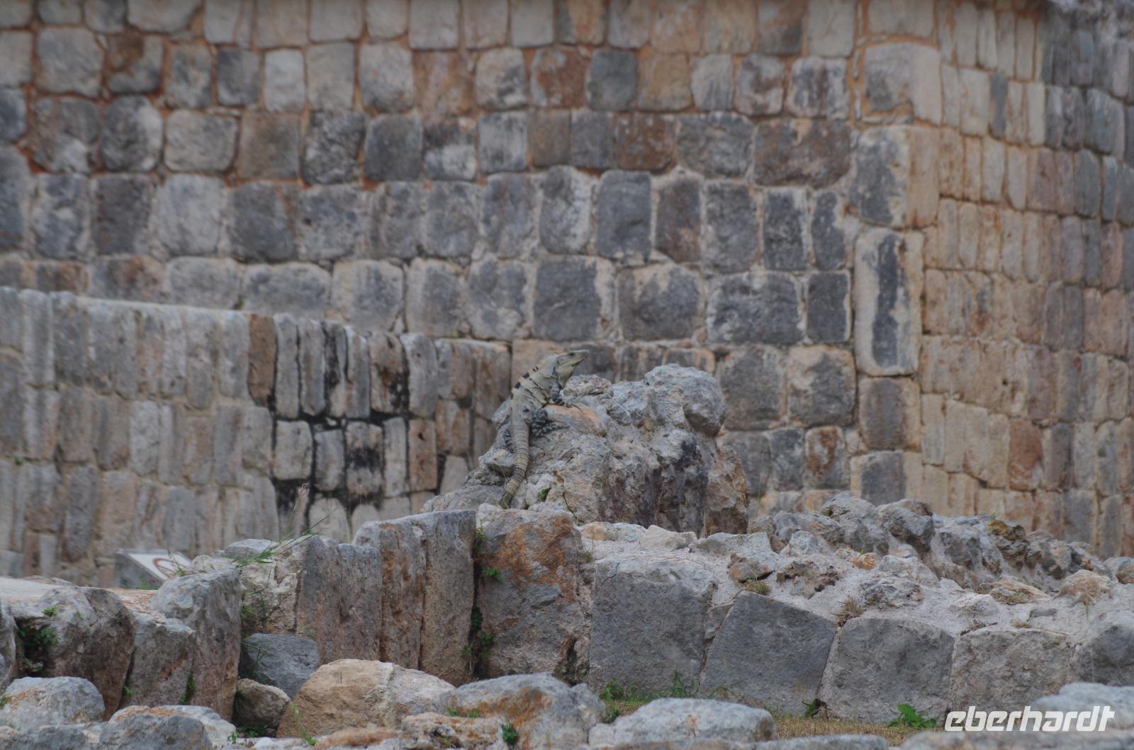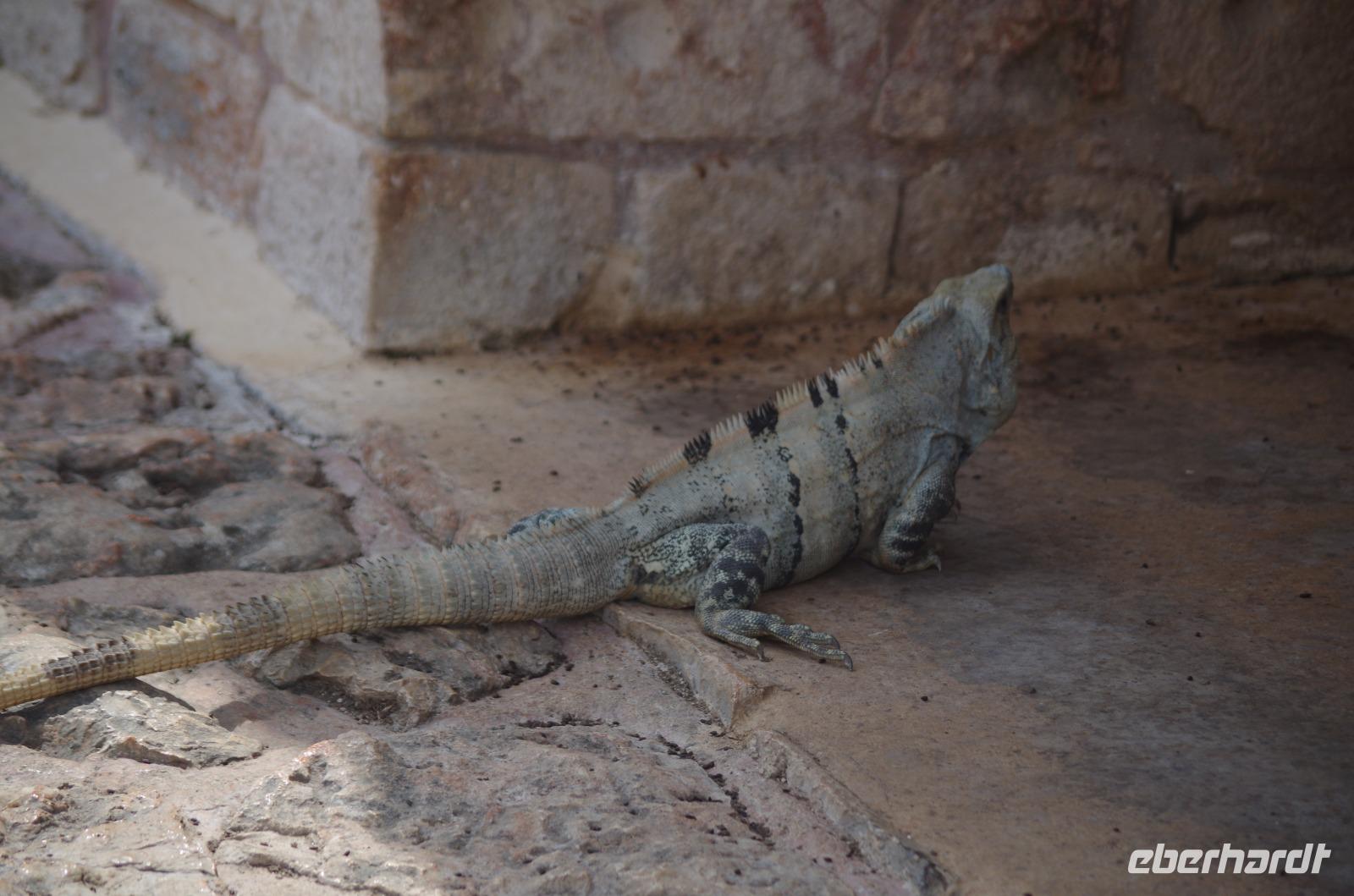 Einige waagemutige gingen tatsächlich die steilen Treppen des großen Tempels hinauf. Der Großteil unserer Gruppe entschied sich doch für einen der begehrten schattigen Plätze unter einem der Bäume. Unser Rundgang führte uns weiter zum Schildkrötenhaus und Wahrsagerhaus, aber auch vorbei an zahlreichen noch nicht freigelegten Gebäuden. Während unseres Rundganges trafen wir auf viele Leguane, die im Posieren für Fotos schon sehr geübt waren.