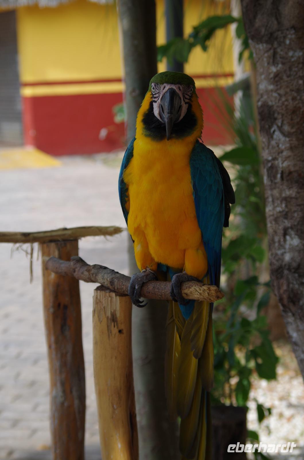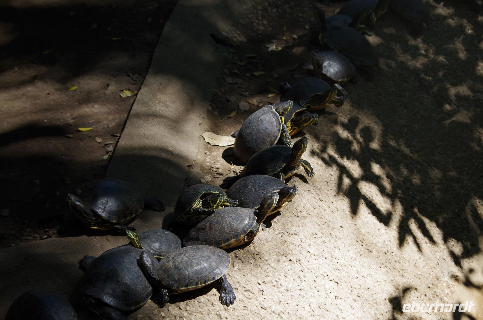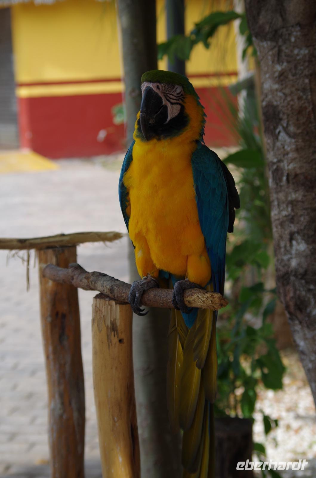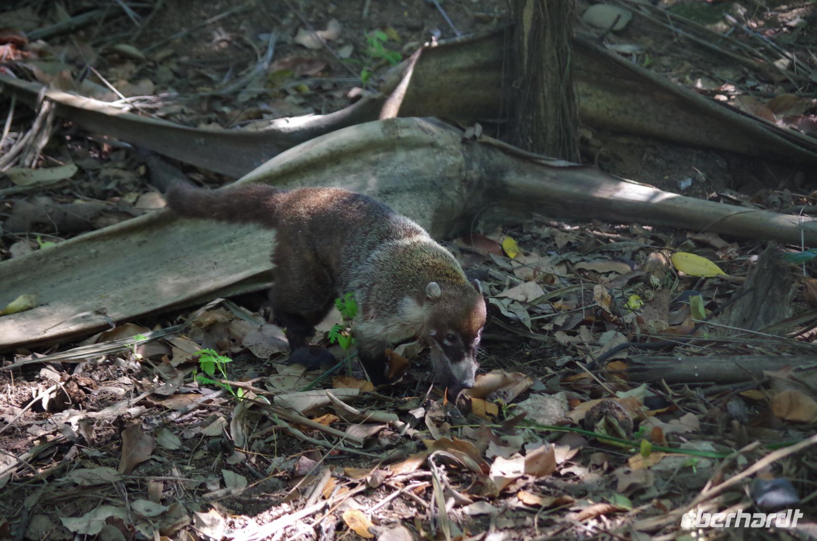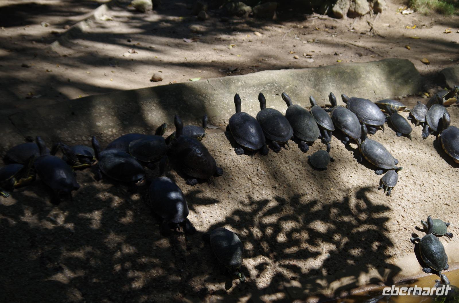 Einige waagemutige gingen tatsächlich die steilen Treppen des großen Tempels hinauf. Der Großteil unserer Gruppe entschied sich doch für einen der begehrten schattigen Plätze unter einem der Bäume. Unser Rundgang führte uns weiter zum Schildkrötenhaus und Wahrsagerhaus, aber auch vorbei an zahlreichen noch nicht freigelegten Gebäuden. Während unseres Rundganges trafen wir auf viele Leguane, die im Posieren für Fotos schon sehr geübt waren.