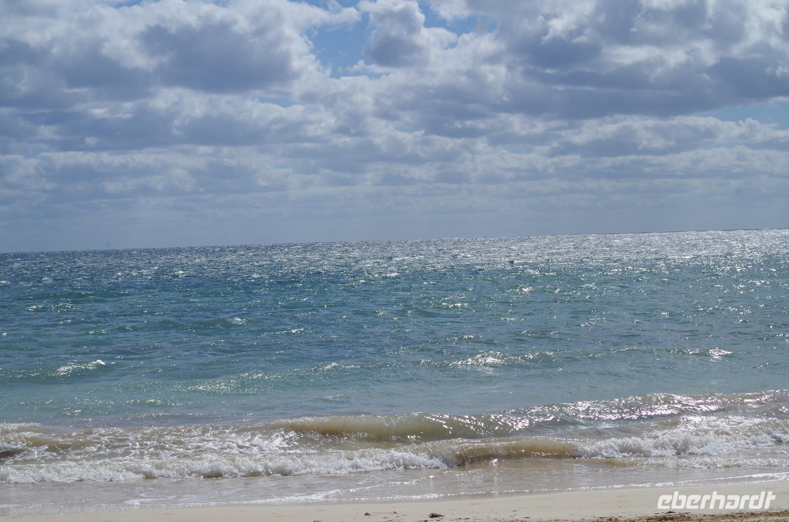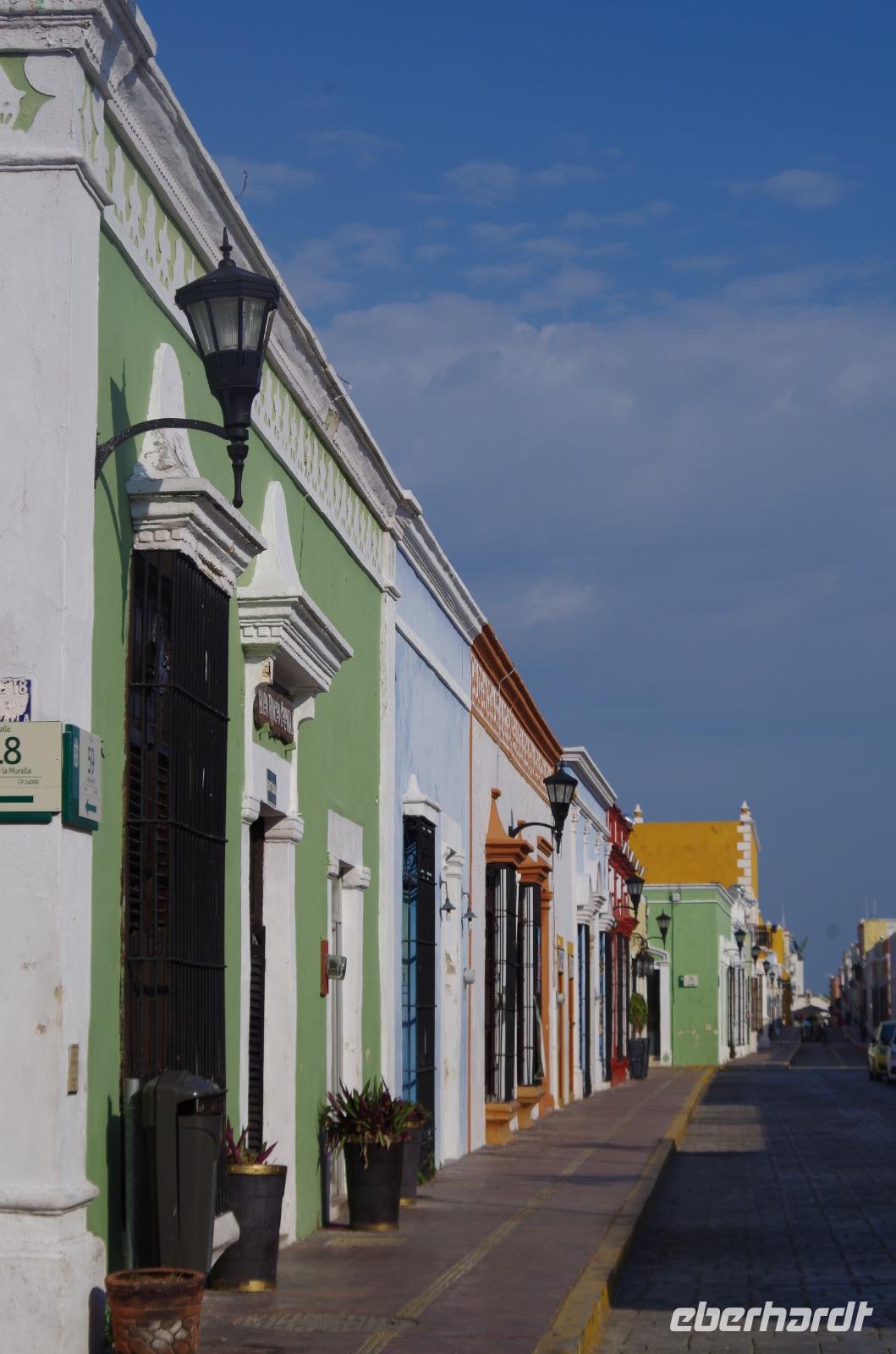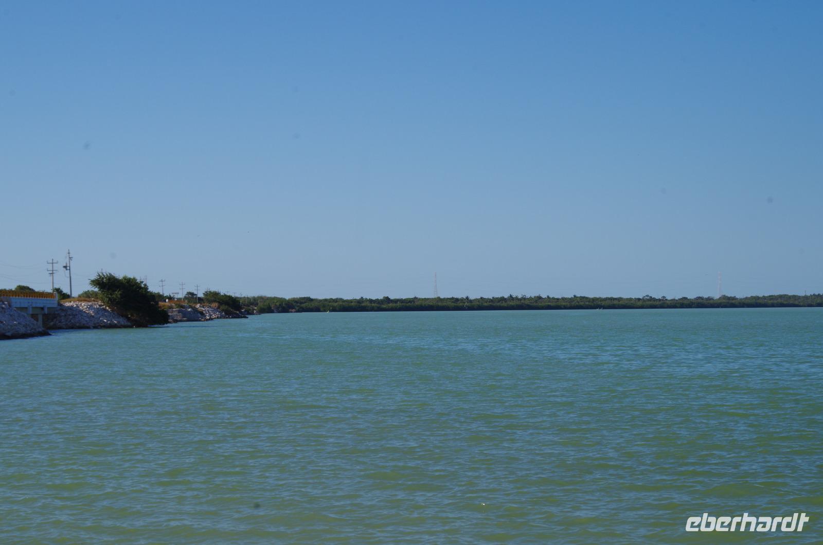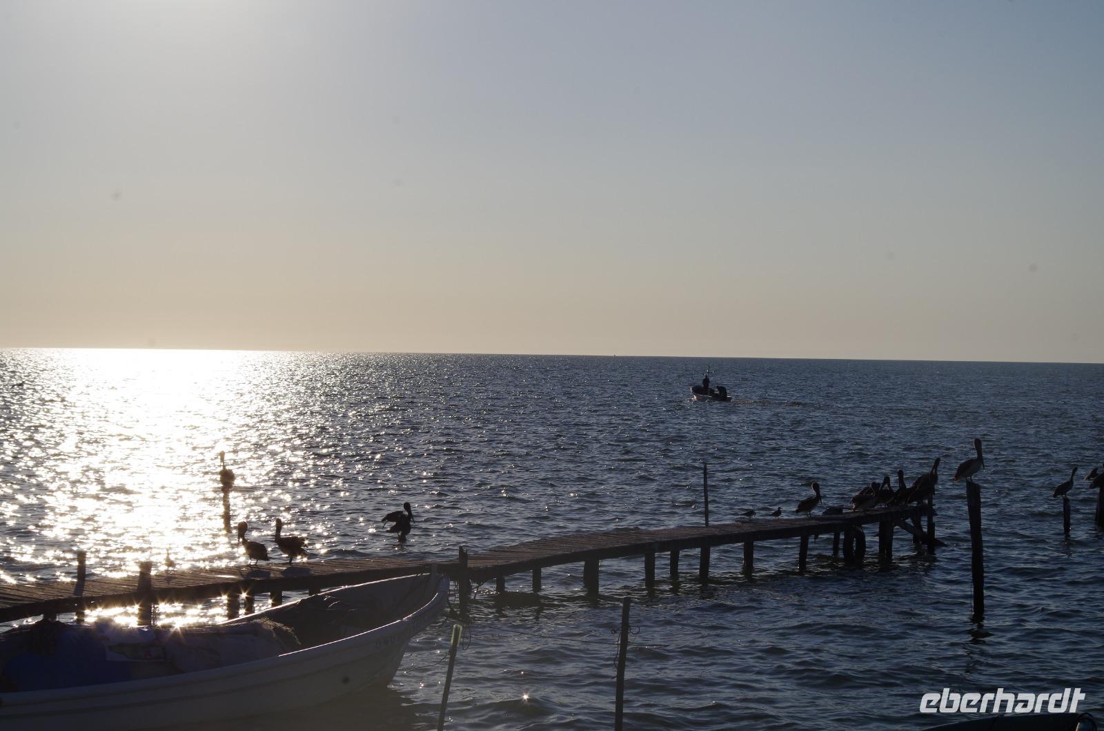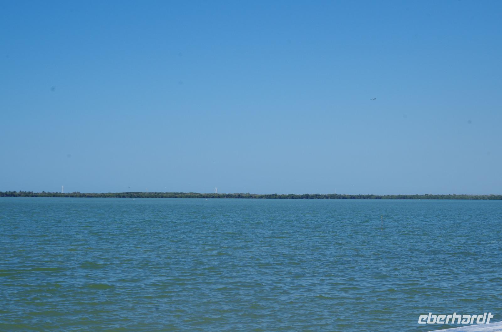 Nachdem wir mit Tortillas und Bananen gestärkt waren, starten wir erneut eine längere Fahrt. Unser Ziel war Campeche. Wir stoppten am See Estero Sabancuy und erreichten dann bald die Küste. Wir fuhren entlang des Golfes von Mexiko und konnten den wunderbaren Ausblick auf das blaue Meer erlangen. 1998 gab es einen schlimmen Wirbelsturm, der einen ganzen Palmenwald entlang der Küste zerstört hat, deswegen findet man dort heute deutlich weniger Palmen.