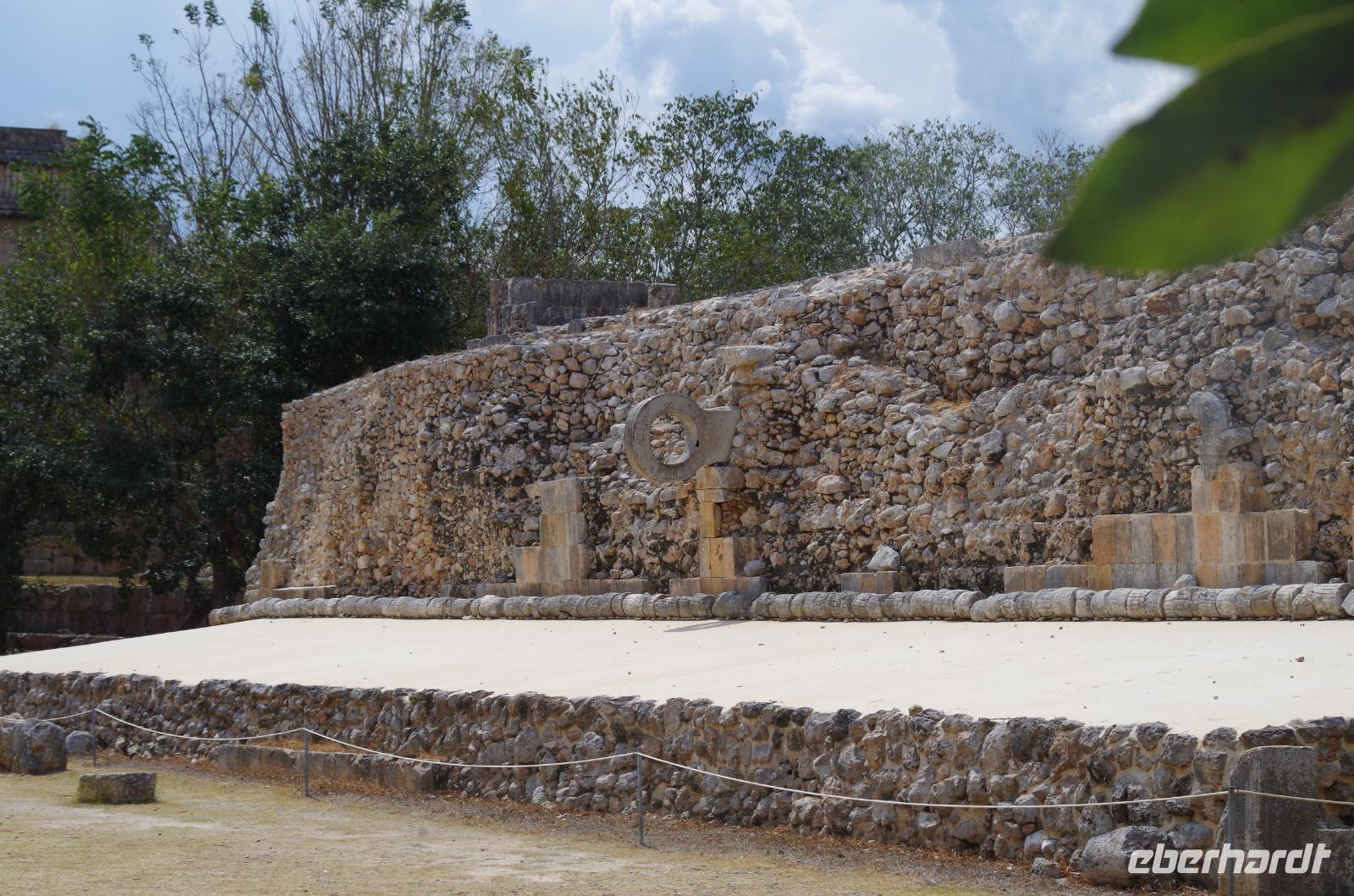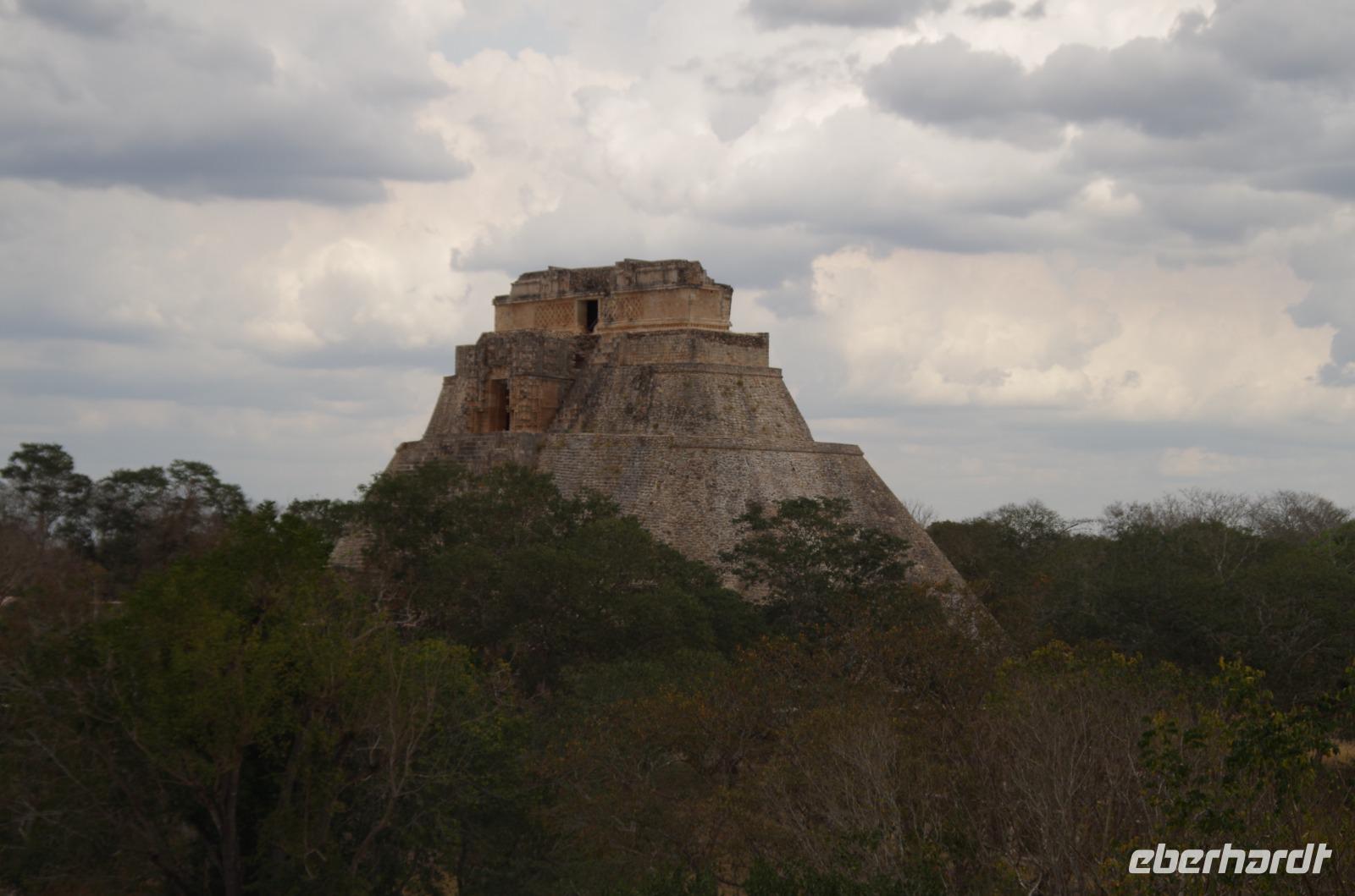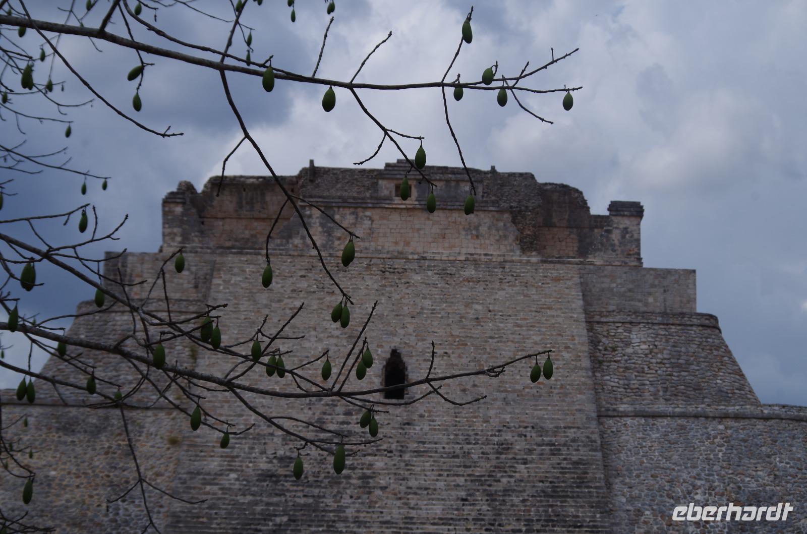 Wieder am Hotel angekommen, starteten wir unsere Fahrt nach Uxmal, wo wir am späten Vormittag angekommen sind. Uxmal bedeutet in der Sprache der Mayas so viel, wie drei Mal erbaut. Unser Spaziergang über die Anlage begann am Nonnenkloster und führte uns weiter zum Gouverneurspalast, welcher als Versammlungshaus diente und mit Symbolen der doppelten Schlange und des Zahnrades verziert ist. Außerdem sahen wir den Venustempel und den Ballspielplatz mit den berühmten Ringen, die vom Ball getroffen werden mussten.