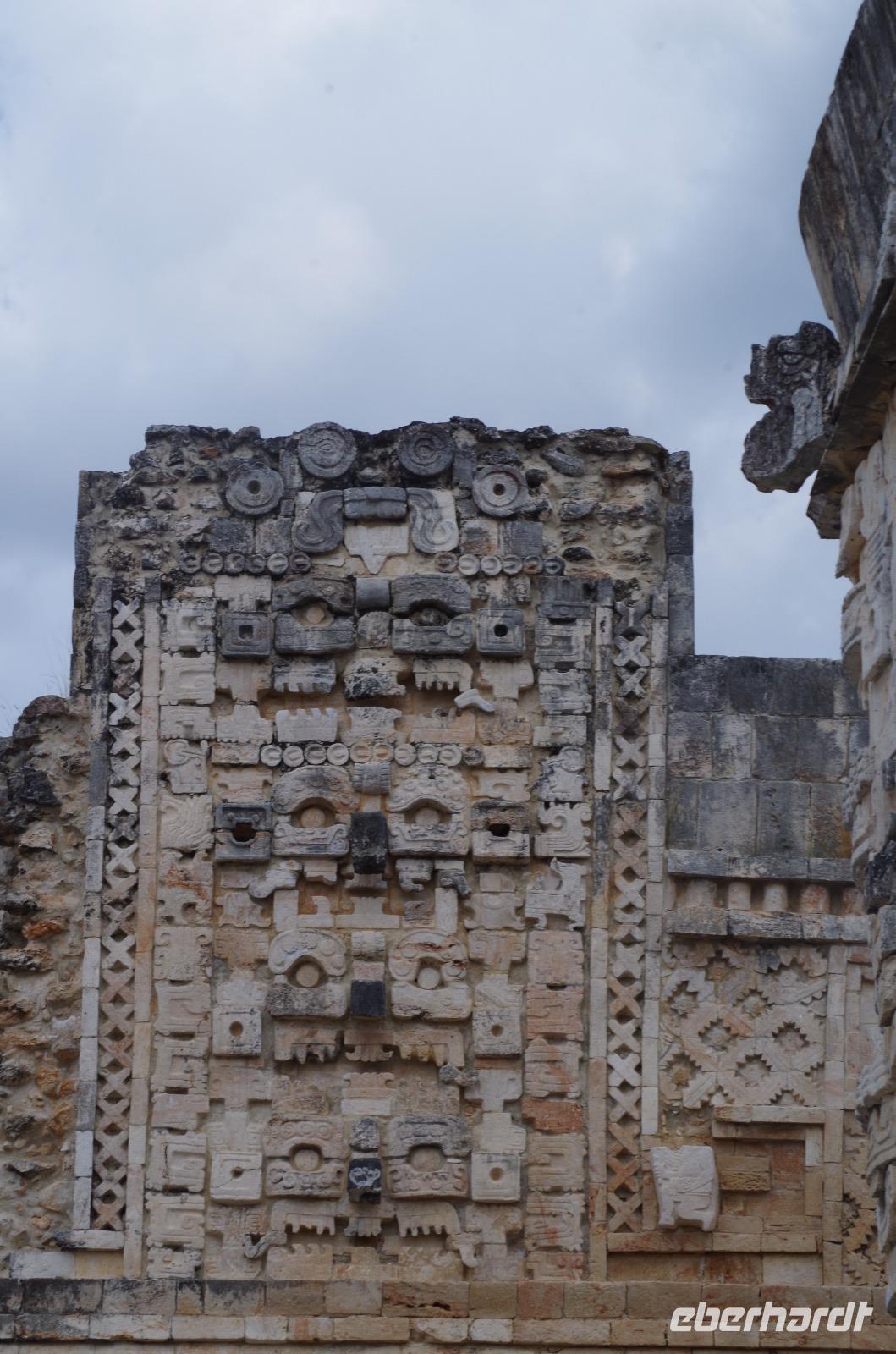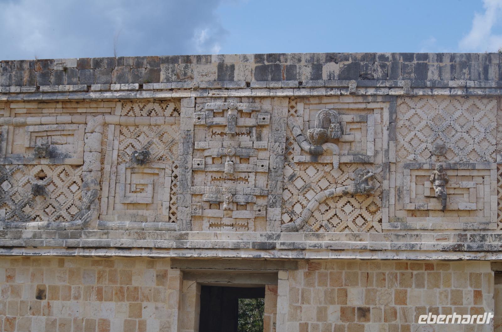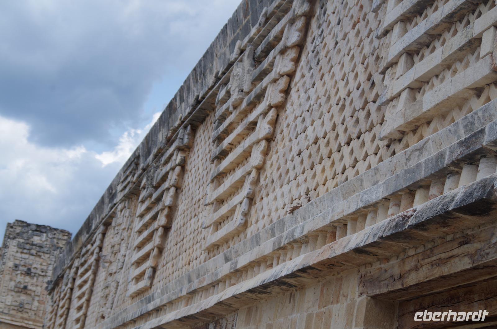 Wieder am Hotel angekommen, starteten wir unsere Fahrt nach Uxmal, wo wir am späten Vormittag angekommen sind. Uxmal bedeutet in der Sprache der Mayas so viel, wie drei Mal erbaut. Unser Spaziergang über die Anlage begann am Nonnenkloster und führte uns weiter zum Gouverneurspalast, welcher als Versammlungshaus diente und mit Symbolen der doppelten Schlange und des Zahnrades verziert ist. Außerdem sahen wir den Venustempel und den Ballspielplatz mit den berühmten Ringen, die vom Ball getroffen werden mussten.