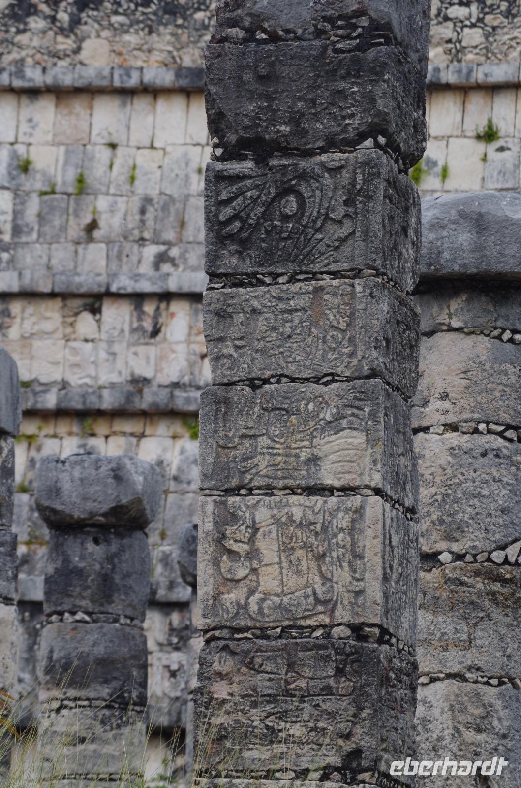Direkt zu Beginn gingen wir zum Marktgebäude und zum Dampfbad. Normalerweise werden diese beiden Punkte ausgelassen, weil es in der Regel unangenehm heiß ist bei Besuchen von Chichén Itzá. Wir hatten aber Glück, es herrschten angenehme Temperaturen und es war bewölkt. Ideales Wetter, um einen Ausgrabungsstätte zu besichtigen. Vorbei an der 1000 Säulen Halle spazierten wir zum Krieger Tempel, wo wir Dekorationen, wie den Schlangenkopf und den Fahnenträger sehen konnten. Angekommen am Ballspielplatz waren wir erstaunt, wie man durch den Ring, welcher sich sehr weit oben befindet, wohl einen Ball spielen soll. Im Zentrum konnten wir die große Kukulkán Pyramide bestaunen. Wir gingen dann weiter nach Alt Chichén, vorbei an zahlreichen Marktständen. Die meisten der Händler sprachen davon, alles sei gratis. Sie haben sich wohl etwas falsch übersetzt.
