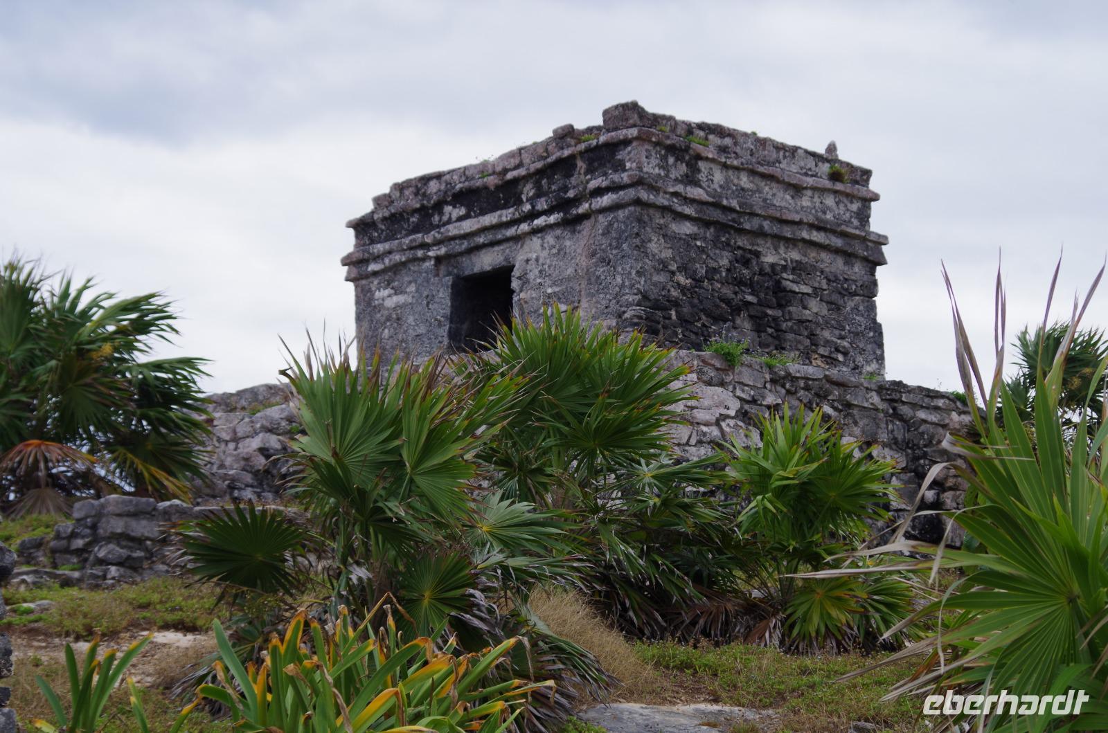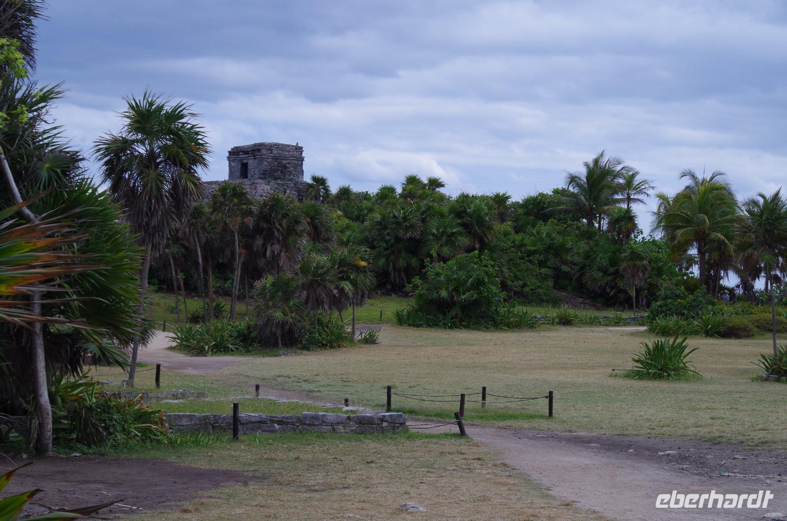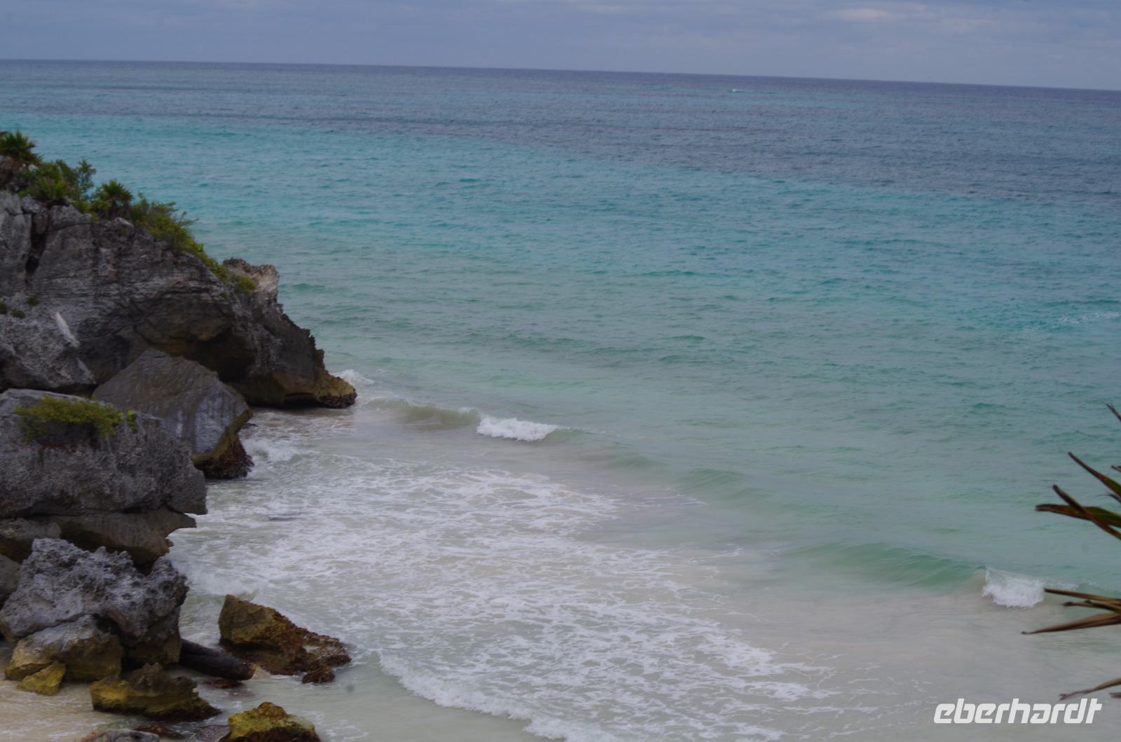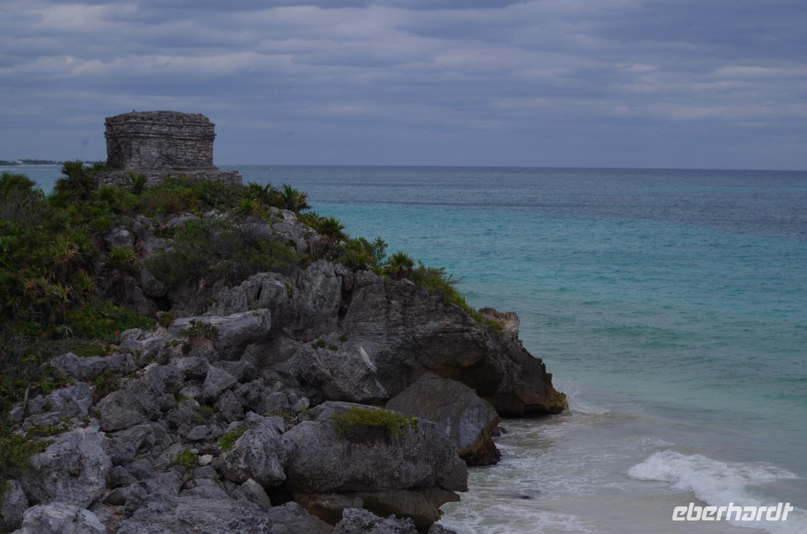 Danach fuhren wir weiter nach Tulum. Mit einem Shuttle Bus gelangten wir bis zum Eingang und starteten dann unseren Rundgang über die verhältnismäßig kleine Anlage. Dieser begann am Windtempel, wenn es stark windet hört man es dort richtig pfeifen. Wir konnten auf der Anlage auch ein Cenotenhaus sehen, welches ein typisches Maya Gebäude ist. Wir spazierten dann zum Rand der Anlage, wo wir einen wunderbaren Blick auf die Karibik, den Strand und die Palmen hatten. Es war etwas bewölkt und damit wieder nicht so unangenehm heiß, gut geeignet für einen Rundgang. Zum Schluss gingen wir vorbei am Castillo (=Burg), das Hauptgebäude der Anlage.