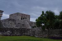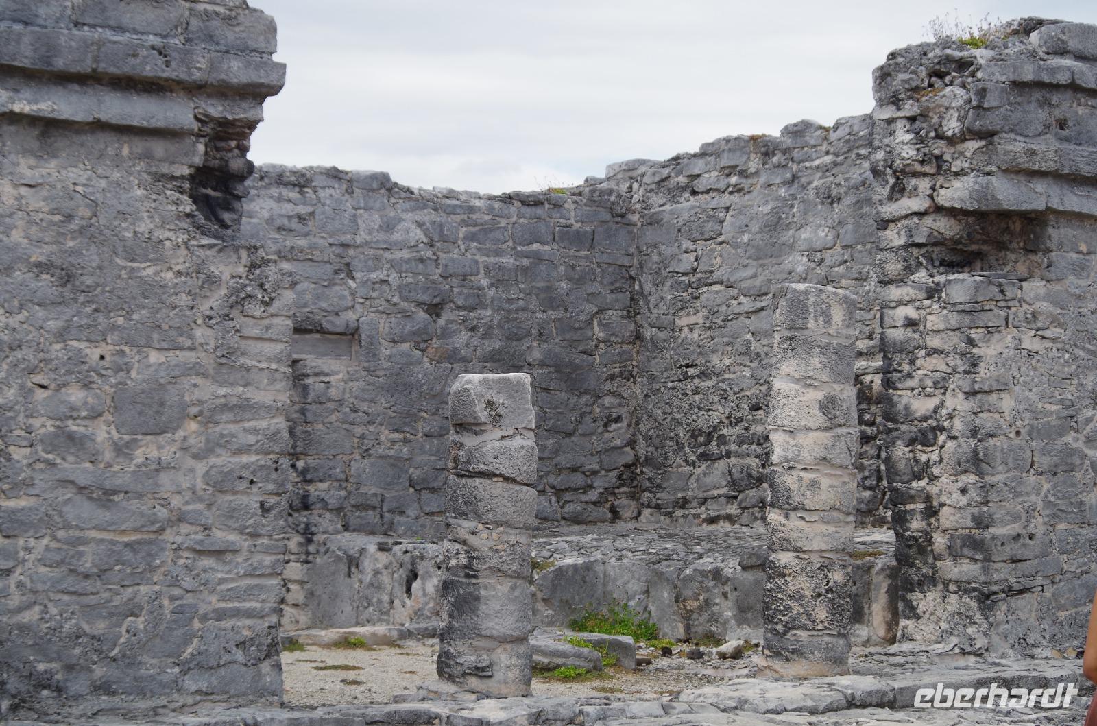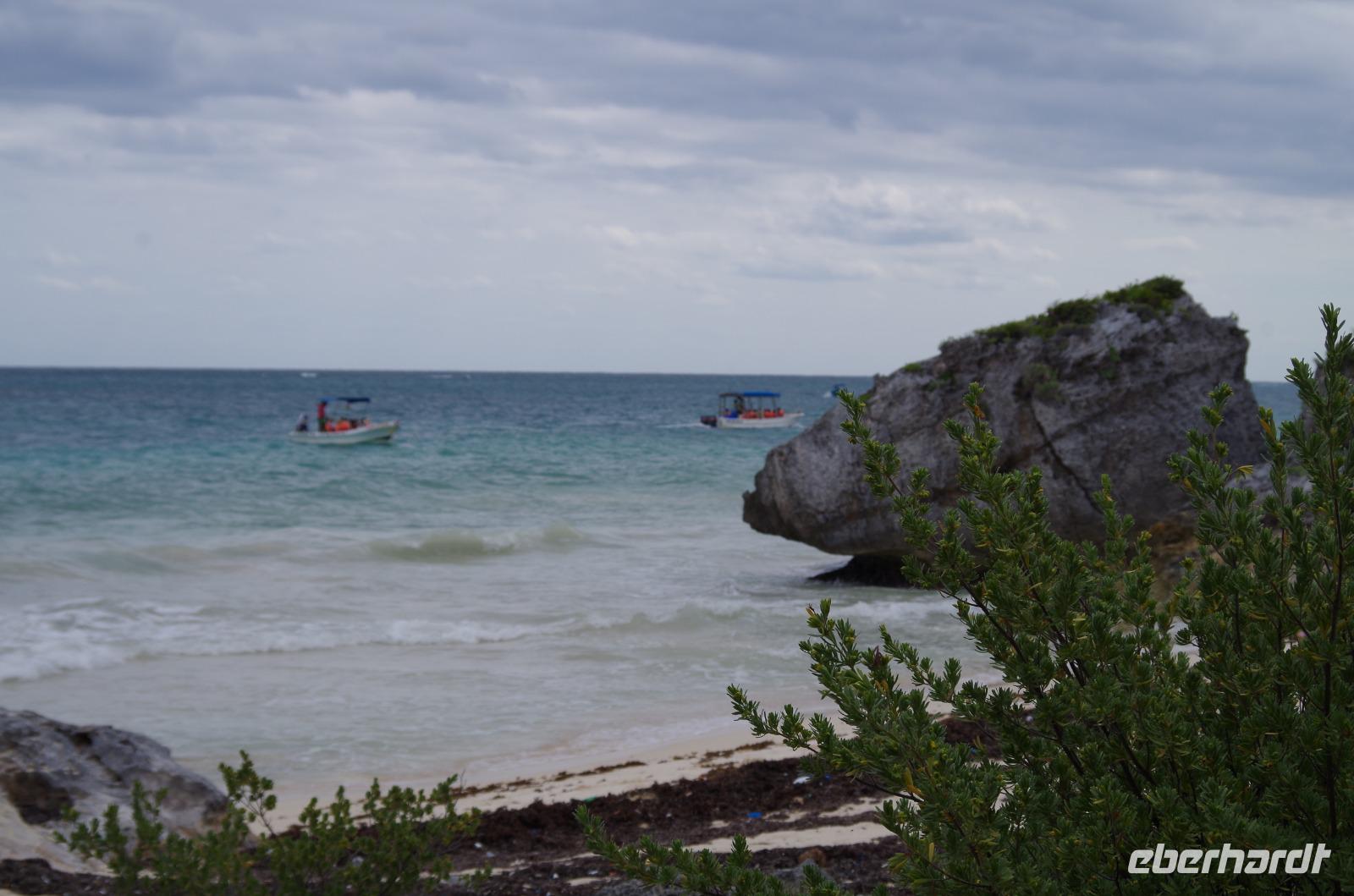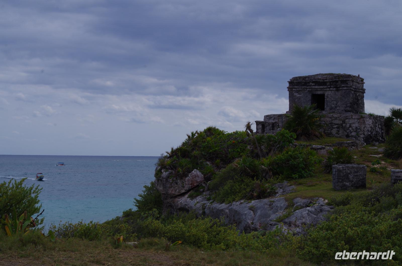 Danach fuhren wir weiter nach Tulum. Mit einem Shuttle Bus gelangten wir bis zum Eingang und starteten dann unseren Rundgang über die verhältnismäßig kleine Anlage. Dieser begann am Windtempel, wenn es stark windet hört man es dort richtig pfeifen. Wir konnten auf der Anlage auch ein Cenotenhaus sehen, welches ein typisches Maya Gebäude ist. Wir spazierten dann zum Rand der Anlage, wo wir einen wunderbaren Blick auf die Karibik, den Strand und die Palmen hatten. Es war etwas bewölkt und damit wieder nicht so unangenehm heiß, gut geeignet für einen Rundgang. Zum Schluss gingen wir vorbei am Castillo (=Burg), das Hauptgebäude der Anlage.