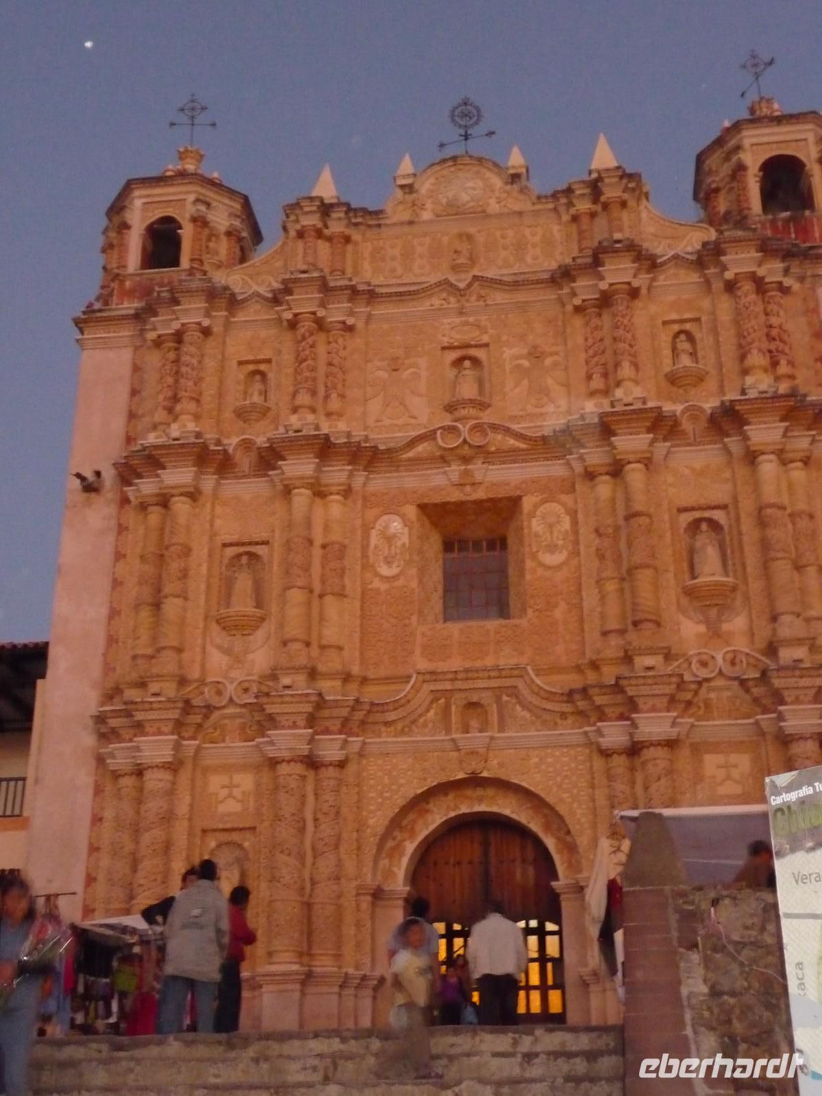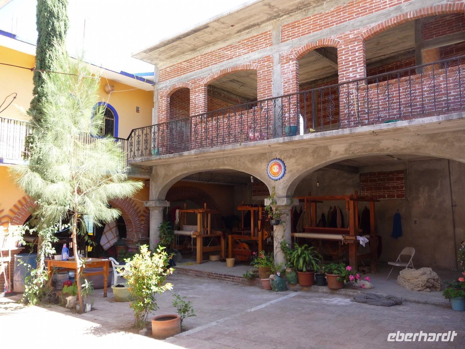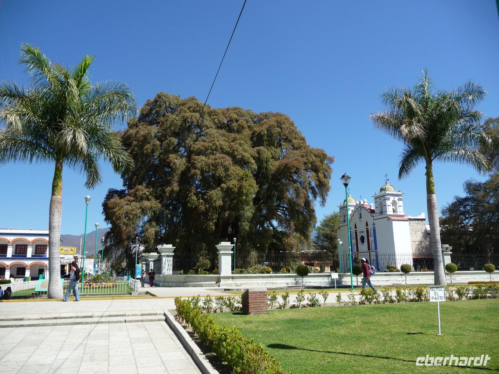 Weiter ging es in den Ort Santa Maria del Tule, wo wir den Baumriesen "El árbol del Tule" besichtigten - den dicksten Baum der Welt, der einen Stammdurchmesser von sage und schreibe ca. 13 Metern hat und etwa 2000 Jahre alt ist!! Im winzigen Dorf Tlacochahuya besuchten wir eine weitere interssante Kirche, diese nun mit farbenfrohen Wandmalereien. Im Anschluss wurden wir in einer kleinen Mezcal-Destillerie in die Geheimnisse der Herstellung dieses Agavenschnapses eingeweiht. Nach der Besichtigung einer Teppichweberei im Dorf Teotitlan del Valle war es höchste Zeit, etwas Essbares zu uns zu nehmen. In einem hübschen Restaurant mit wunderschöner Gartenanlage machten wir Rast und bekamen danach einen kleine Einführung in die Besonderheiten der mexikanischen Küche. Zurück in Oaxaca bummelten wir noch etwas durch die Gassen, warfen einen Blick in die Kathedrale und auf den umliegenden Zócalo (Von den Unruhen am Vortag war rein gar nichts mehr zu spüren oder zu sehen. Im Gegenteil, es gab einen Karnevalsumzug und später am Abend noch eine Tanzveranstaltung mit kubanischer Musik.), statteten einem Schokoladen-Laden einen Besuch ab und deckten uns auf dem Markt mit Proviant für den nächsten langen Fahrtag ein.