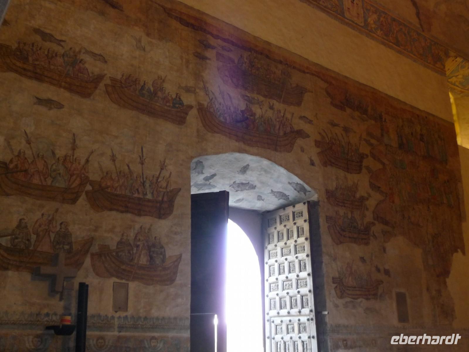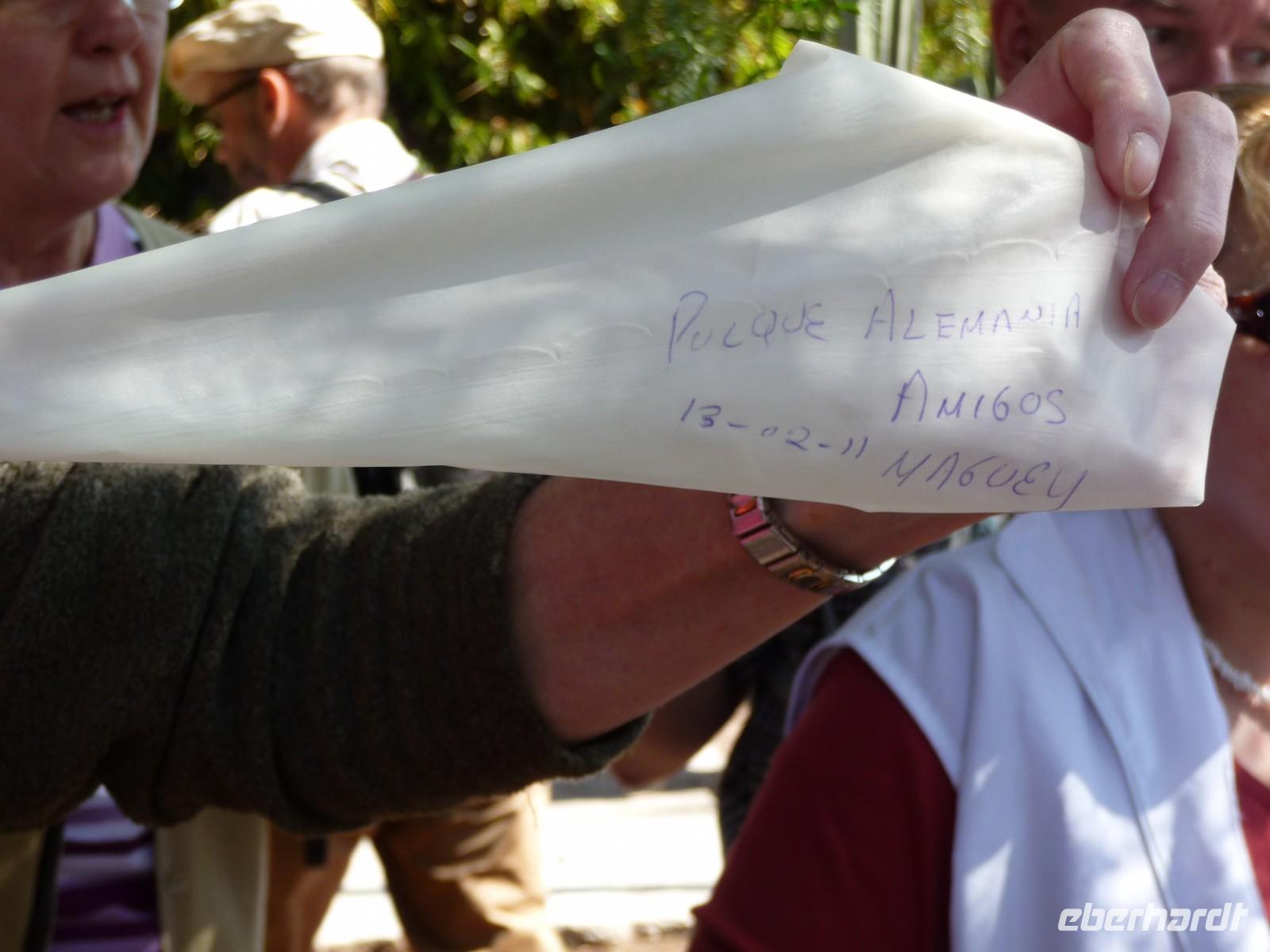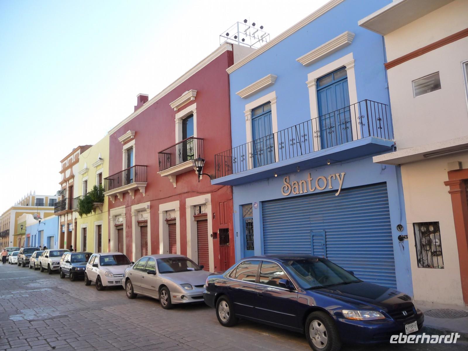Weiter ging es in den Ort Santa Maria del Tule, wo wir den Baumriesen "El árbol del Tule" besichtigten - den dicksten Baum der Welt, der einen Stammdurchmesser von sage und schreibe ca. 13 Metern hat und etwa 2000 Jahre alt ist!! Im winzigen Dorf Tlacochahuya besuchten wir eine weitere interssante Kirche, diese nun mit farbenfrohen Wandmalereien. Im Anschluss wurden wir in einer kleinen Mezcal-Destillerie in die Geheimnisse der Herstellung dieses Agavenschnapses eingeweiht. Nach der Besichtigung einer Teppichweberei im Dorf Teotitlan del Valle war es höchste Zeit, etwas Essbares zu uns zu nehmen. In einem hübschen Restaurant mit wunderschöner Gartenanlage machten wir Rast und bekamen danach einen kleine Einführung in die Besonderheiten der mexikanischen Küche. Zurück in Oaxaca bummelten wir noch etwas durch die Gassen, warfen einen Blick in die Kathedrale und auf den umliegenden Zócalo (Von den Unruhen am Vortag war rein gar nichts mehr zu spüren oder zu sehen. Im Gegenteil, es gab einen Karnevalsumzug und später am Abend noch eine Tanzveranstaltung mit kubanischer Musik.), statteten einem Schokoladen-Laden einen Besuch ab und deckten uns auf dem Markt mit Proviant für den nächsten langen Fahrtag ein.