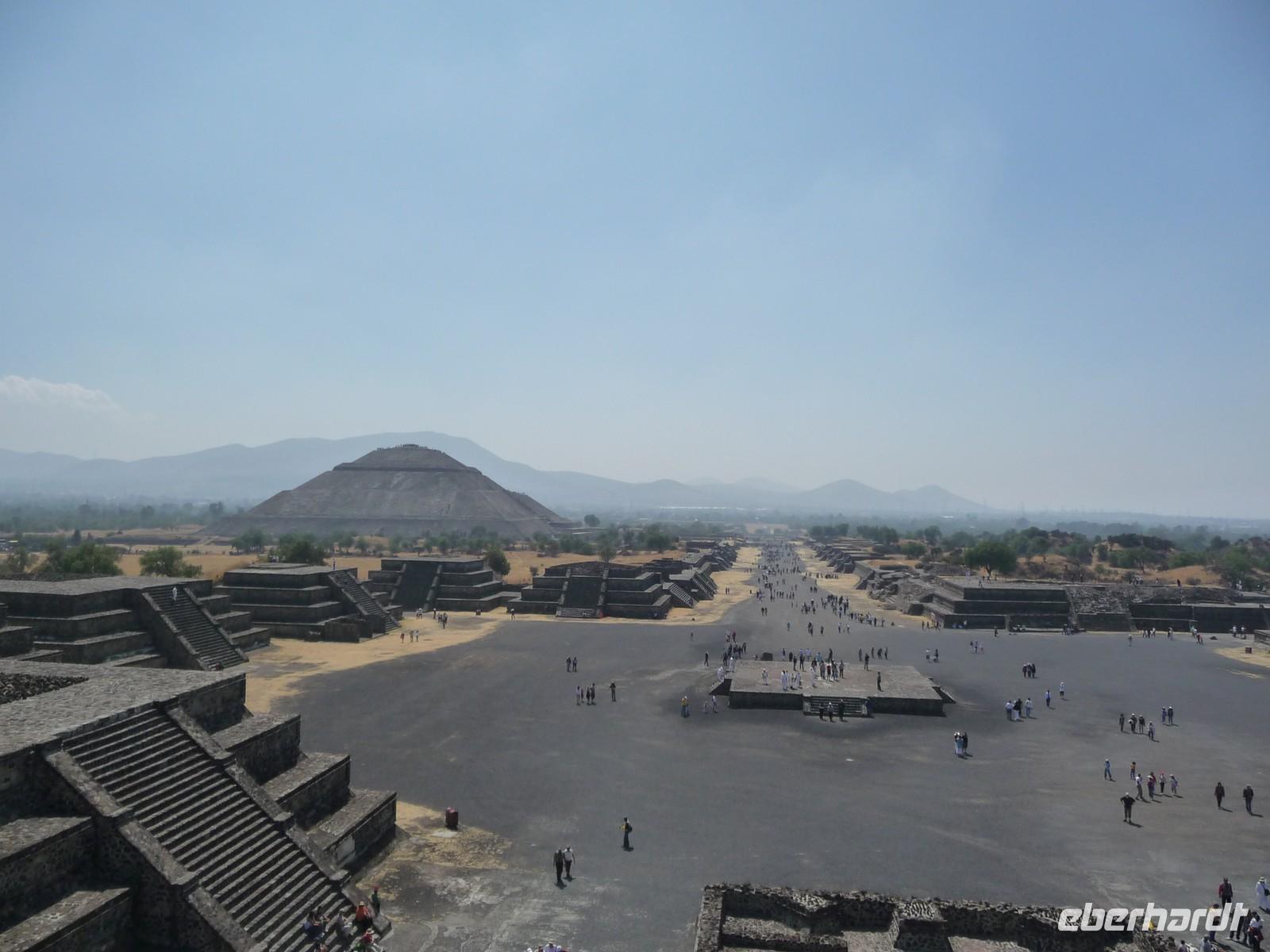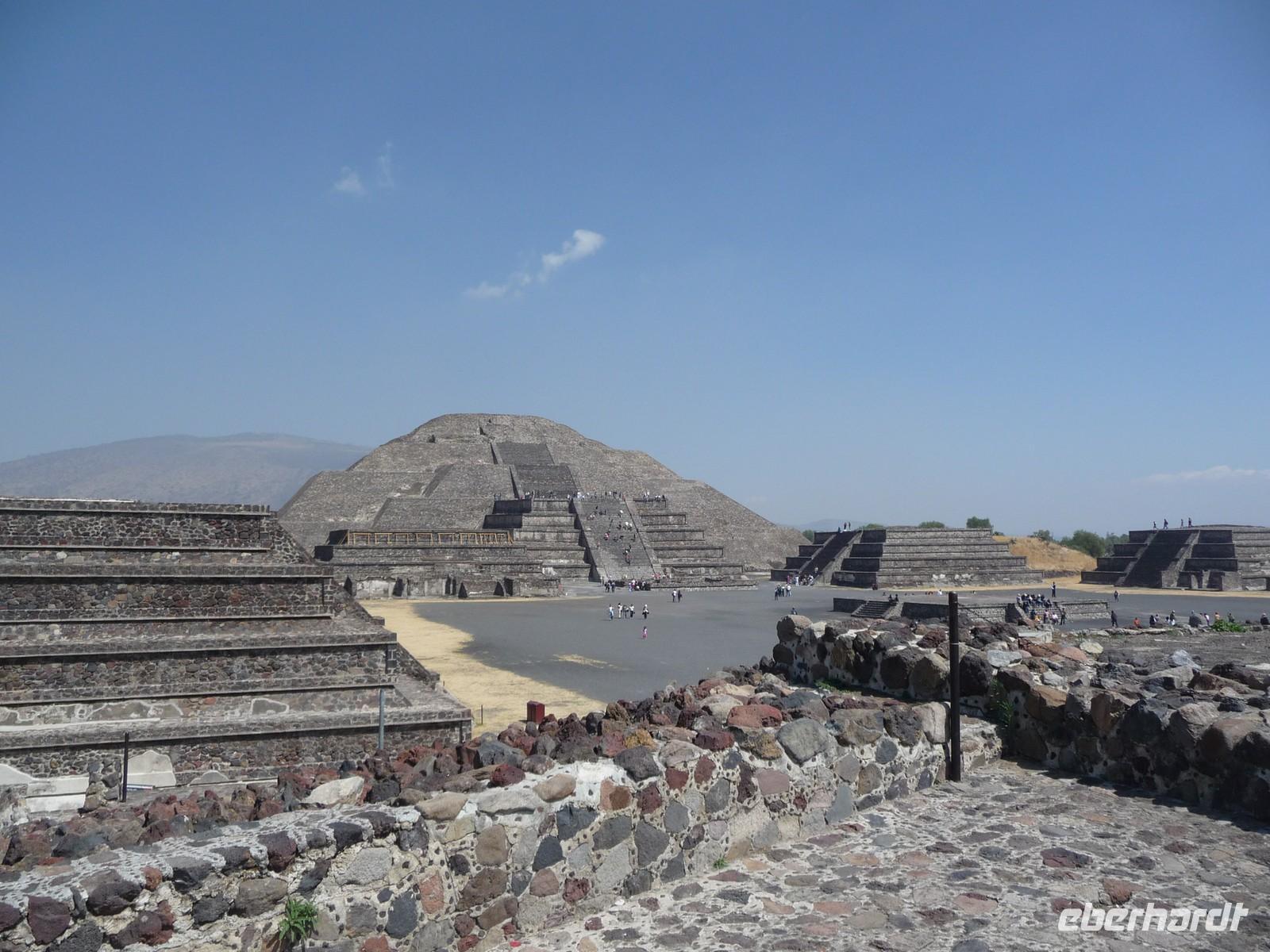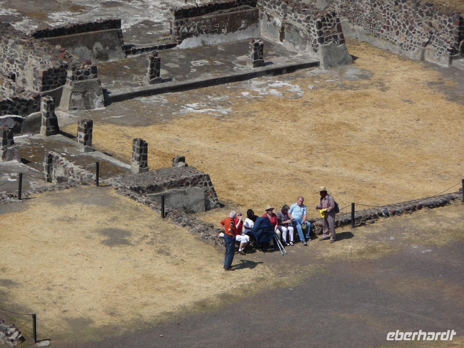 Weiter ging es nach Teotihuacán, welches sich ca. 50 km nordöstlich von Mexiko-Stadt befindet. Dieser Ort ist ein echtes Mysterium, weiß man doch nichts über seine Erbauer, deren Sprache und Geschichte. Es ist eine gigantische Ruinenanlage und die größte altindianische Stadt, die bisher ausgegraben wurde. Von der Mondpyramide aus genossen wir eine tolle Aussicht über das gesamte Gelände. Über die "Straße der Toten" gelangten wir zur Sonnenpyramide, dem mit 63 m Höhe größten Bau der Anlage. Mittlerweile herrschte viel Andrang, doch einige von uns ließen sich davon nicht abbringen und erklommen die Pyramide bis ganz hinauf zur Spitze.