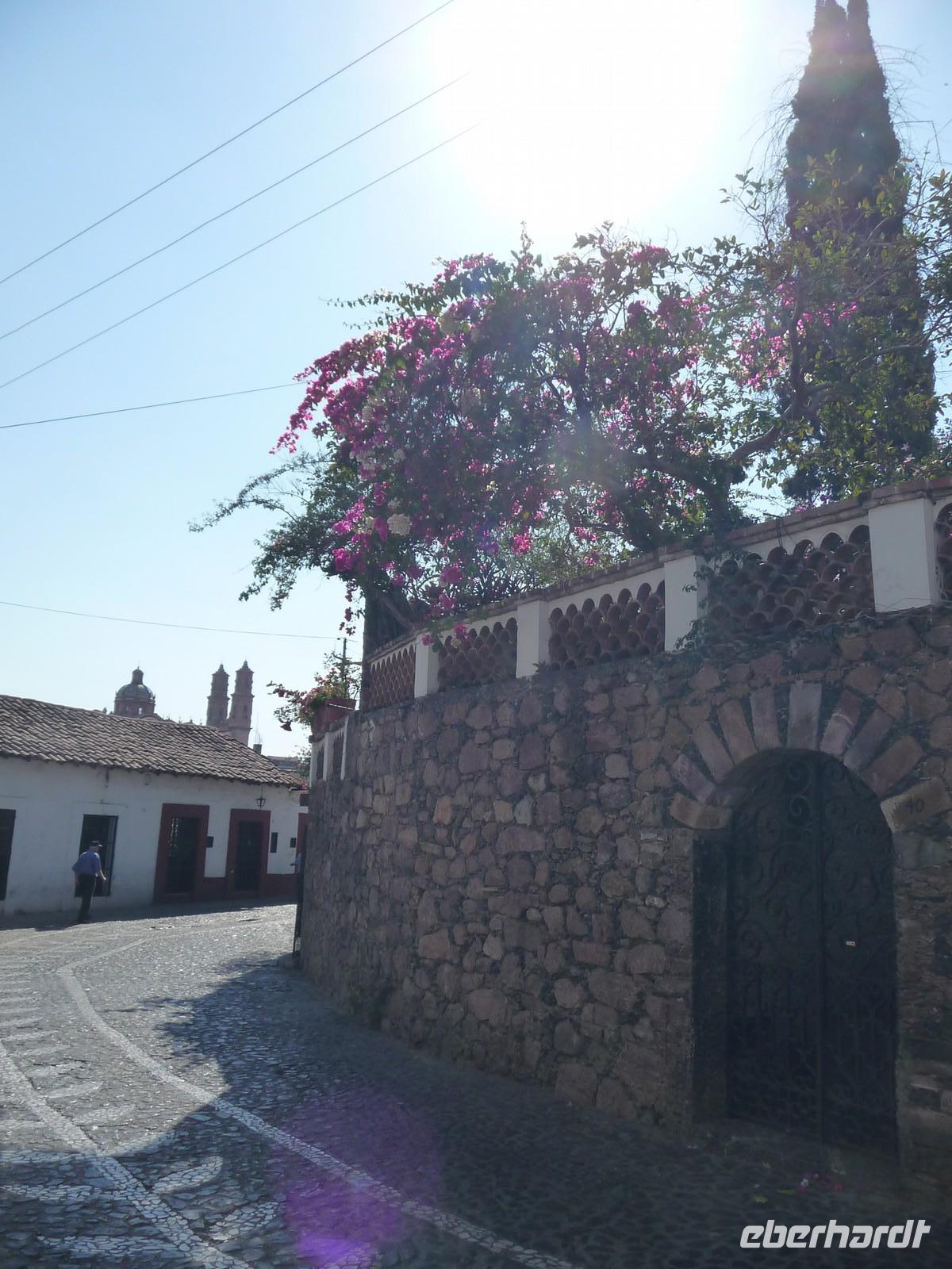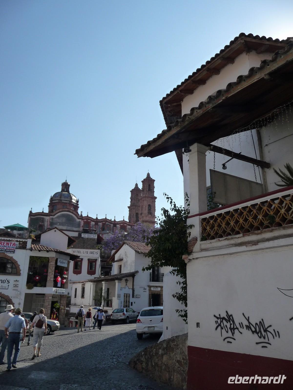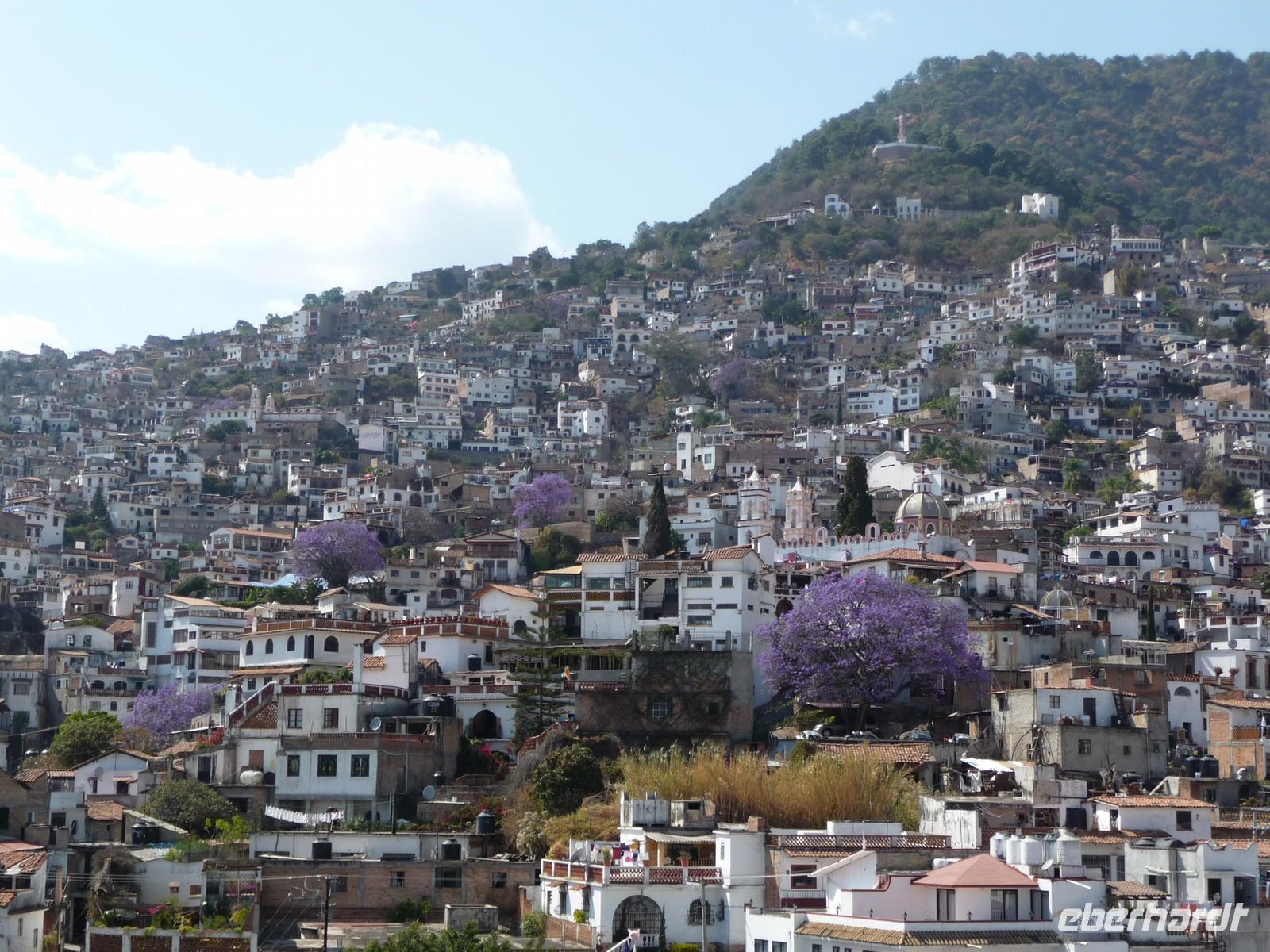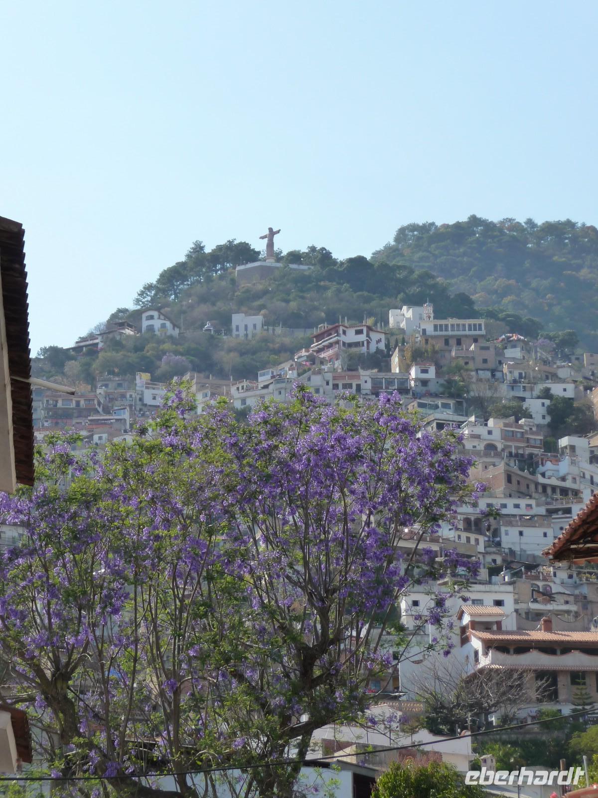 Anschließend fuhren wir nach Taxco. Ein kleiner, hübscher Ort mit kleinen Plätzen und Gassen, der sich malerisch an die Hänge der umliegenden Hügel schmiegt. Von dem Restaurant, in welches wir zum Mittagessen eingekehrt sind, genossen wir einen tollen Blick auf die Stadt mit ihren zart lila blühenden Jacaranda-Bäumen. Taxco ist bekannt für ihre Silberschmiedekunst und so blieb es nicht aus, dass wir den Weg in den ein oder anderen Silberladen fanden... Durch die hübschen Gassen spazierten wir hinauf zum kleinen Zócalo und besichtigten die Kirche San Sebastián y Santa Prisca.
