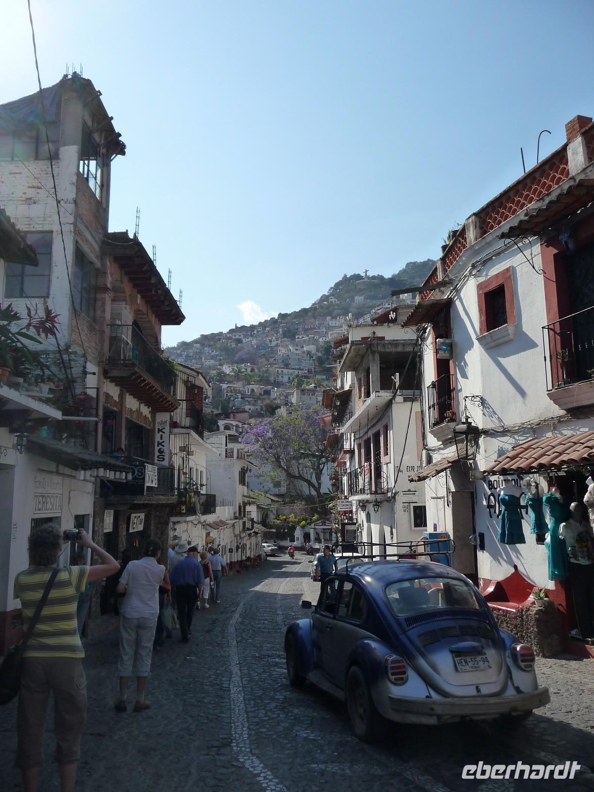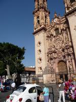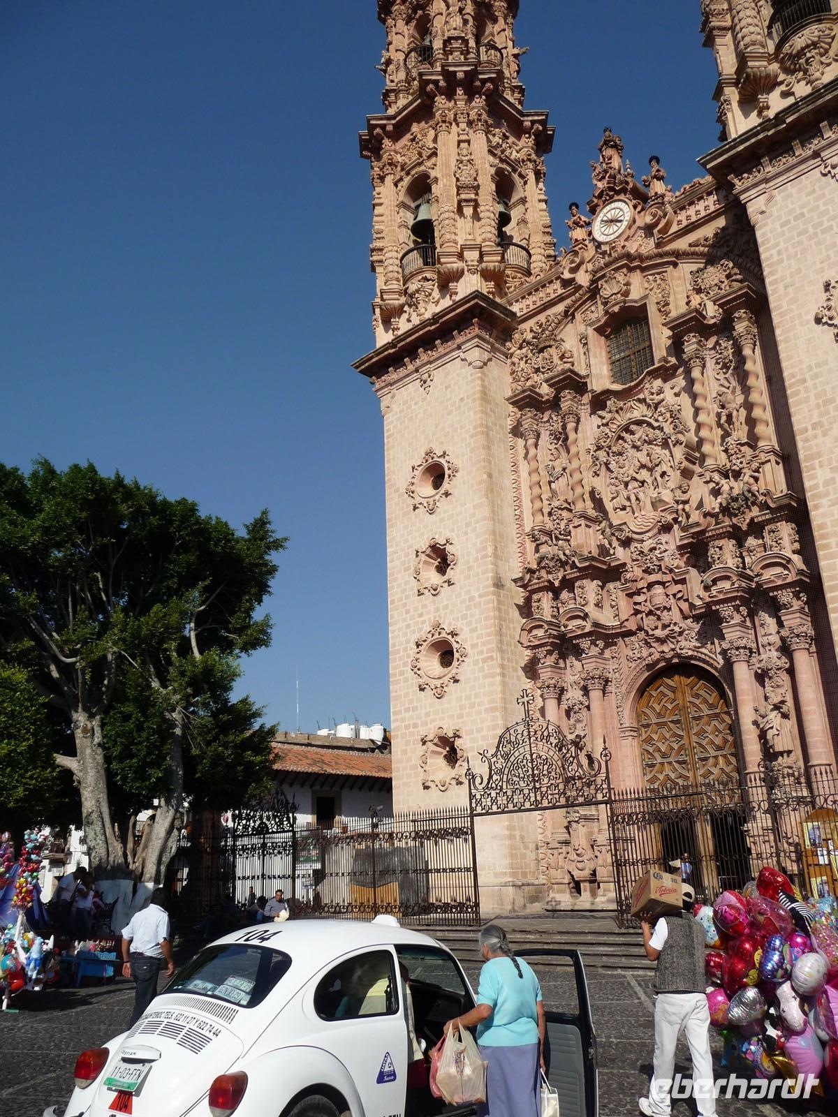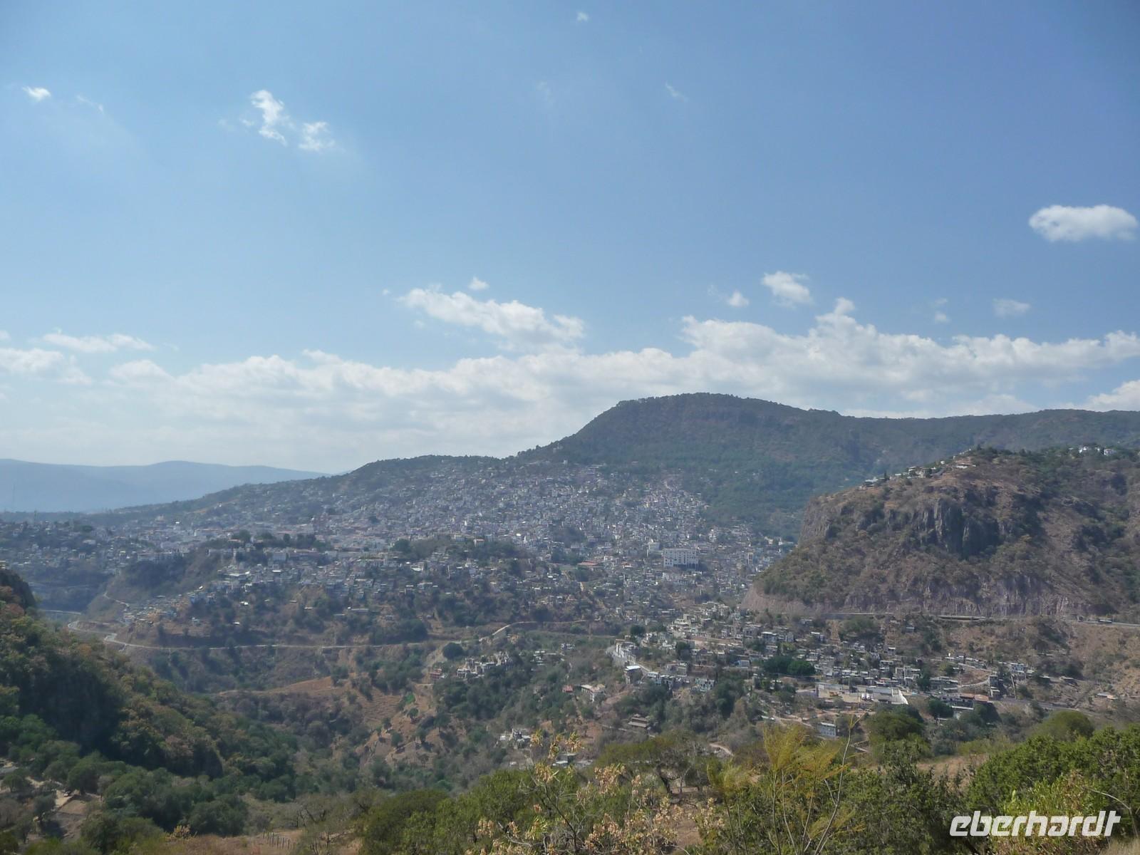 Anschließend fuhren wir nach Taxco. Ein kleiner, hübscher Ort mit kleinen Plätzen und Gassen, der sich malerisch an die Hänge der umliegenden Hügel schmiegt. Von dem Restaurant, in welches wir zum Mittagessen eingekehrt sind, genossen wir einen tollen Blick auf die Stadt mit ihren zart lila blühenden Jacaranda-Bäumen. Taxco ist bekannt für ihre Silberschmiedekunst und so blieb es nicht aus, dass wir den Weg in den ein oder anderen Silberladen fanden... Durch die hübschen Gassen spazierten wir hinauf zum kleinen Zócalo und besichtigten die Kirche San Sebastián y Santa Prisca.