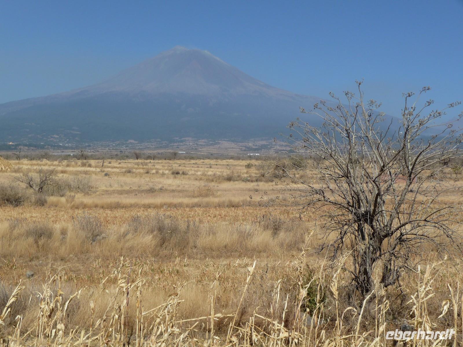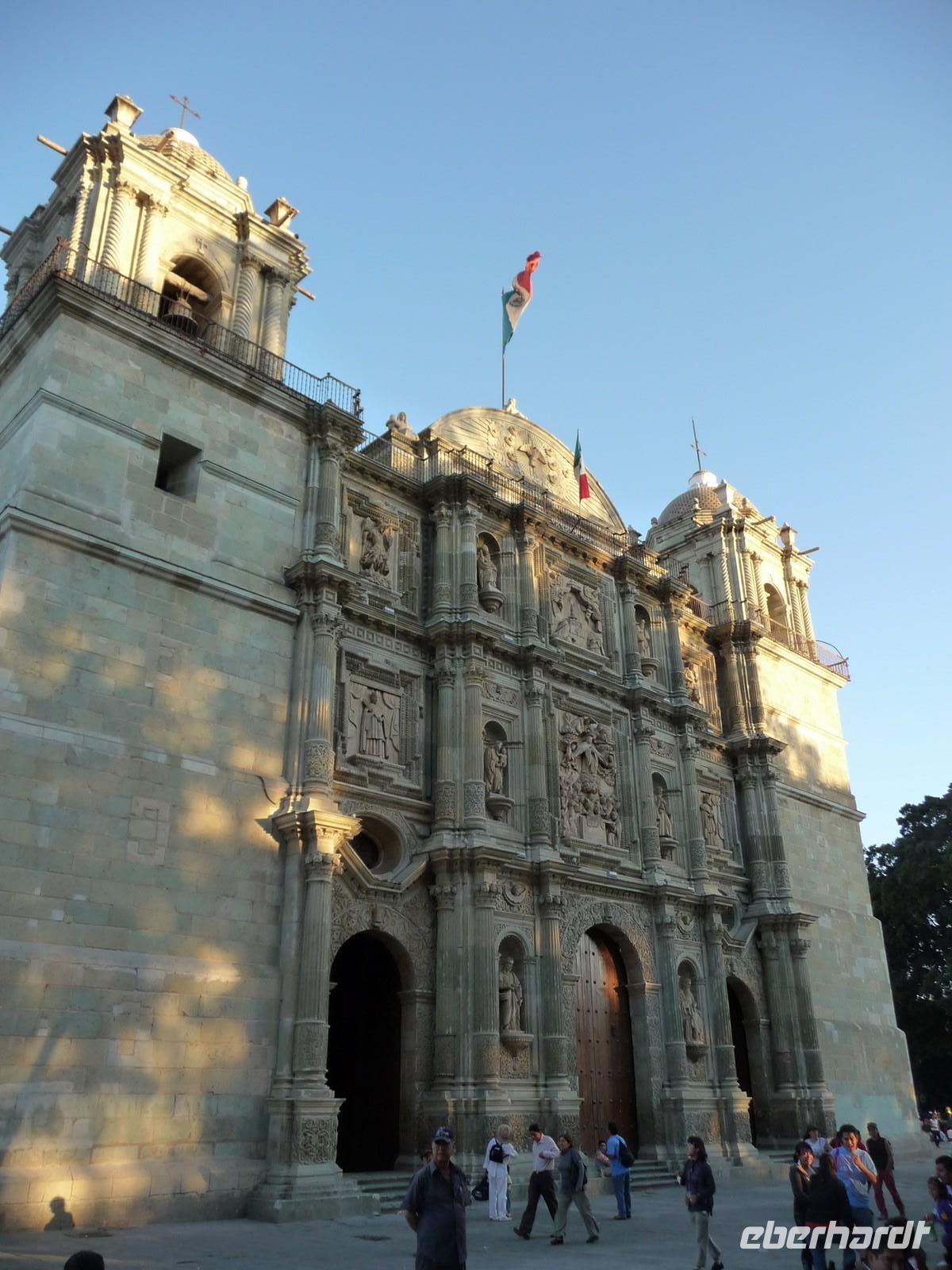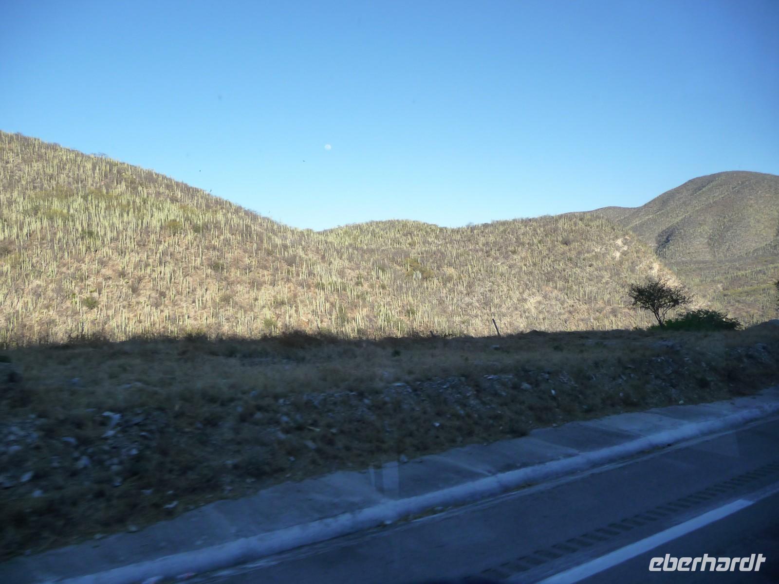 Heute stand uns ein langer Tag bevor, denn wir hatten eine Entfernung von ca. 500 Kilometern bis nach Oaxaca zurückzulegen. Nach ca. zwei Stunden Fahrt legten wir gegen 10:00 Uhr die erste Pause ein - mit traumhaftem Blick auf die Vulkane Popocatépetl und Iztaccihuatl. Die Mittagszeit verbrachten wir in der hübschen Kolonialstadt Puebla, wo wir zunächst den zentralen Platz, den Zócalo, mit der Kathedrale und außerdem die beeindruckende Kirche Santo Domingo besichtigten und anschließend noch etwas Freizeit zum Mittagessen oder Flanieren hatten. Auf der Weiterfahrt nach Oaxaca durchquerten wir traumhaft schöne Berglandschaften und eine Art Biosphärenreservat, in dem Tausende von Kakteen wuchsen. So langsam ging die Sonne unter und gegen 19:00 Uhr erreichten wir unser Ziel. Hier bekamen wir erstmal einen Schreck, denn im Zentrum um den Zócalo lagen überall Trümmer und Steine und die angrenzenden Gebäude waren beschädigt. Später erfuhren wir, dass Felipe Calderón - der Präsident Mexikos - in der Stadt war und es Ausschreitungen von "Gegnern" gegeben hatte. Uns war allen mulmig zu Mute und so verzichteten wir lieber auf einen abendlichen Spaziergang durch die Straßen. Schade eigentlich, denn das Hotel hatte eine tolle zentrale Lage, ideal für einen abendlichen Bummel...