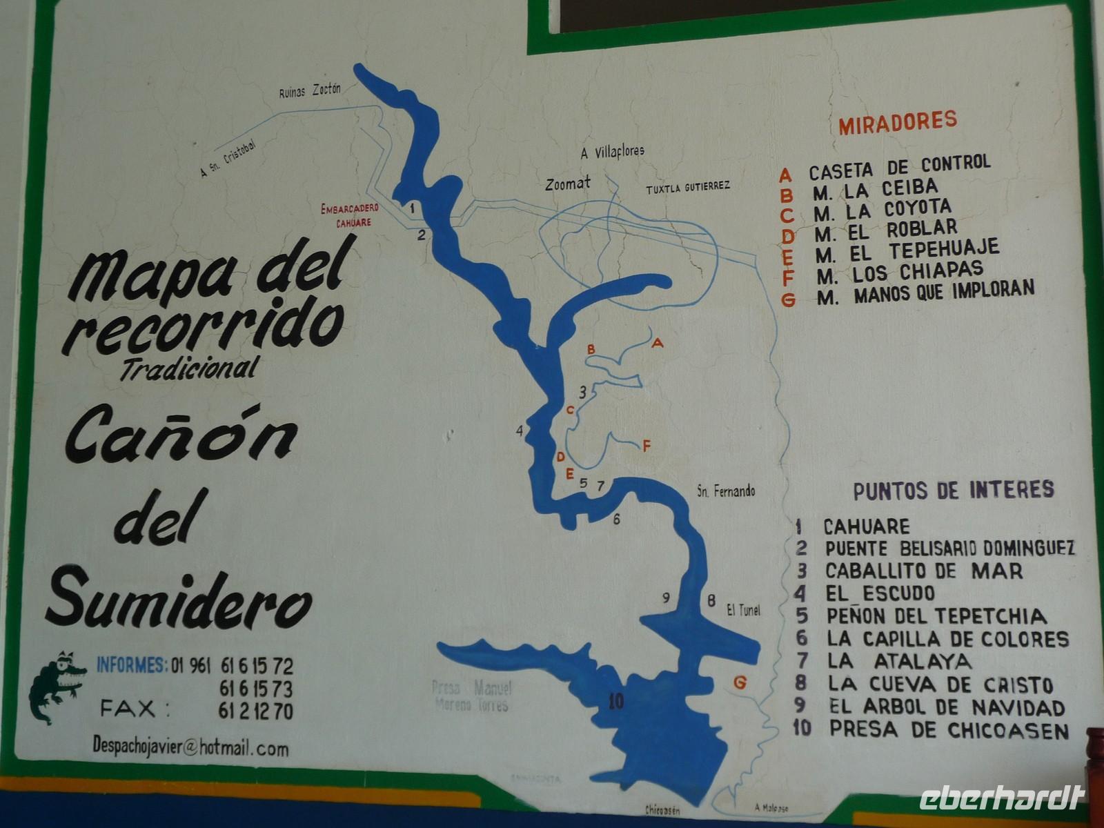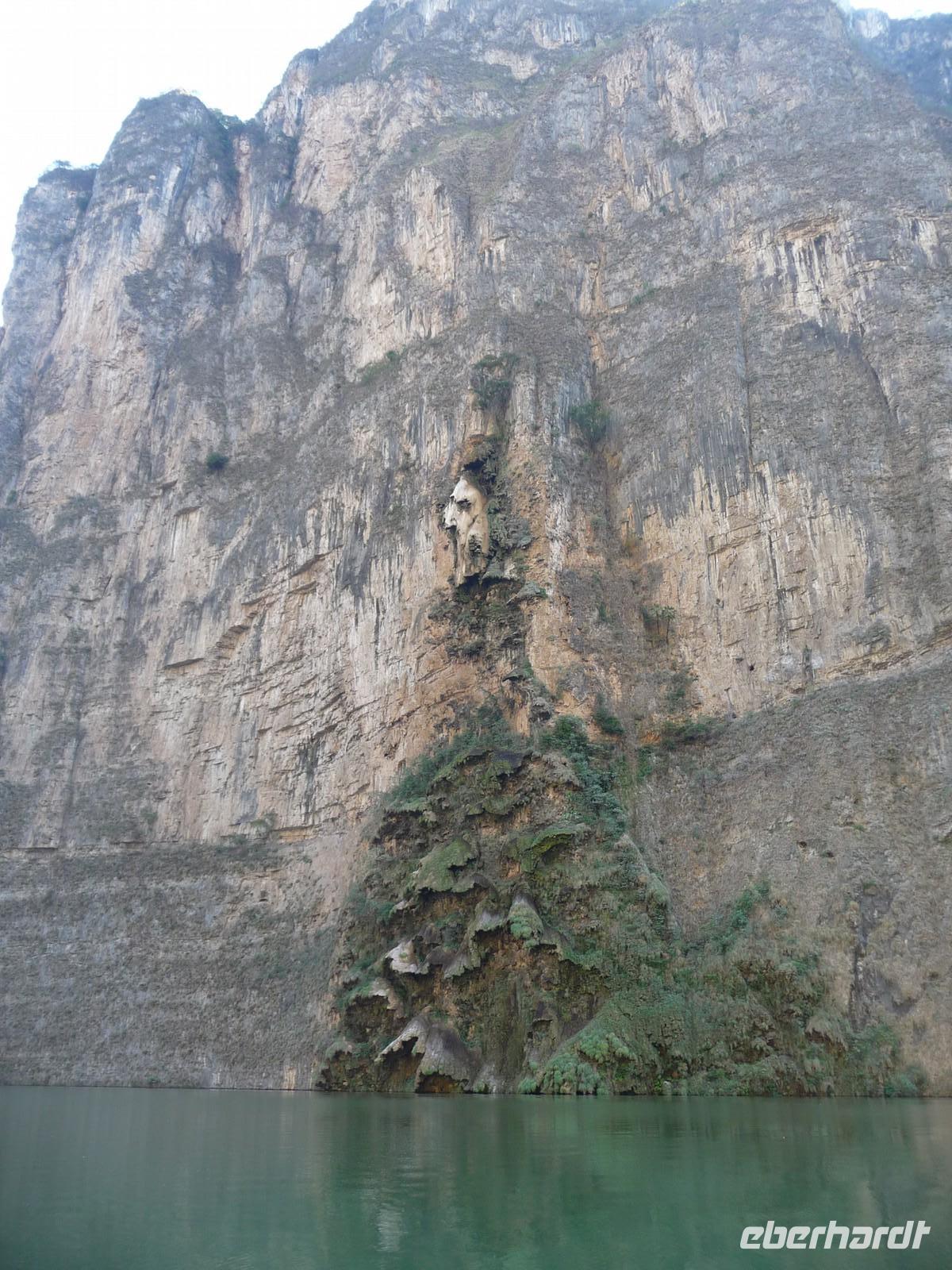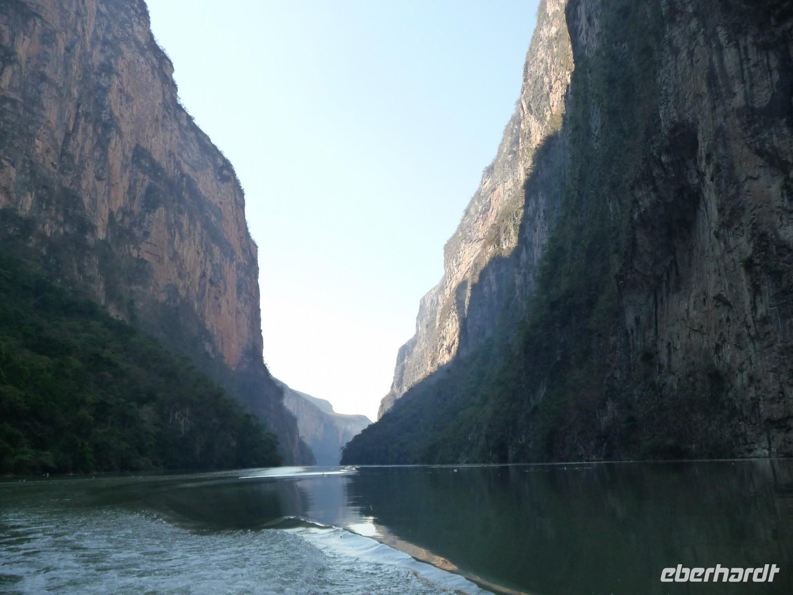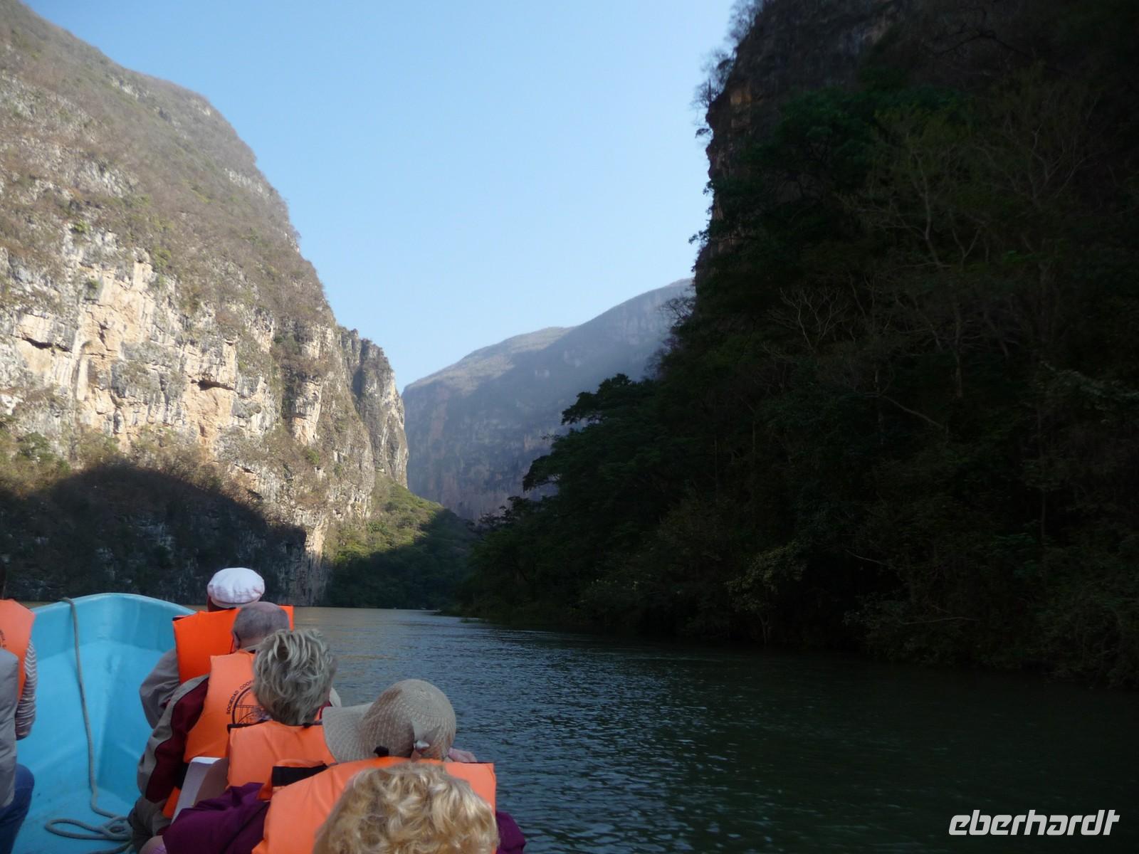 Am Vormittag unternahmen wir einen gradiosen Ausflug mit dem Motorboot auf dem Grijalva Fluss durch die Sumidero-Schlucht, deren Felswände teilweise bis zu 1200m senkrecht in die Höhe ragen. Während der Fahrt, die etwa 1,5 Stunden dauerte, entdeckten wir Eisvögel, Kormorane, Reiher und sogar sich sonnende Krokodile. Außerdem machte uns der Fahrer auf einige besondere Felsformationen, wie zum Beispiel den "Weihnachtsbaum", eine mit Moos bewachsene Felswand, aufmerksam.