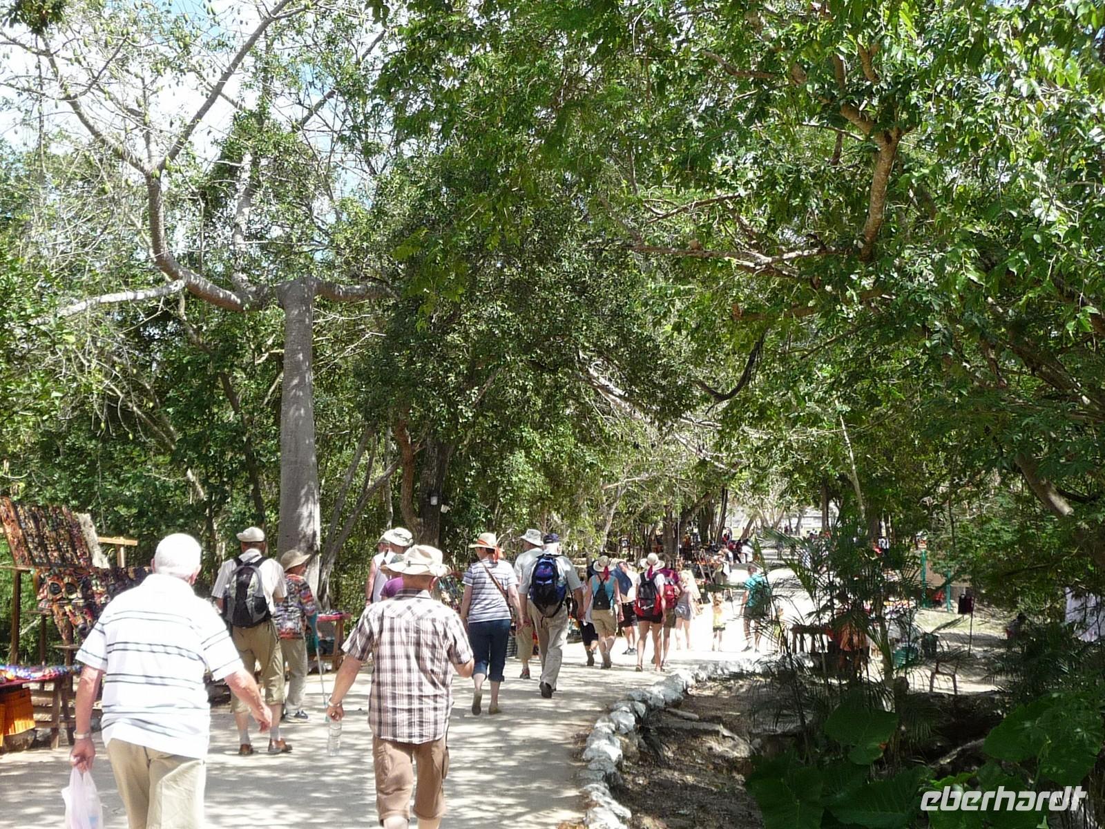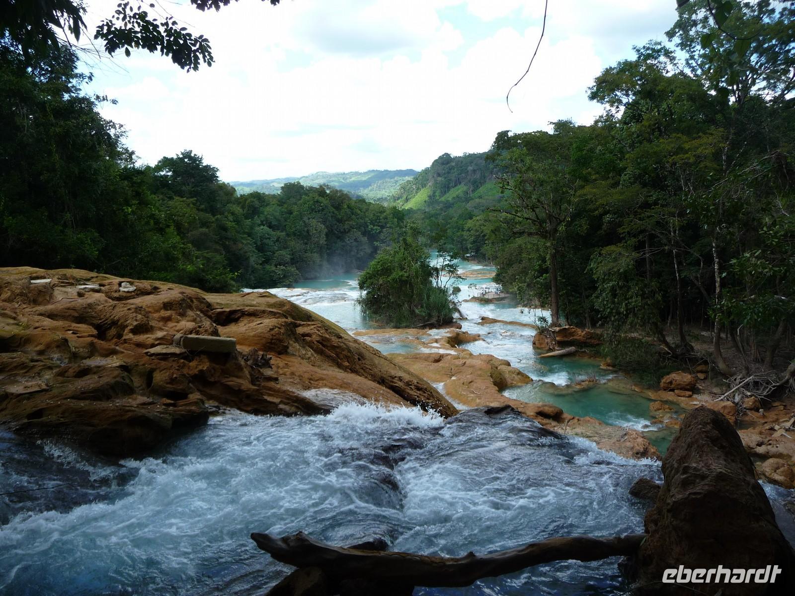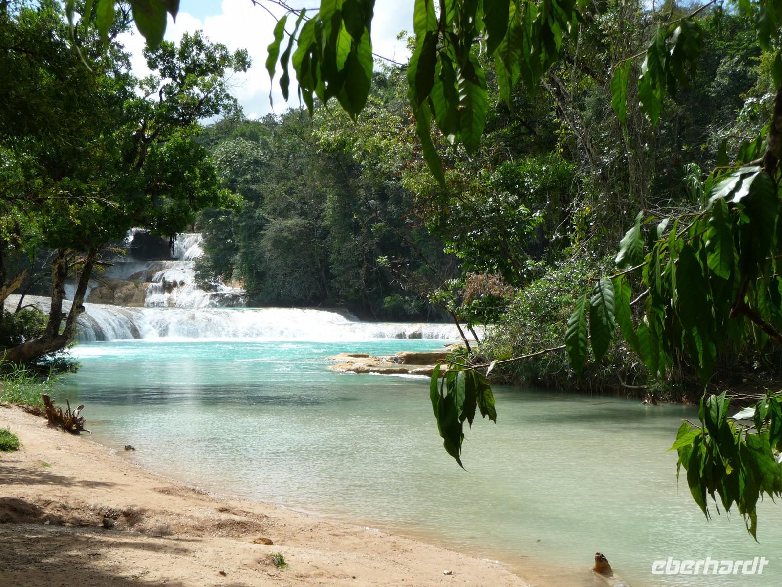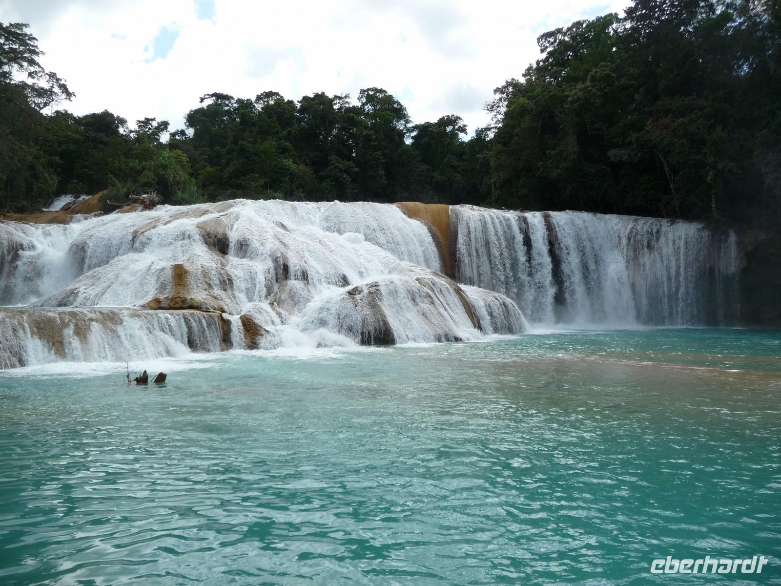 Am Morgen verließen wir San Cristóbal de las Casas und einige Serpentinen später erreichten wir am Mittag den Dschungel und die Wasserfälle von Agua Azul. Die türkisblaue Wasserfarbe gab ihnen diesen Namen. Zwischen den breiten herabstürzenden Kaskaden bildet es mehrere natürliche Becken, in denen man auch baden kann (auf eigene Gefahr ). Nach Palenque war es nun nicht mehr allzu weit - am späten Nachmittag kamen wir in unserem Hotel an und die Gästen waren froh, noch ein wenig ausruhen oder die Annehmlichkeiten des Hotels (Pool) genießen zu können.