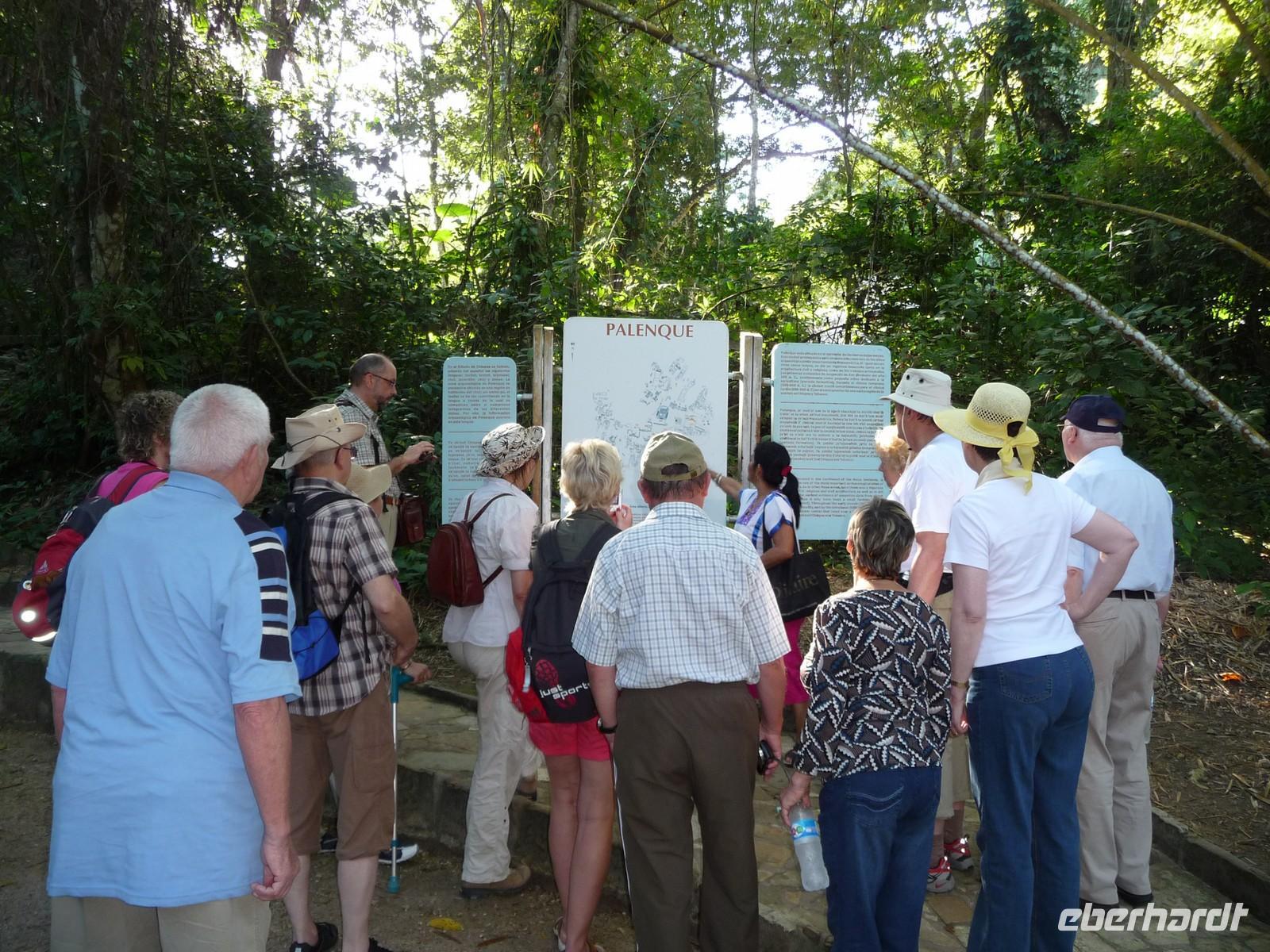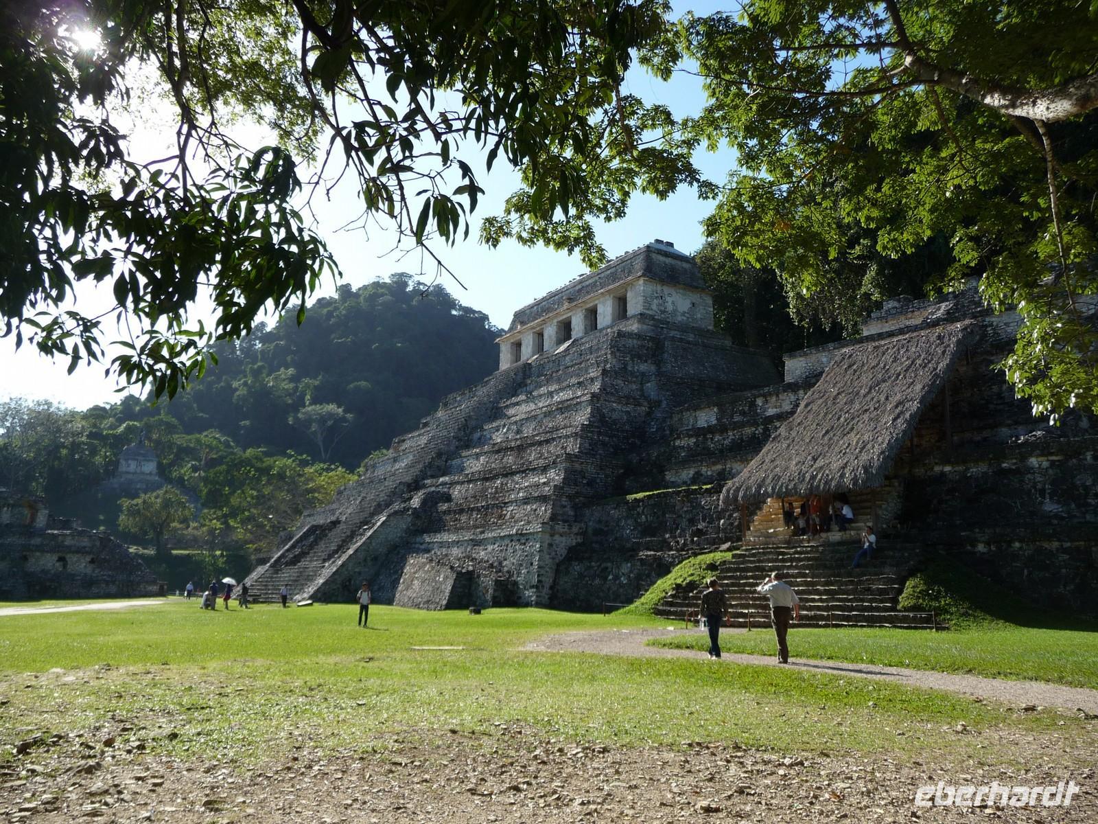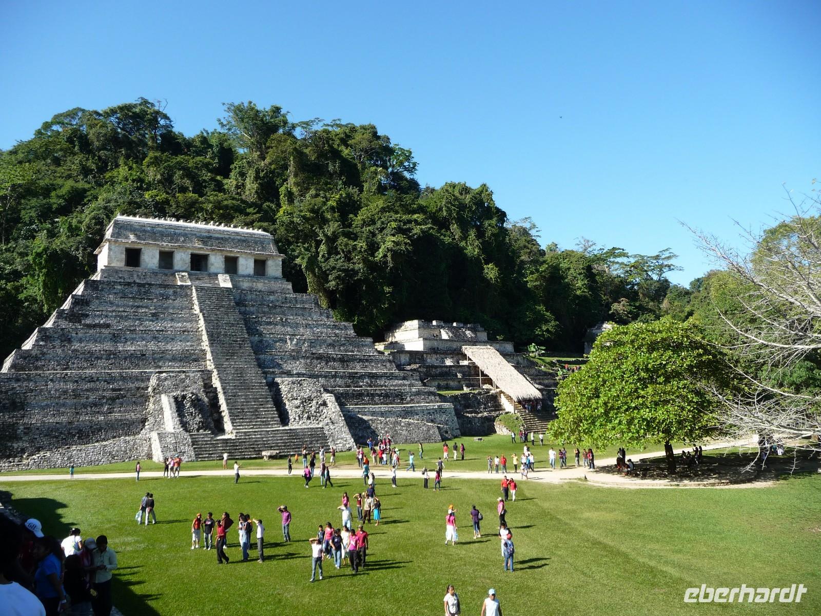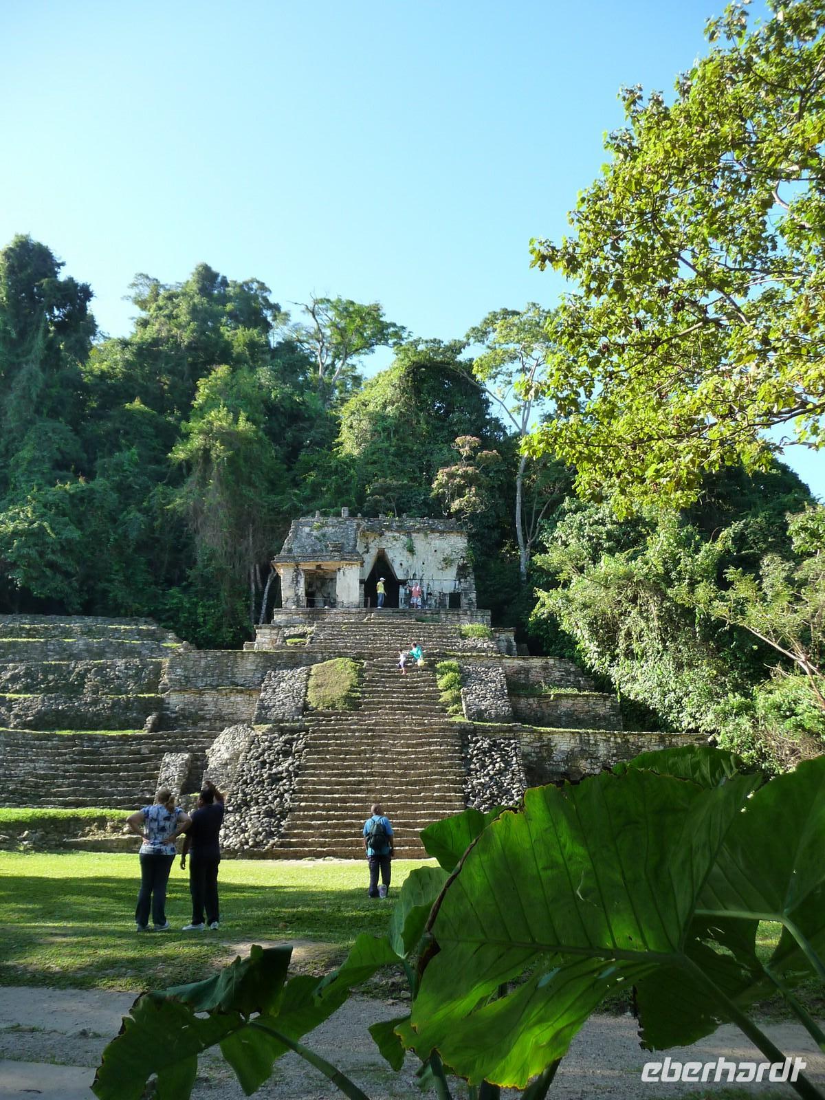 Der Vormittag dieses Tages war der Besichtigung der Ruinenanlage von Palenque gewidmet. Diese war eine der bedeutendsten Hauptstädte der Maya-Kultur. Wir konnten kaum fassen, wie sie hier mitten im Dschungel eine solch große Anlage errichten konnten. Rätselhaft ist auch, warum die Maya Palenque im 9. Jahrhundert verlassen hatten. Somit war die Anlage dem Verfall geweiht und der Überwucherung durch den Urwald schutzlos ausgeliefert. Ein umso größeres Wunder ist es eigentlich, dass die Anlagen wiederentdeckt wurden und uns heute so gut zugänglich sind. Bis auf die Pyramide der Inschriften, in dem man das Grab des ehemaligen Herrschers Pacal fand, darf man alle Gebäude besteigen. Tun Sie dies unbedingt bei der Pyramide des Kreuzes, den von hier hat man einen tollen Blick über die Anlage!