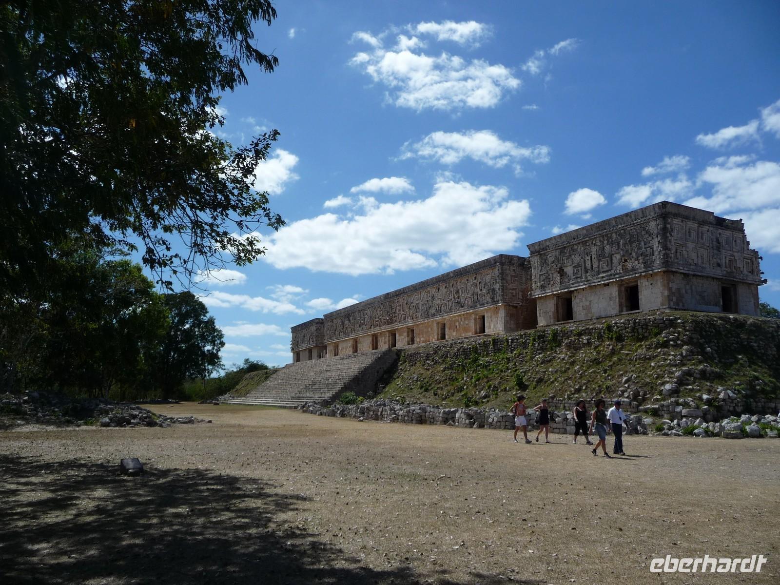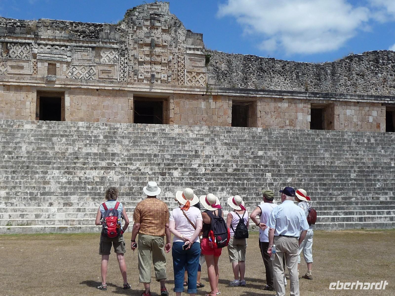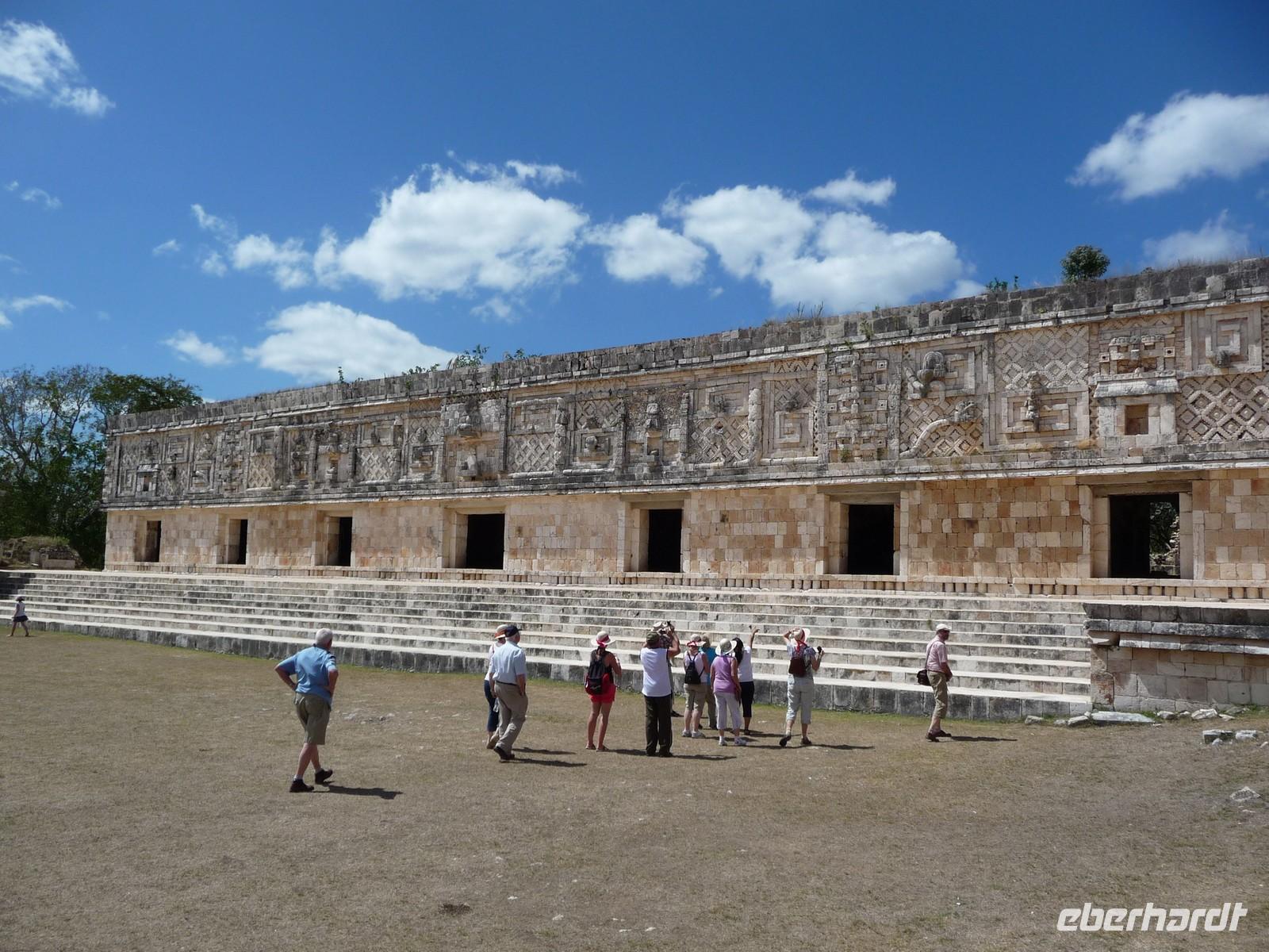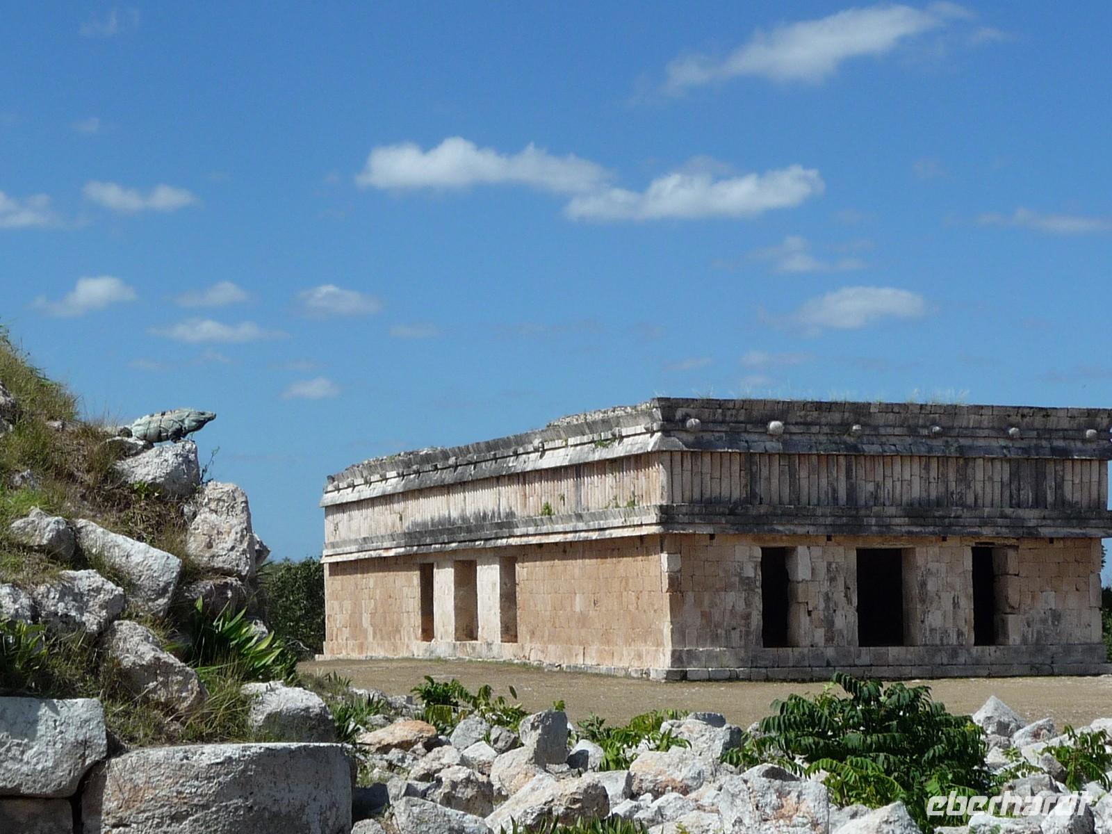 Über die Mittagszeit besichtigten wir die Ruinenstätte Uxmal, eine weitere bedeutende Anlage der Maya. Besonders beindruckt waren wir hier von der ovalen "Pyramide des Zauberers", die der Sage nach von einem Zwerg in nur einer Nacht erbaut worden sein soll, vom Nonnenviereck mit seinen wunderschönen, kunstvollen Reliefs und von der Vollkommenheit des Gouverneurspalastes. Interessant war auch, dass in der Anlage derart viele Leguane unterwegs waren, dass man schon aufpassen musste, nicht ausversehen über sie zu stolpern, während man gerade nach oben schaut und die Pyramiden bestaunt .