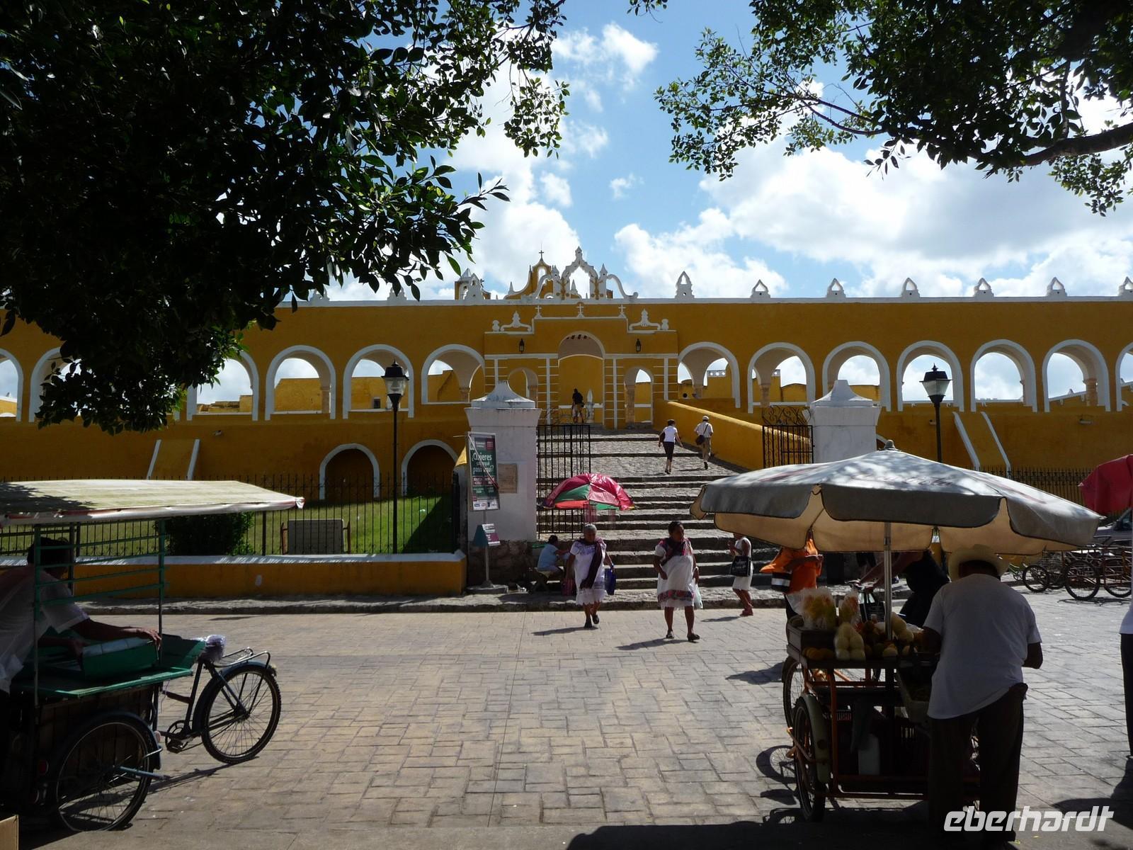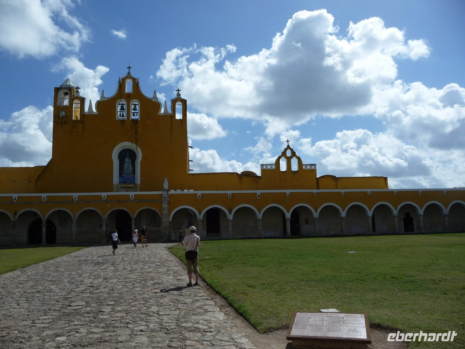 Bevor wir unsere Reise durch Yucatan fortsetzten, schauten wir uns die Altstadt und den Prachtboulevard Paseo Montejo noch einmal im Hellen an. Auf der Weiterfahrt machten wir Halt in der kleinen Stadt Izamal, der Häuser vorwiegend in gelb gestrichen sind und warfen einen Blick in das Franziskanerkloster San Antonio de Padua. Dessen riesiges Atrium soll nach dem Petersplatz in Rom angeblich das zweitgrößte der Welt sein.