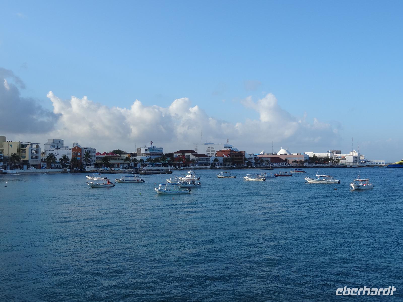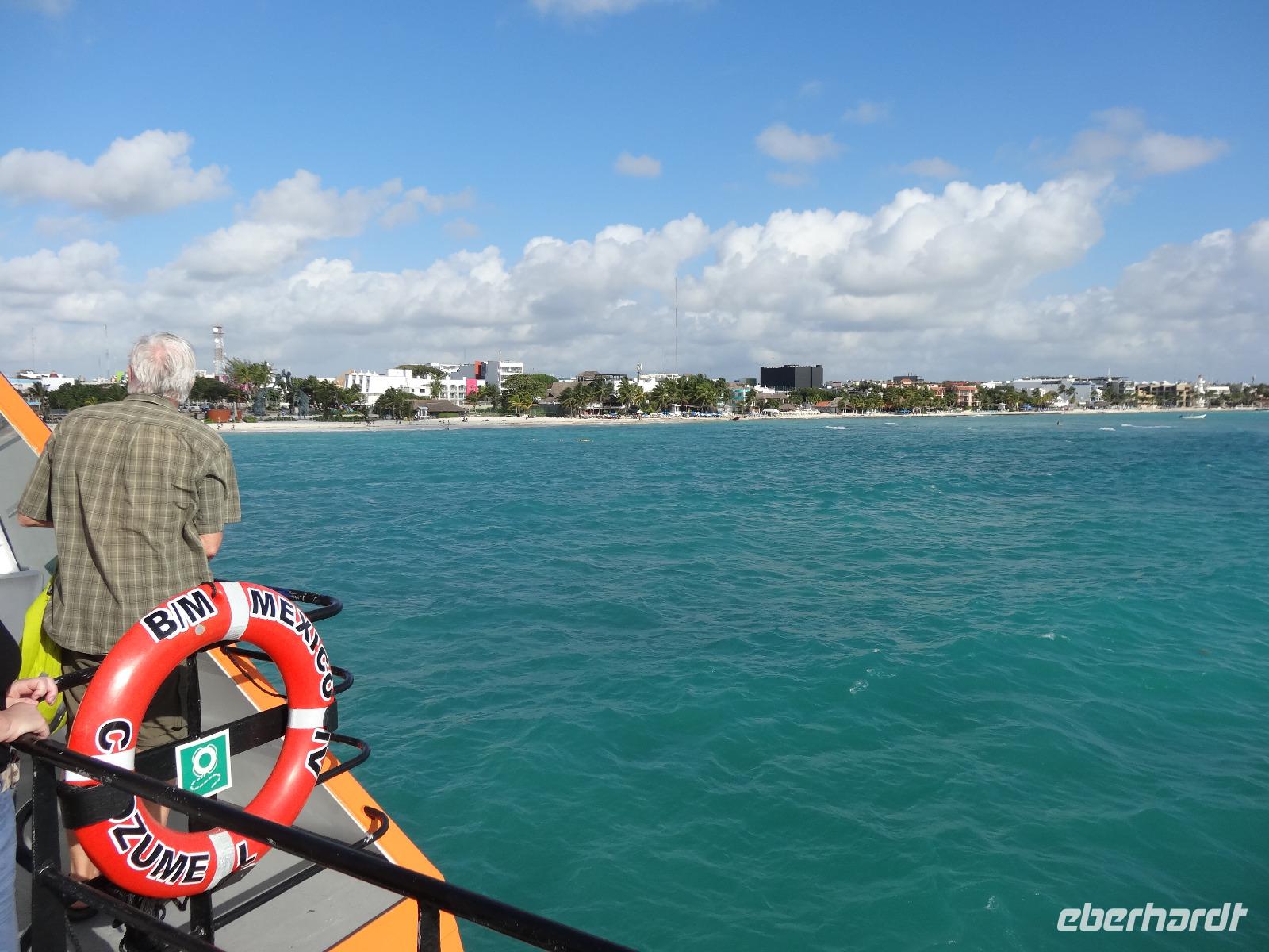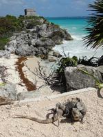 Heute liegen nur zwei Schiffe vor Anker in San Miguel de Cozumel. Nachdem wir das labyrinthartige Hafenterminal durchquert haben, absolut zu Gunsten der Souvenirshops angelegt, treffen wir auf unseren freundlichen mexikanischen Reiseleiter Juan Carlos. Wir machen entlang der Promenade einen Spaziergang zum nahe gelegenen Fähranleger und nehmen 9.00 Uhr die Fähre nach Playa del Carmen. 45 Minuten dauert die von leichtem Wellengang begleitete Überfahrt aufs Festland an die Riviera Maya. Wir laufen durch das touristische Zentrum zu unserem Reisebus. Dieser hat für mittelamerikanische Verhältnisse einen sehr guten Standard. Nach einer knappen Stunde Fahrzeit erreichen wir Tulum. Bei der Anzahl an Reisebussen auf dem Parkplatz erwarten wir eigentlich eine total überfüllte Maya-Stätte, aber aufgrund seiner Weitläufigkeit werden wir positiv überrascht.